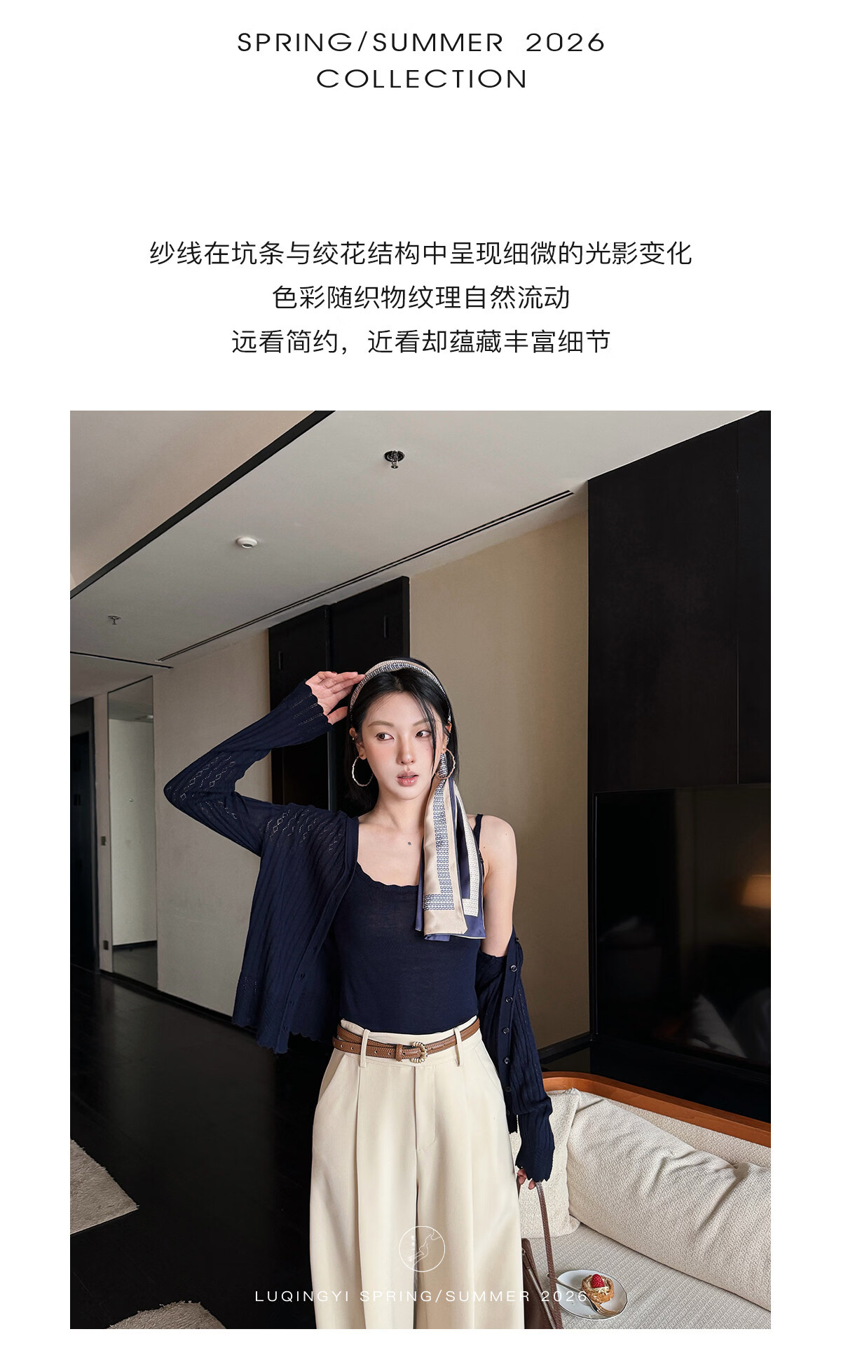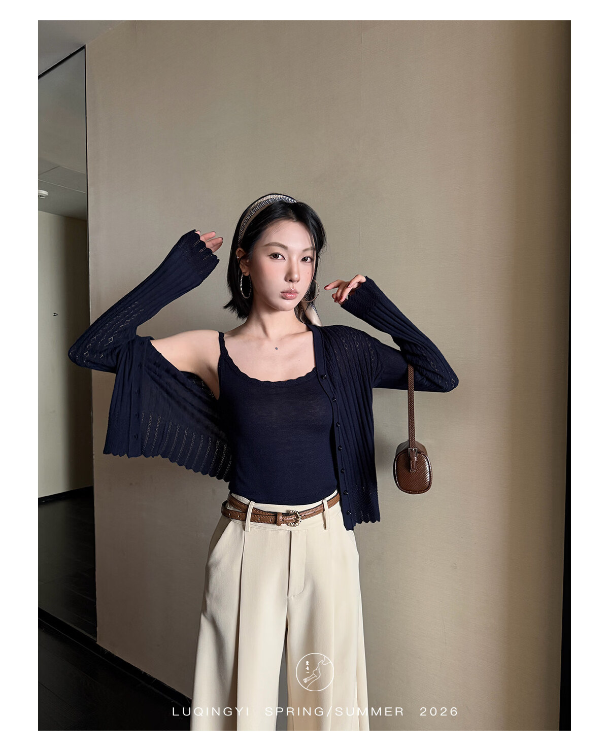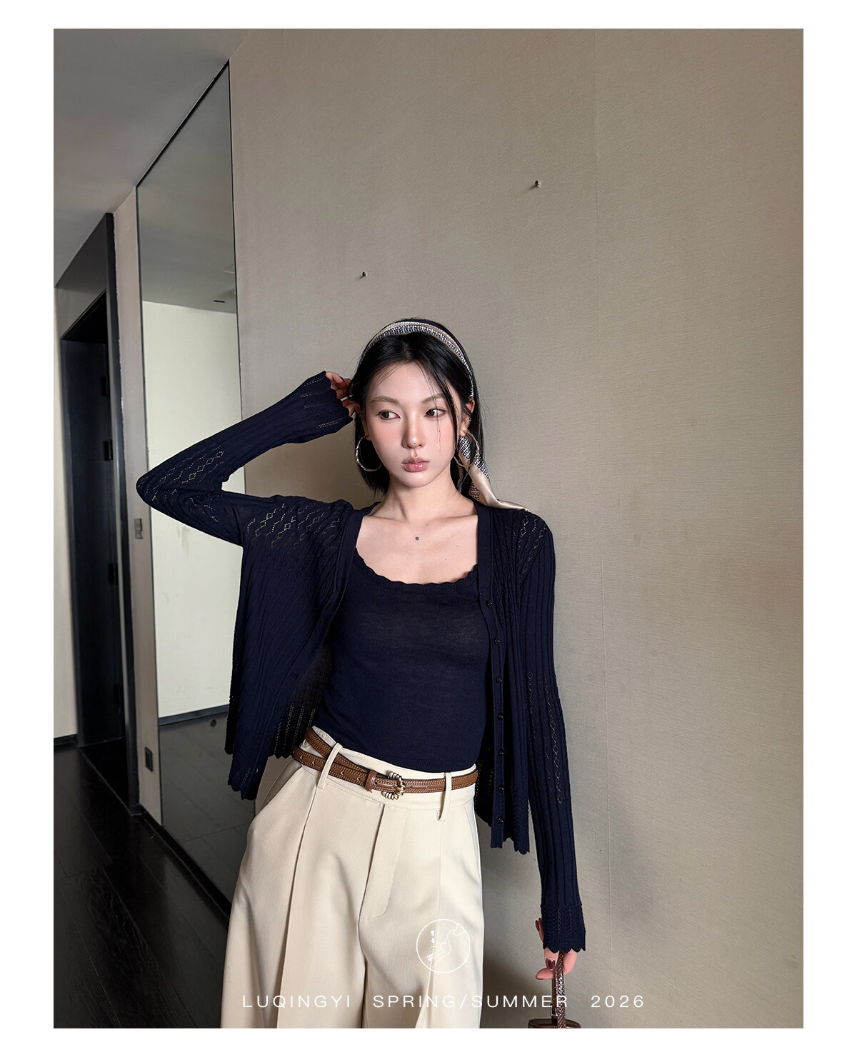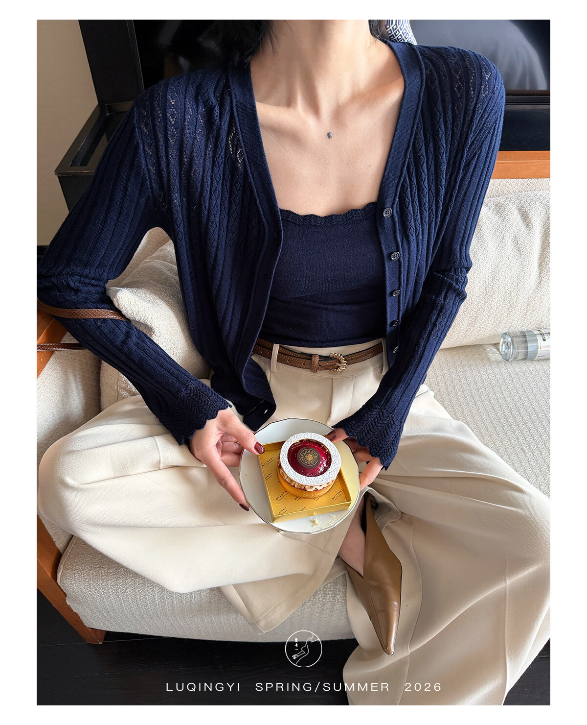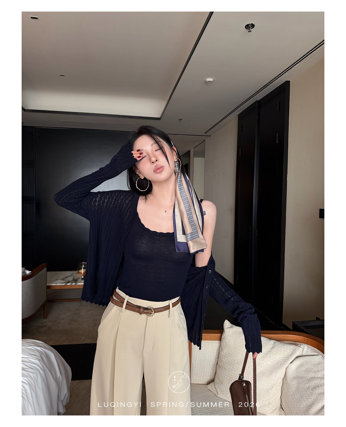 Lu Qingyi original and shy skin-friendly Lyocell knitted cardigan women's spring retro cable hollow camisole navy cardigan S suspender to wear for photos