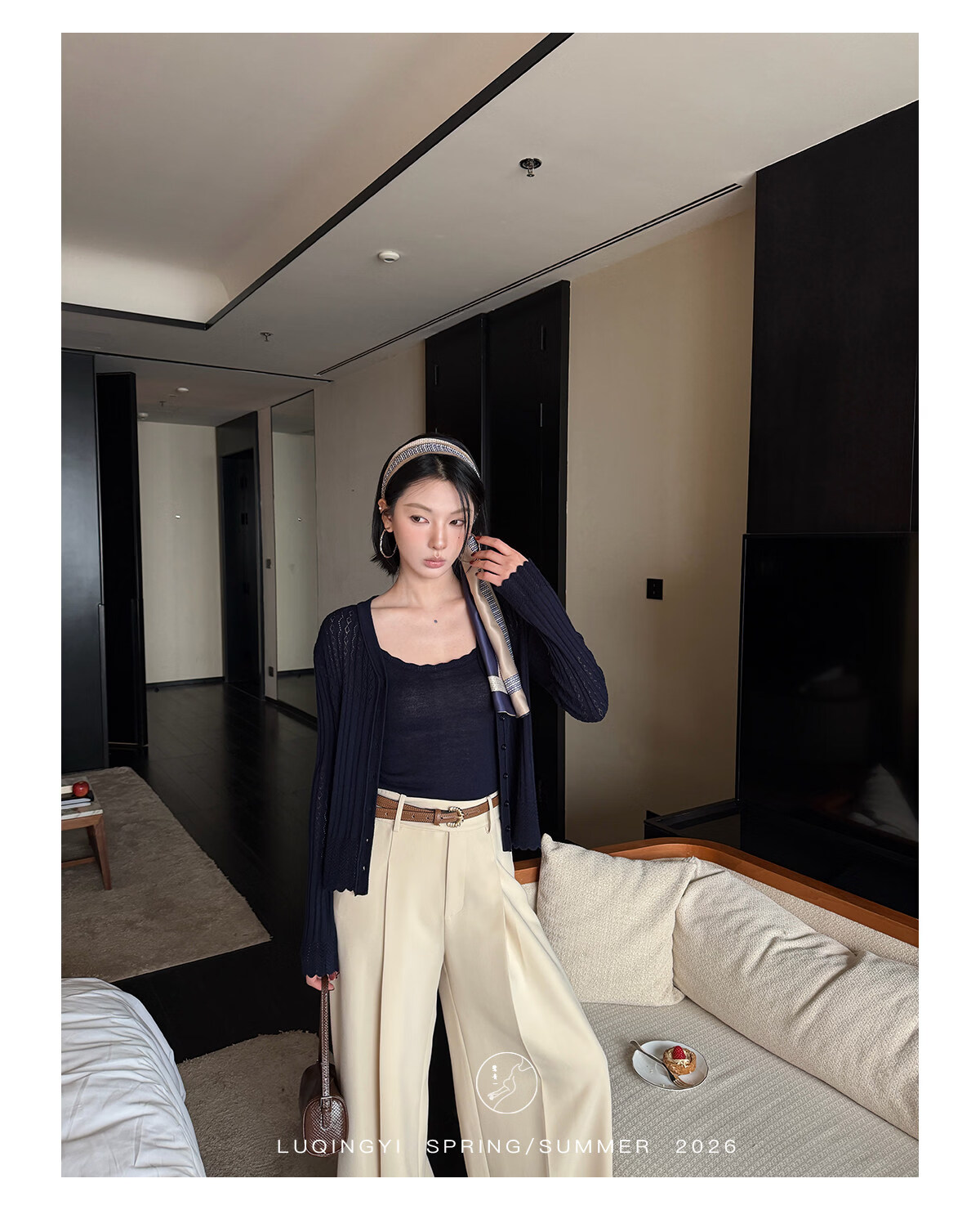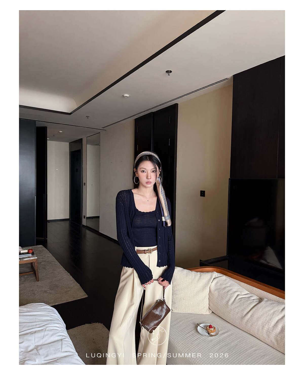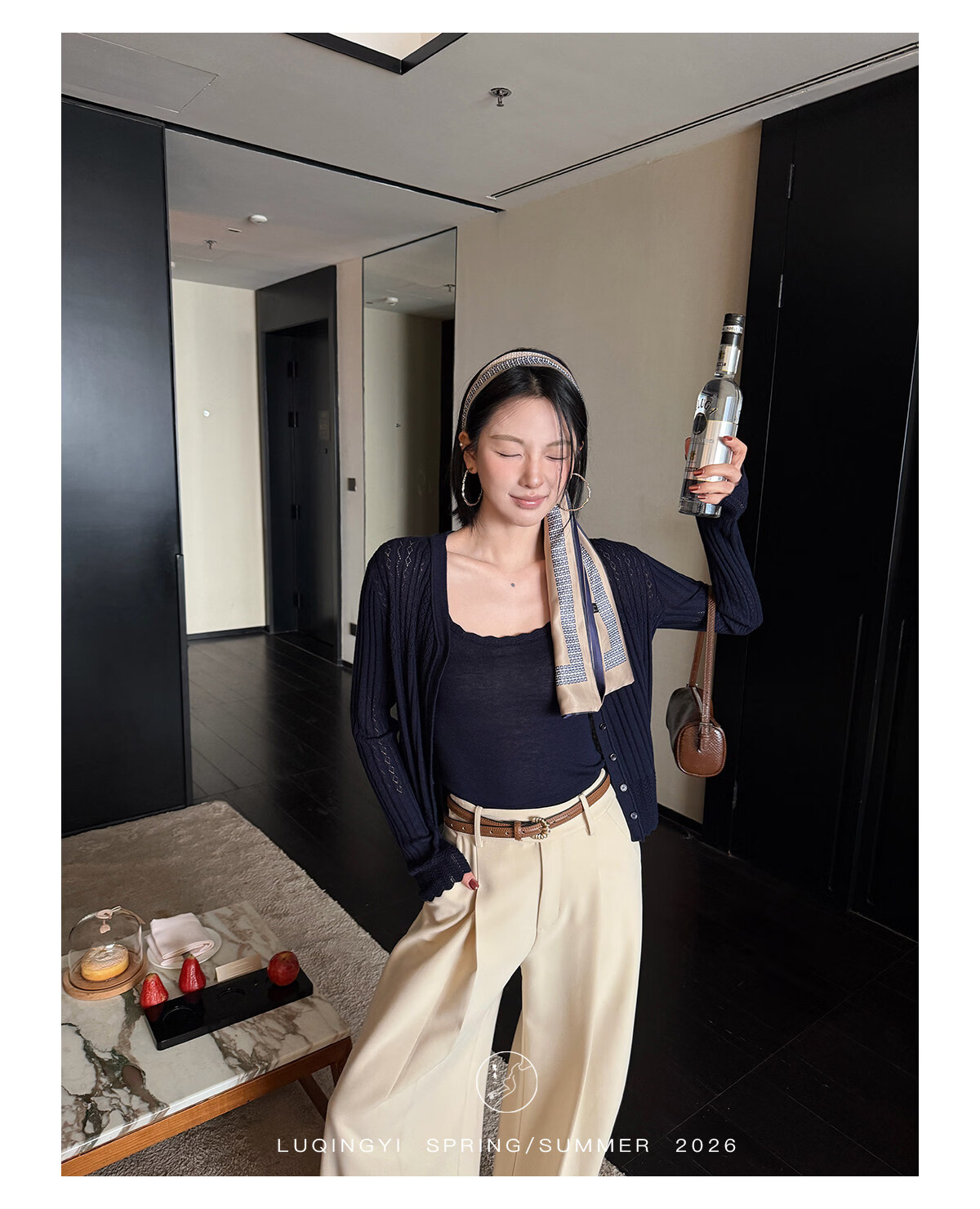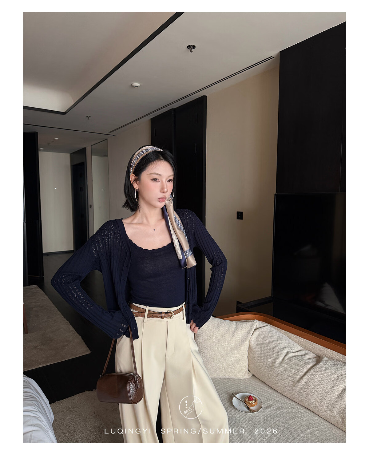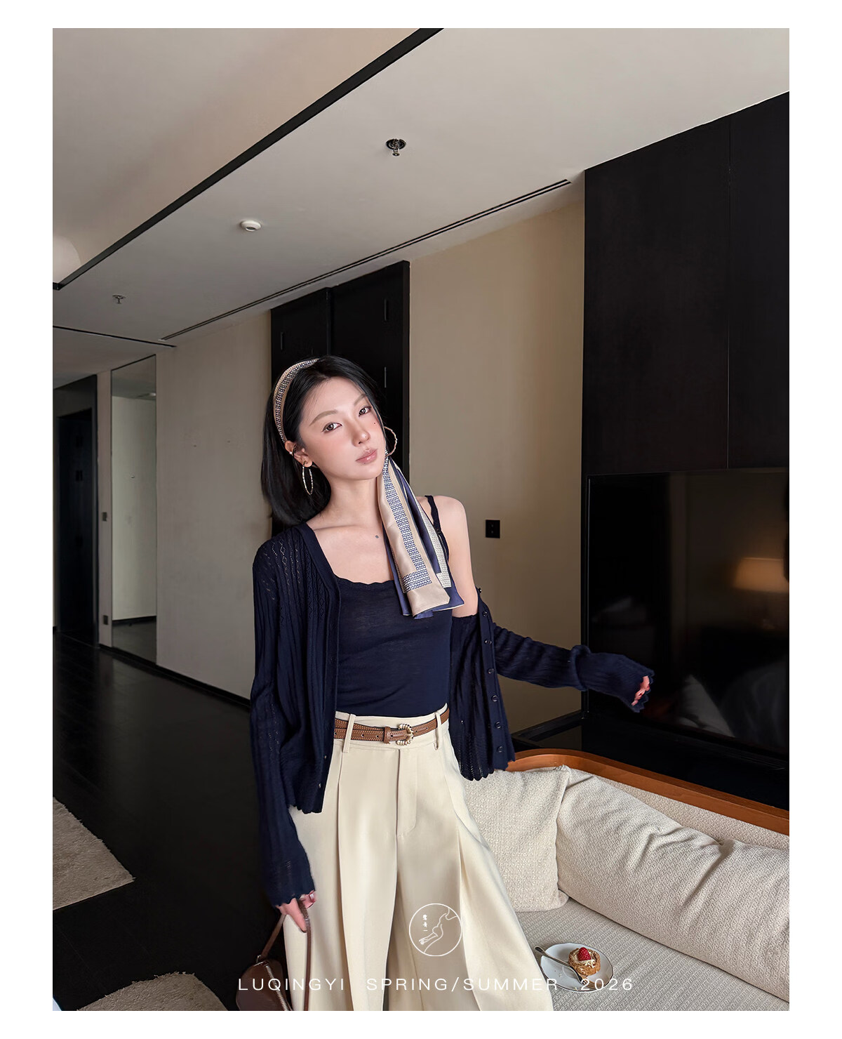Lu Qingyi original and shy skin-friendly Lyocell knitted cardigan women's spring retro cable hollow camisole navy cardigan S suspender to wear for photos