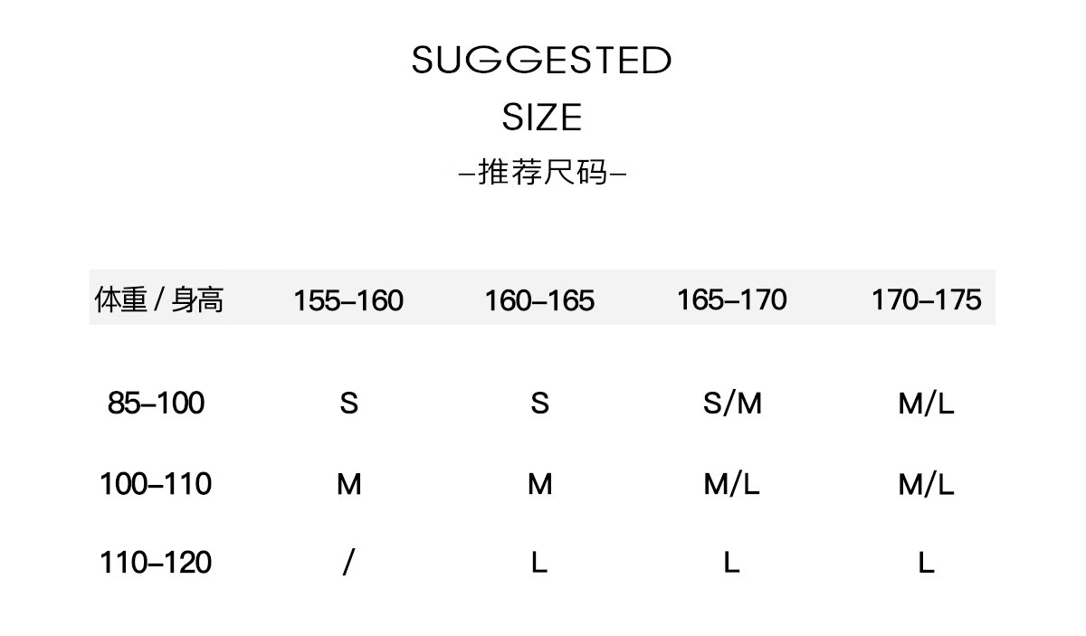 China (cm) 160-165/84-86 165-170 / 88-90 167-172 / 92-96 168-173 / 98-102 170-176 / 106-110