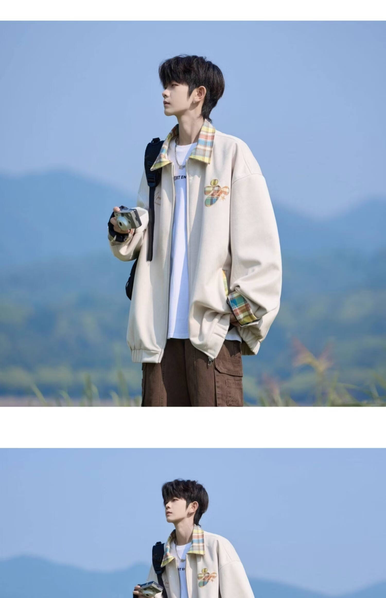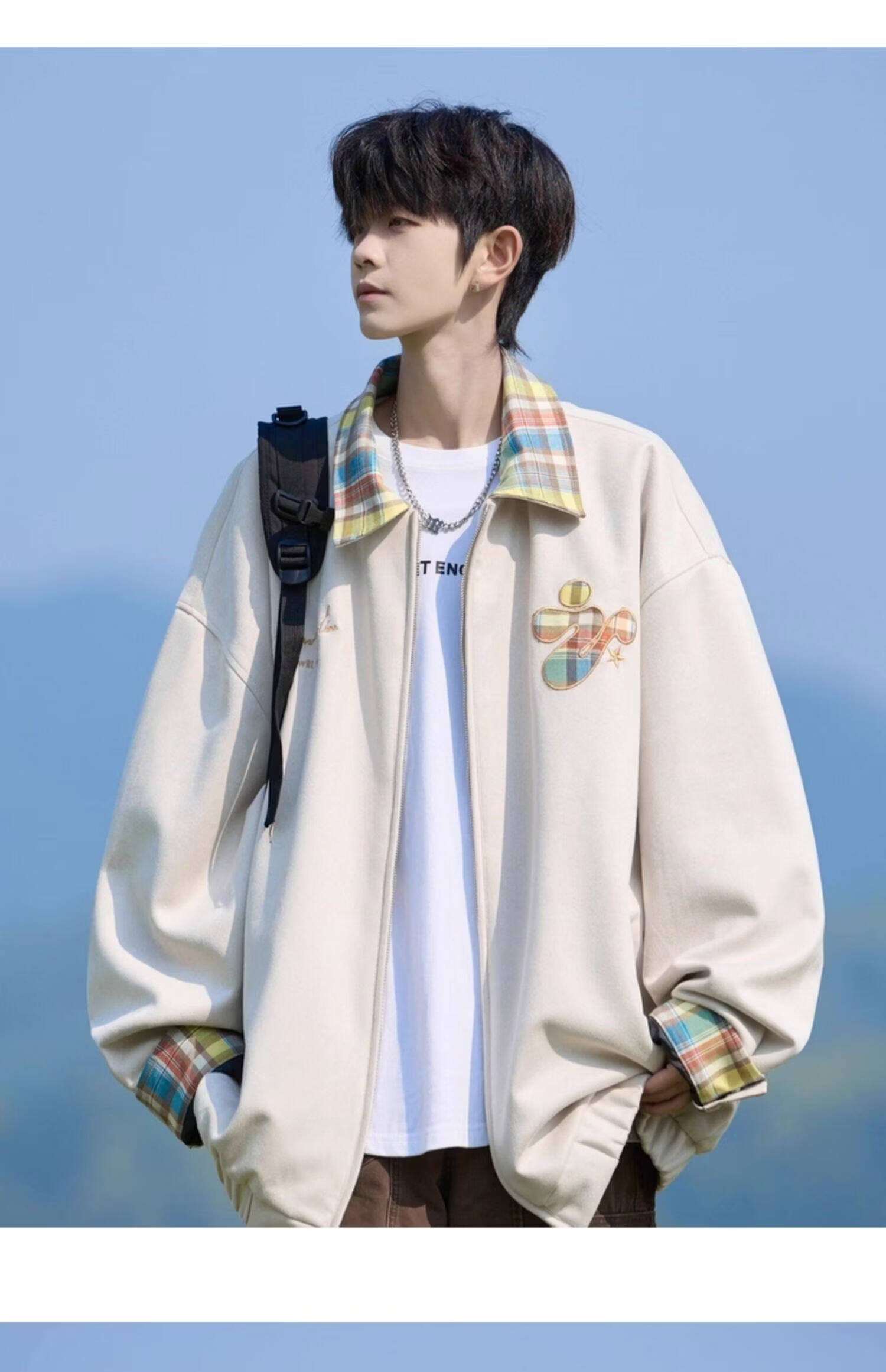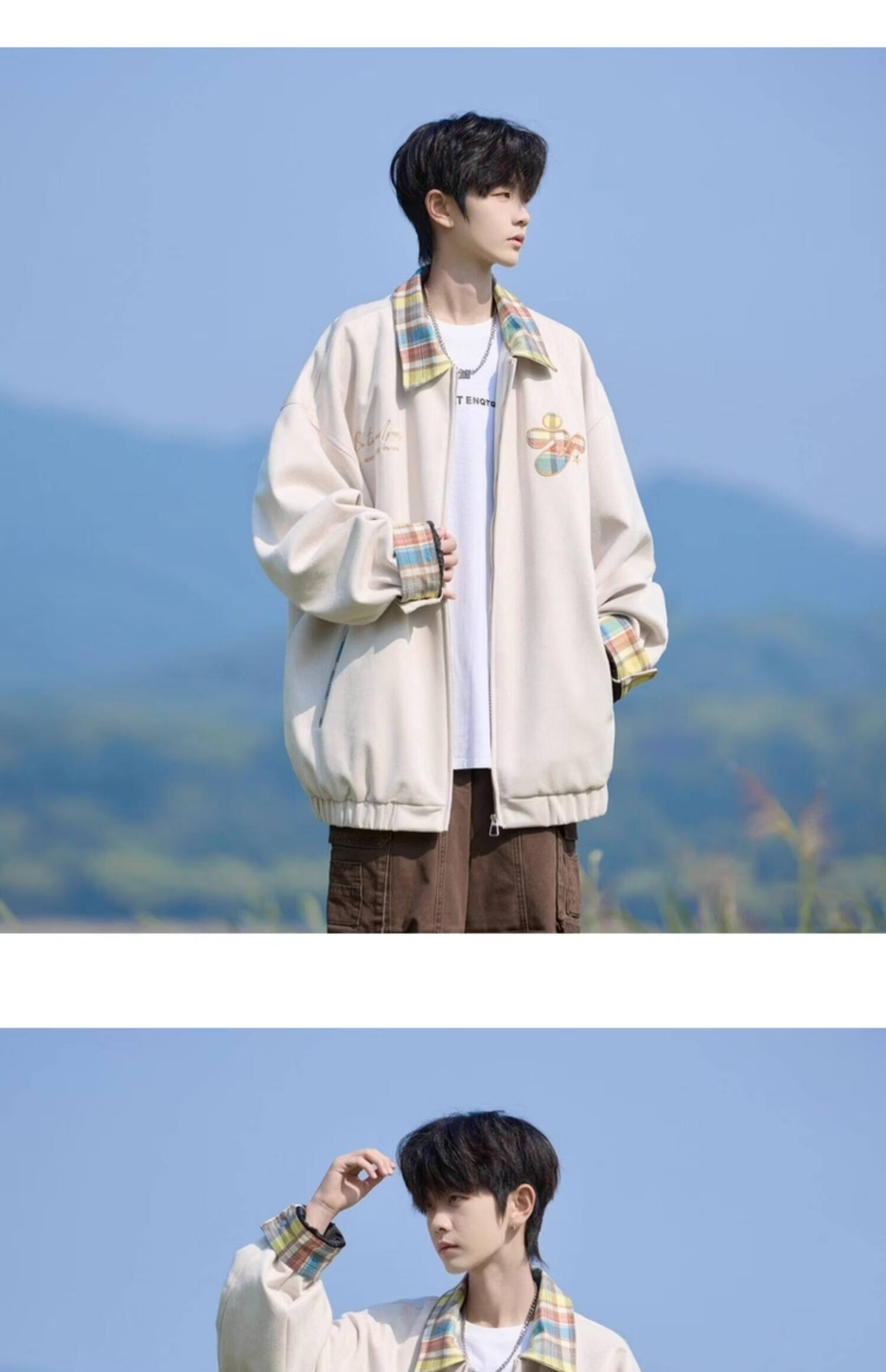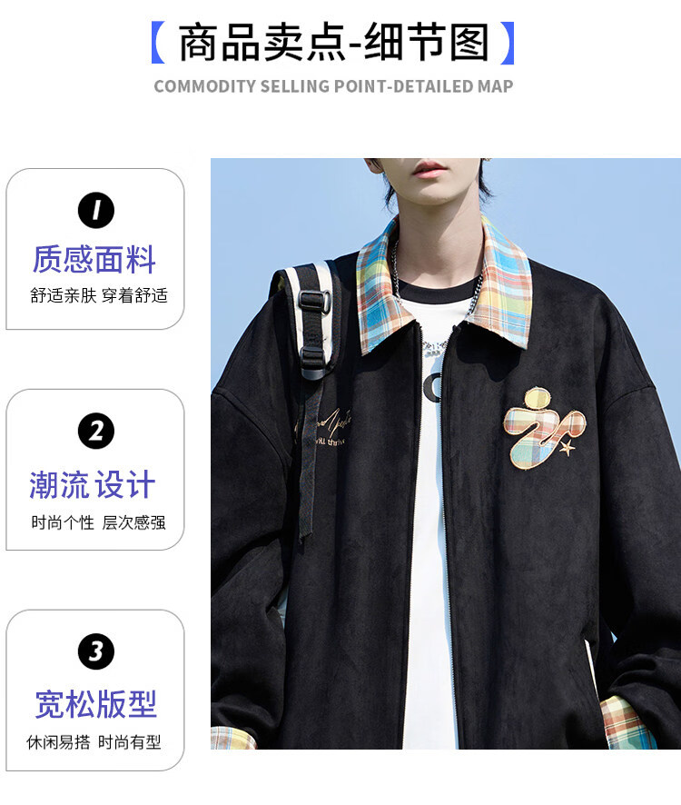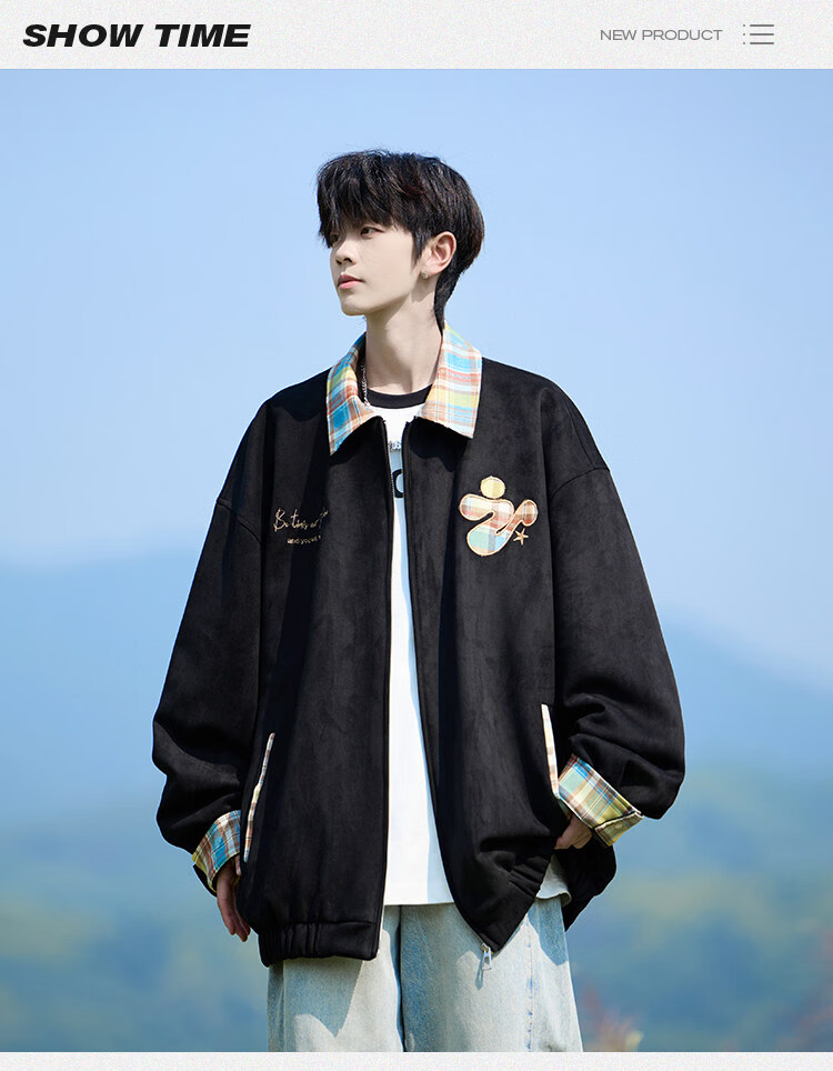 Shelley Jones American dopamine plaid spliced lapel jacket men's spring and autumn new trendy brand loose casual boys' jacket apricot M recommended 80-100Jin Jin equals 0.5 kg