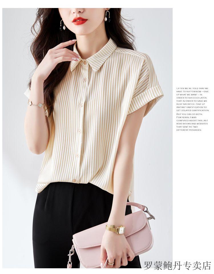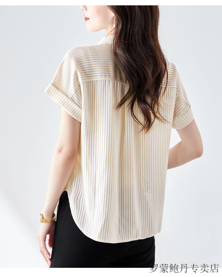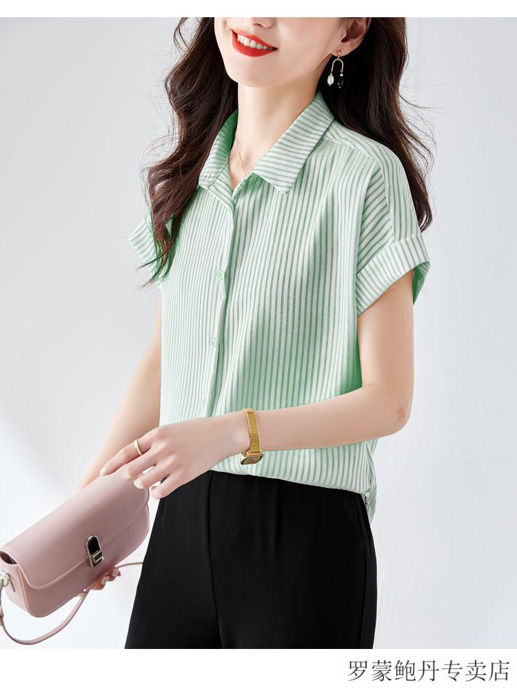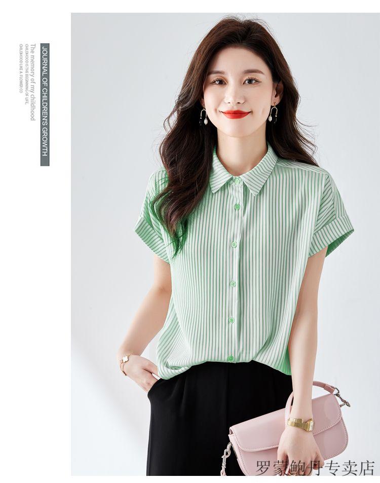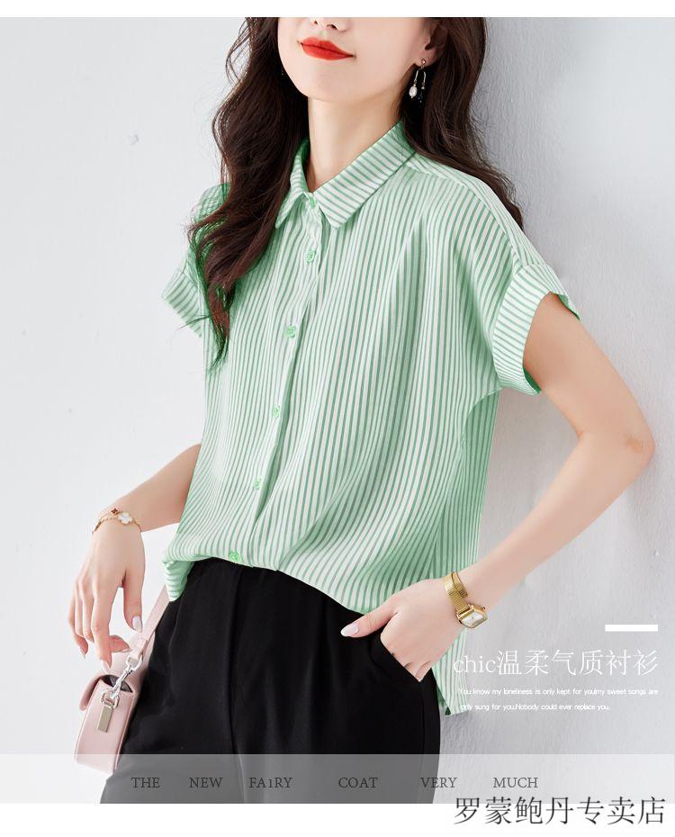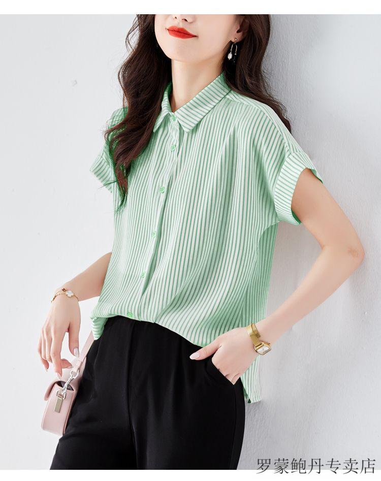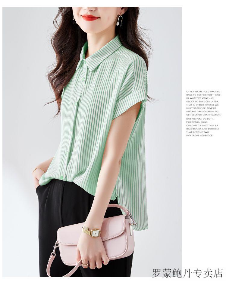 ROMON POLO collar short-sleeved striped chiffon shirt for women summer new fashion style shirt loose belly cover green S