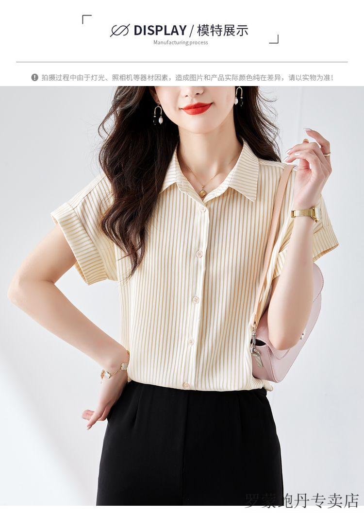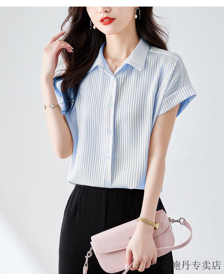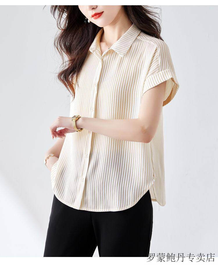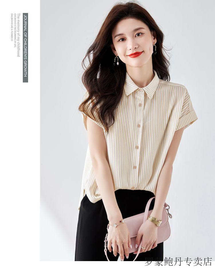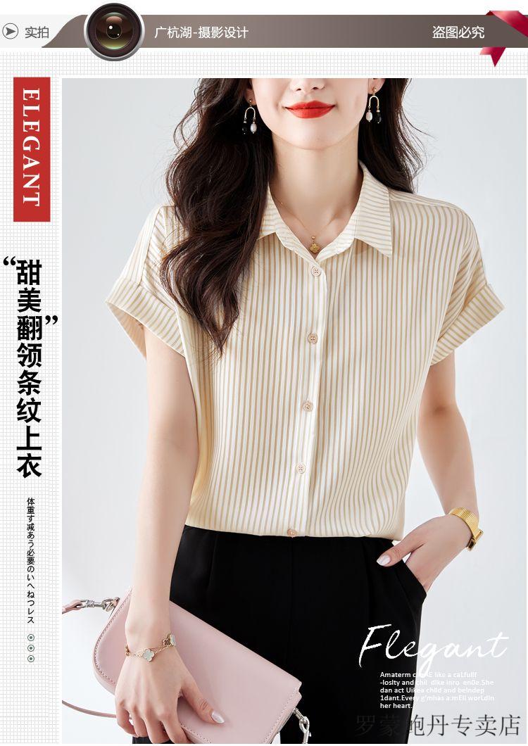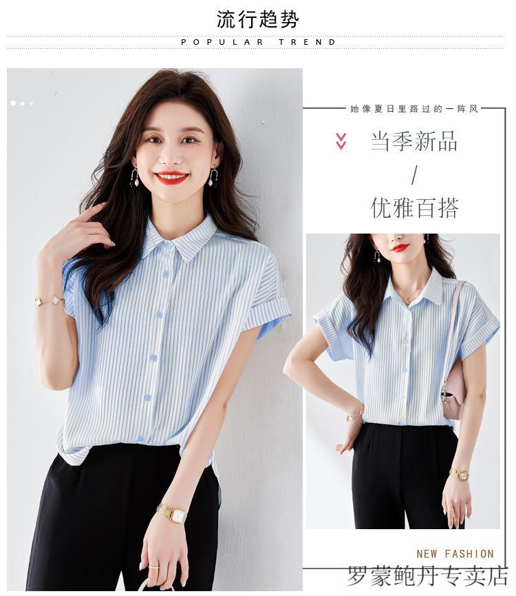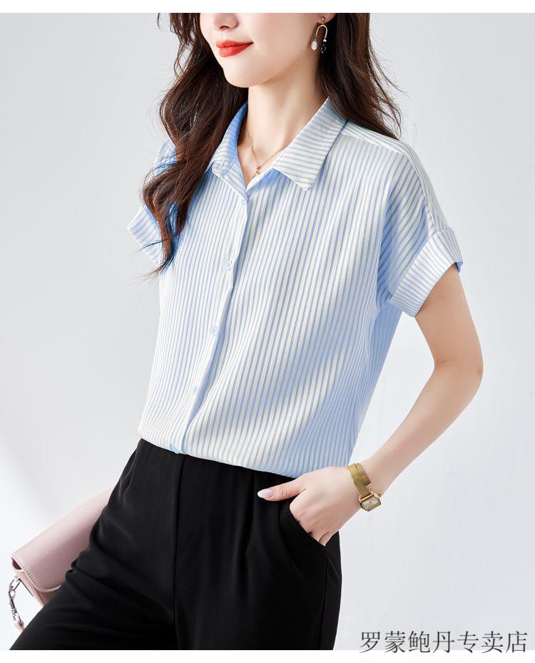 ROMON POLO collar short-sleeved striped chiffon shirt for women summer new fashion style shirt loose belly cover green S