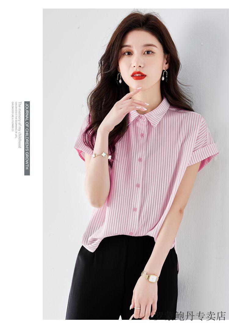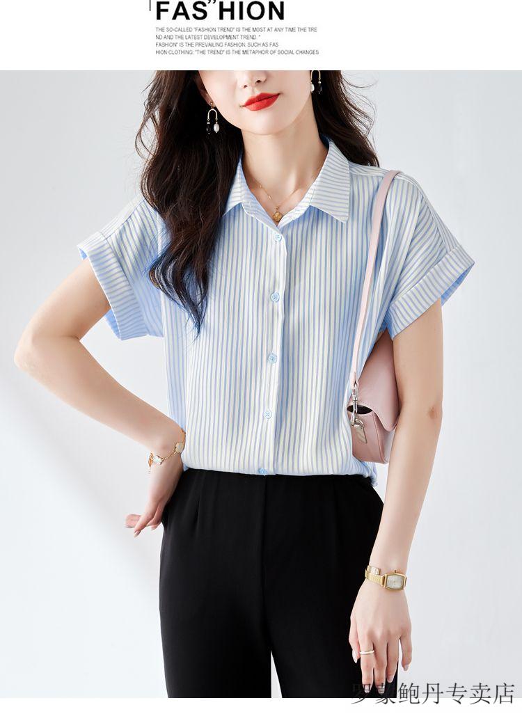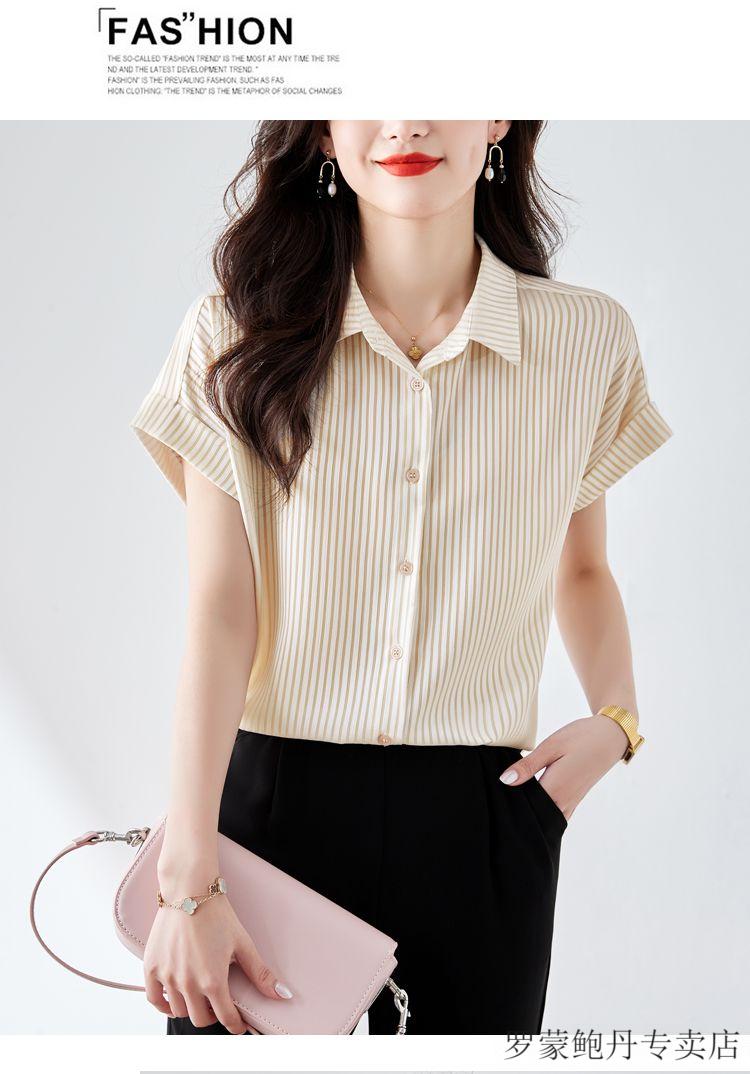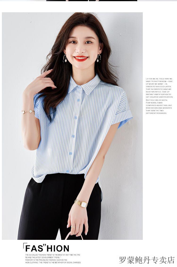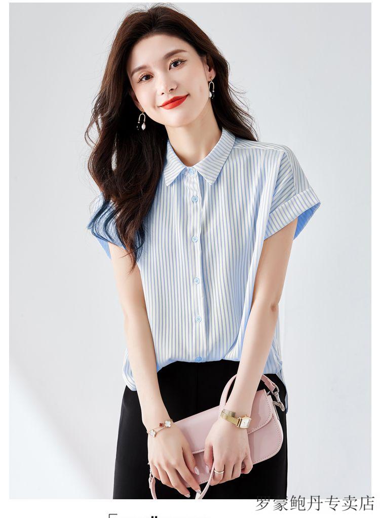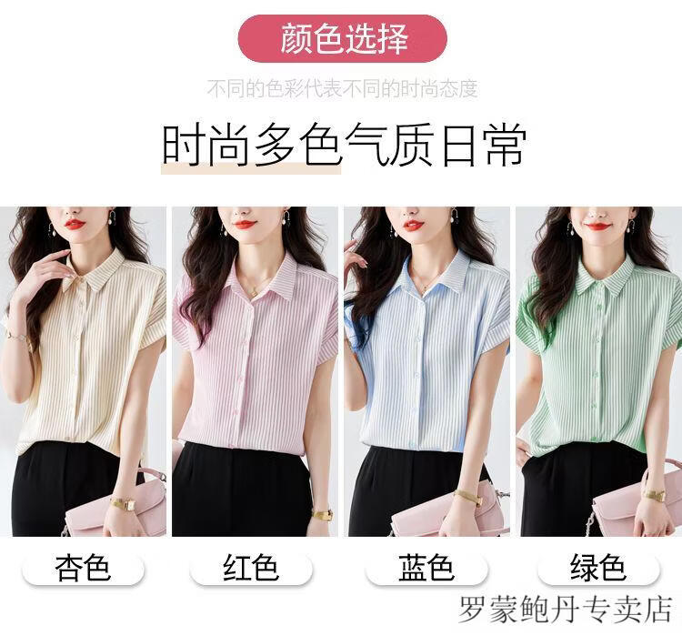 ROMON POLO collar short-sleeved striped chiffon shirt for women summer new fashion style shirt loose belly cover green S