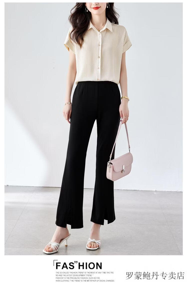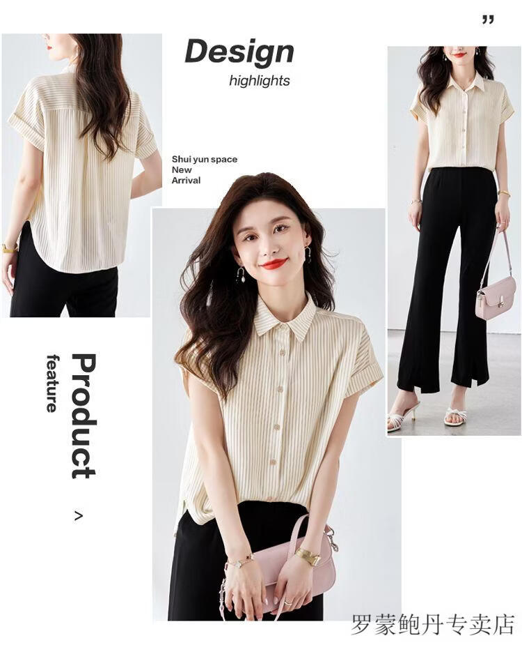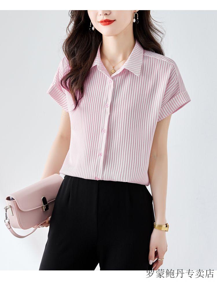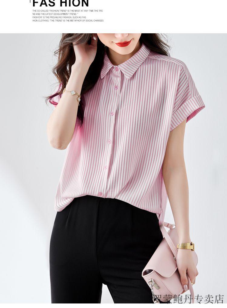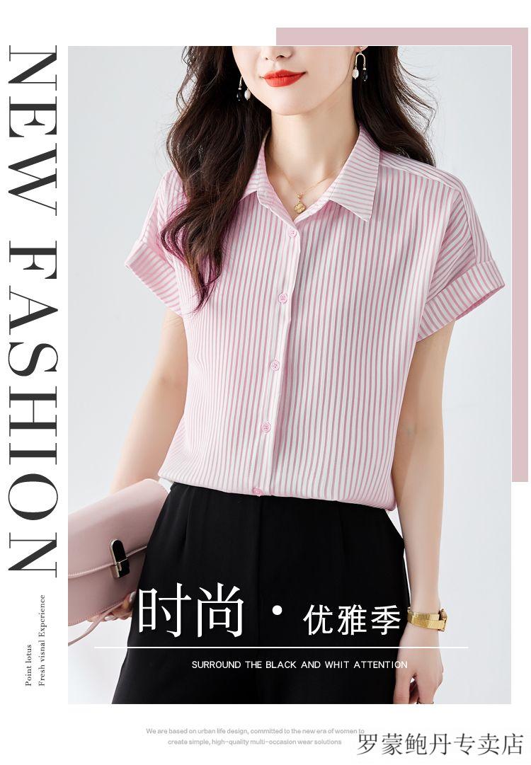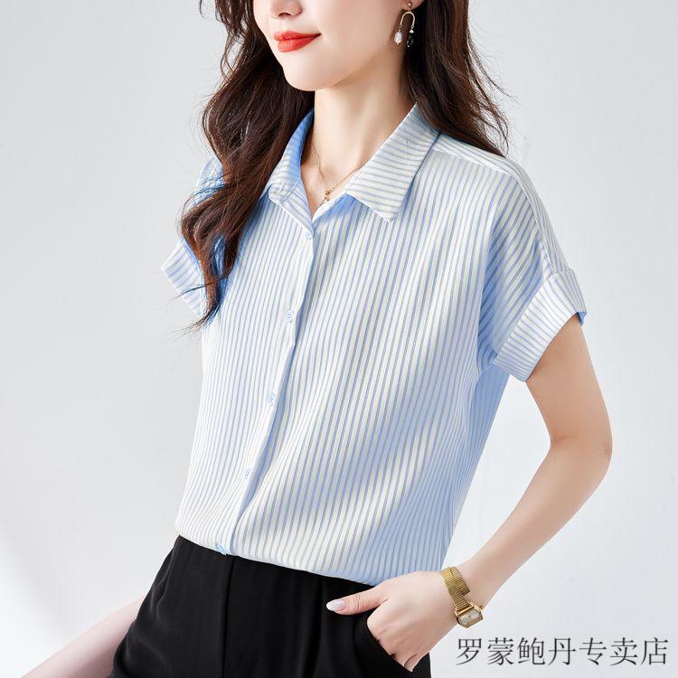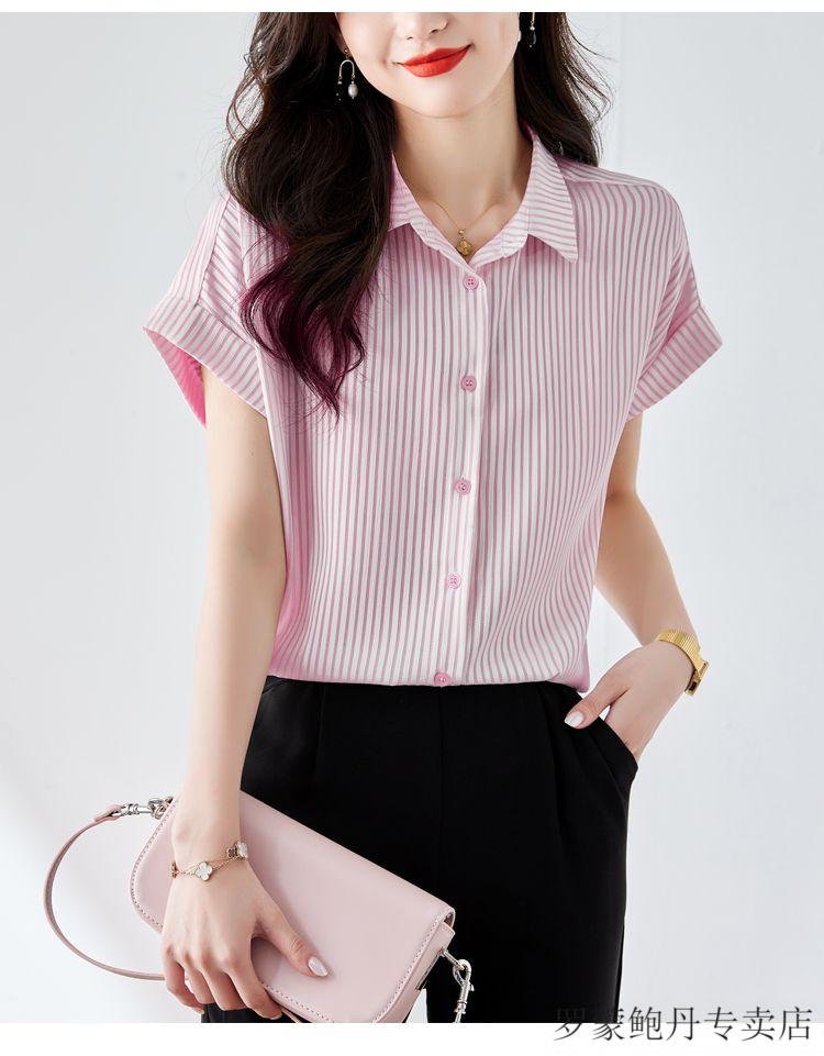 ROMON POLO collar short-sleeved striped chiffon shirt for women summer new fashion style shirt loose belly cover green S