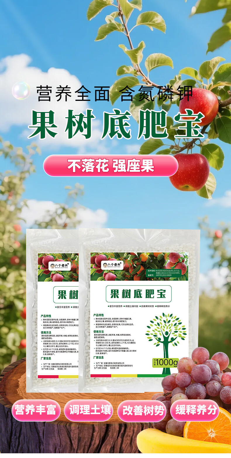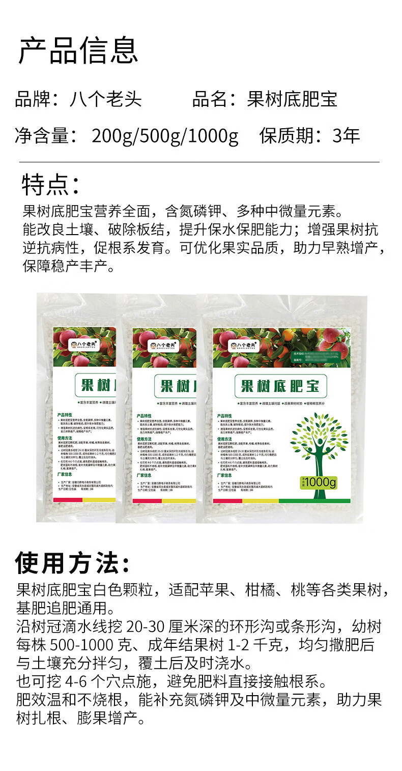 The gospel of eight old men and lazy people is a one-time spread of nutrients and slow-release nutrients. It provides a stable supply throughout the year, saves worry and is efficient, promotes strong roots and strong trees, and ensures a good harvest. 1000g of bottom-protected fertilizer for fruit trees, 1 bag.