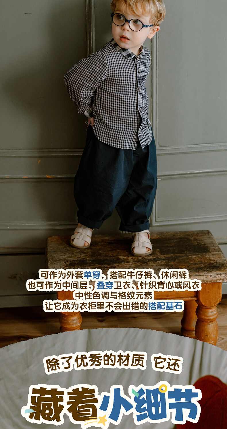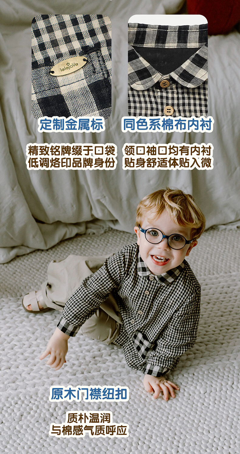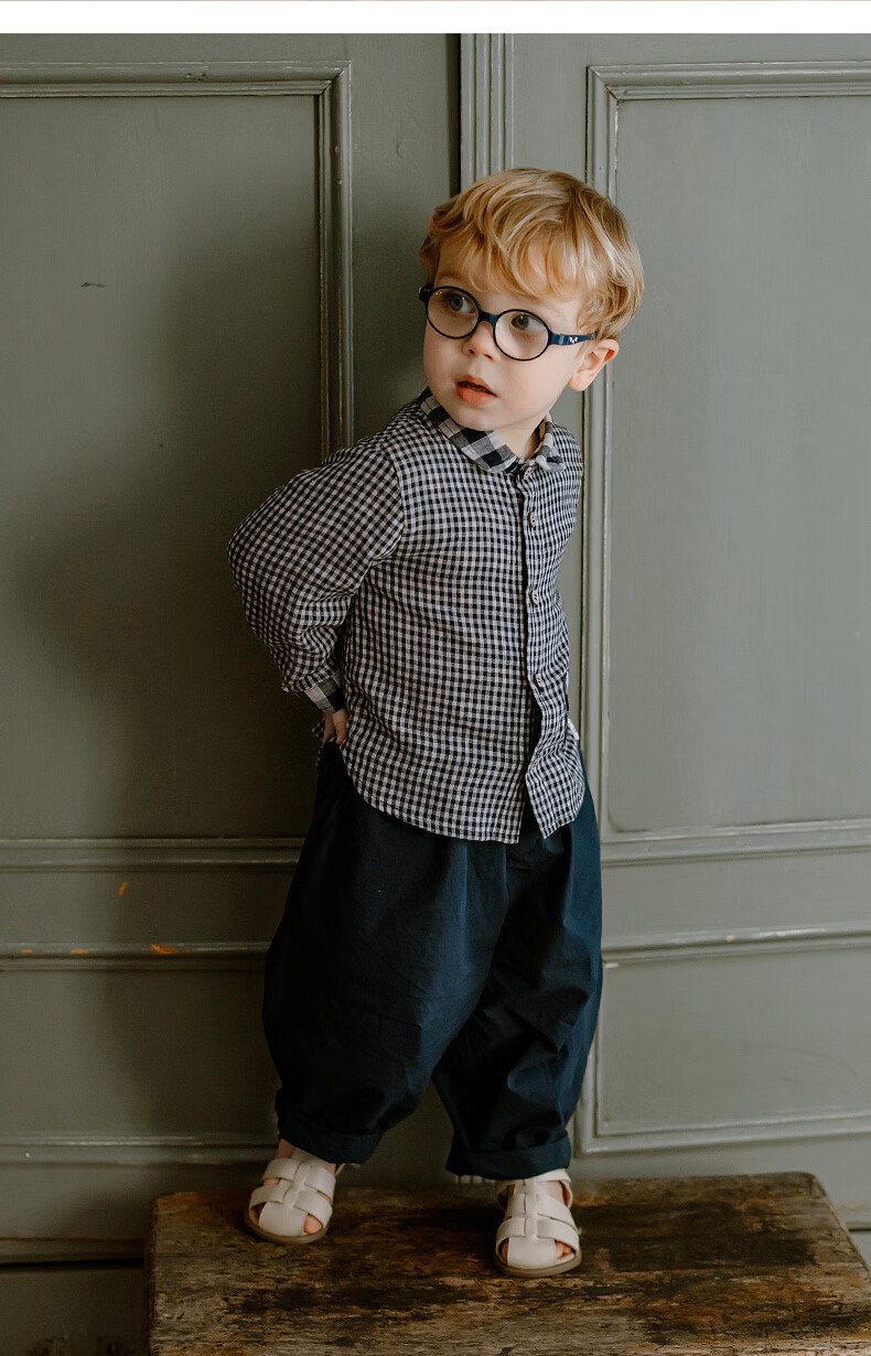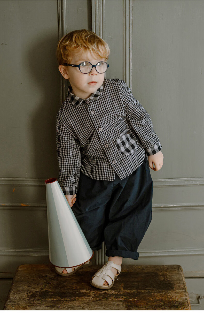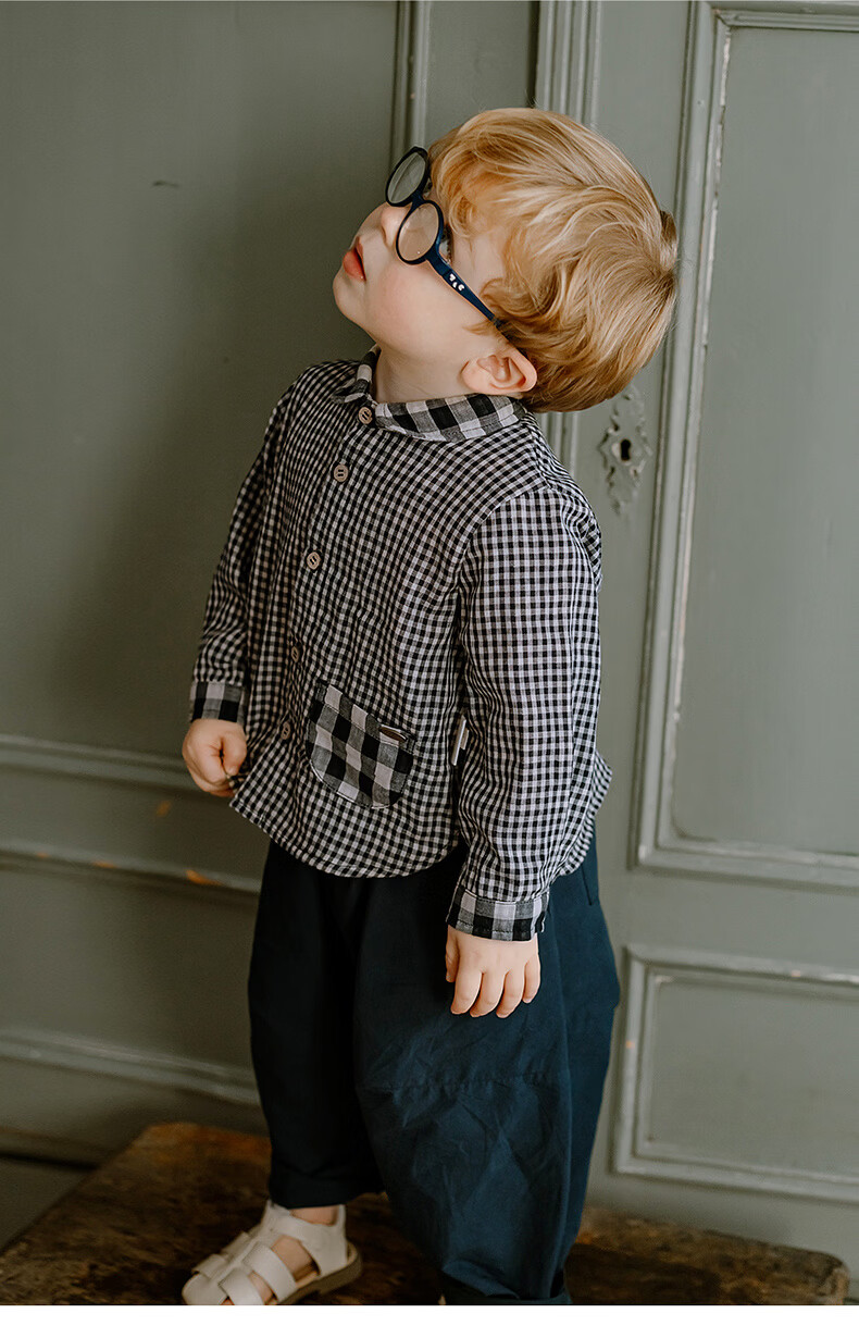 LELE JOVE children's tops spring new boys college style casual all-match lapel shirt navy plaid 110 cm