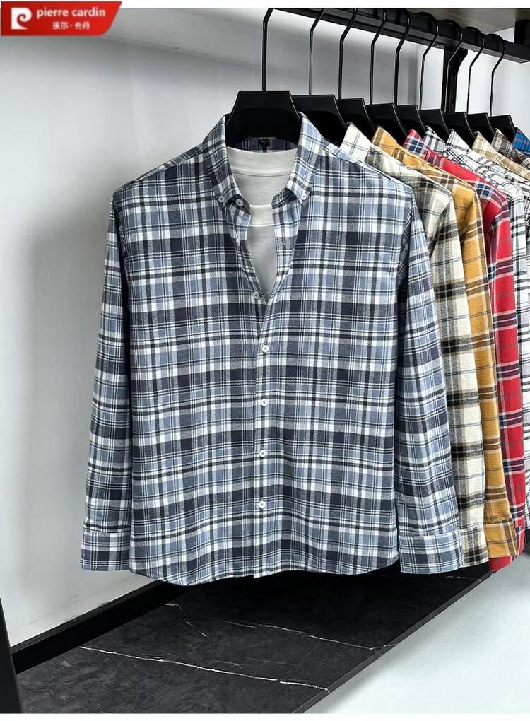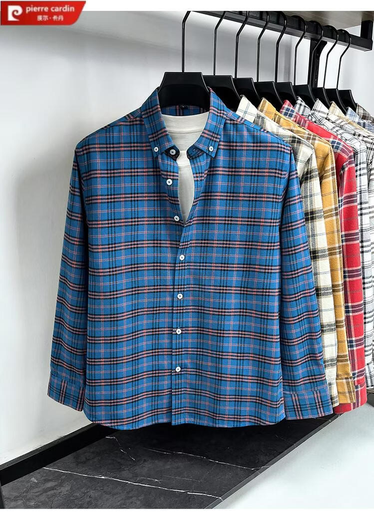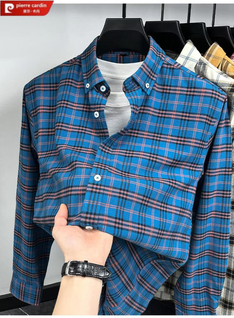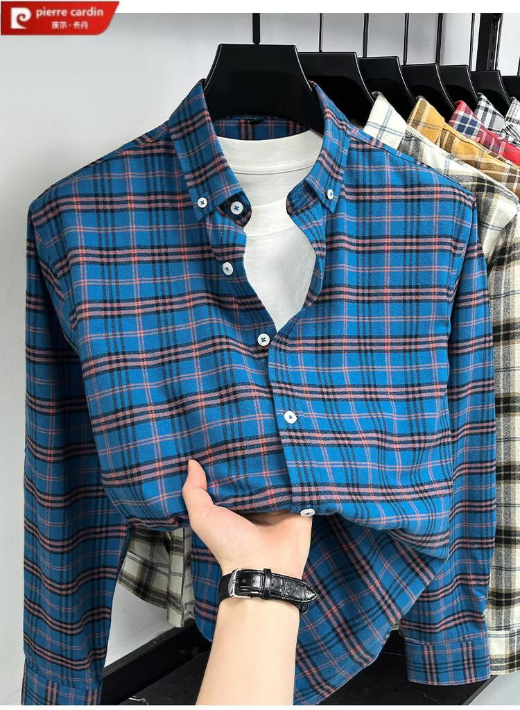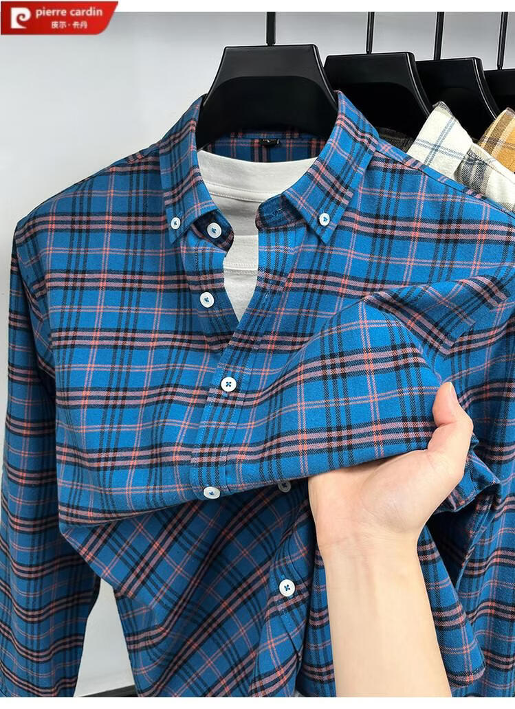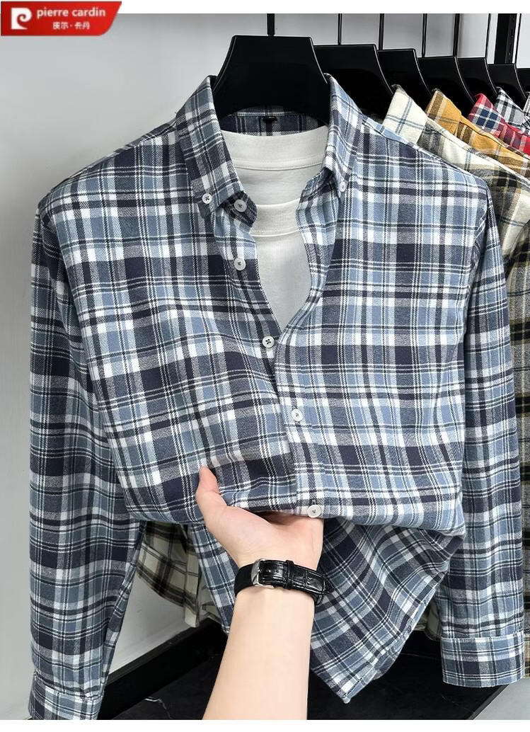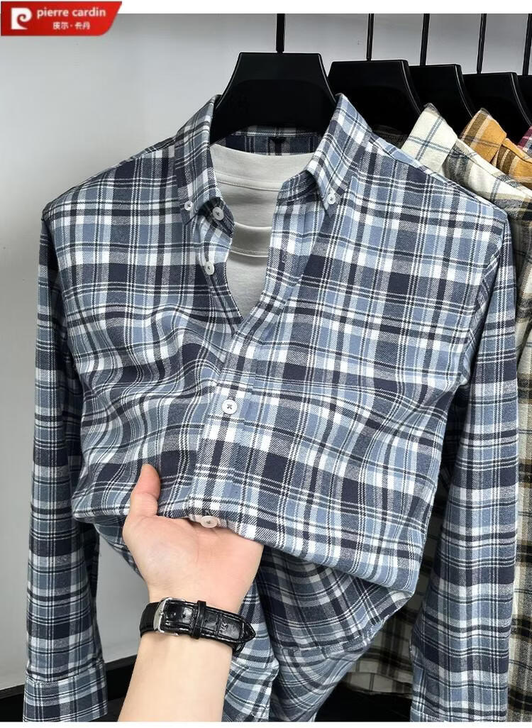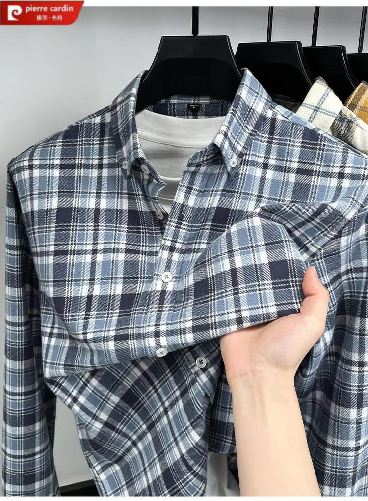 Pierre Cardin 100% cotton plaid long-sleeved shirt men's spring brushed shirt men's fashion casual no-iron inch shirt blue 100% cotton L