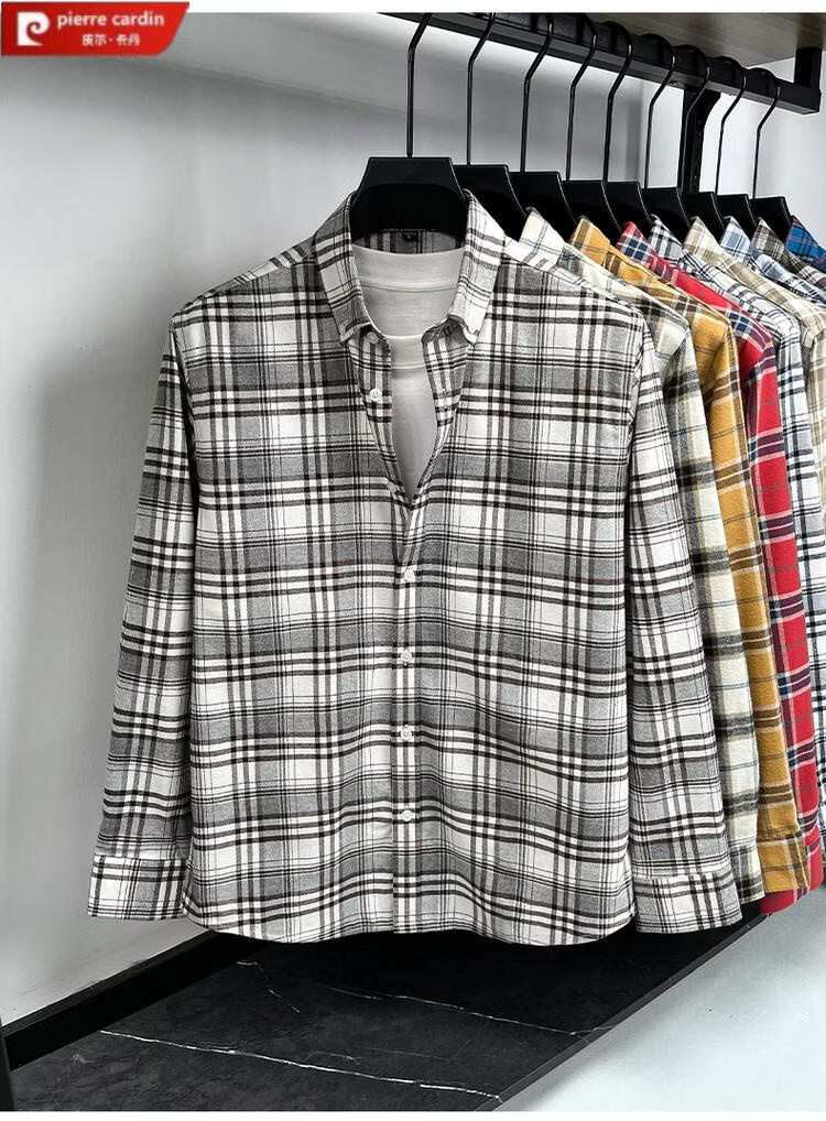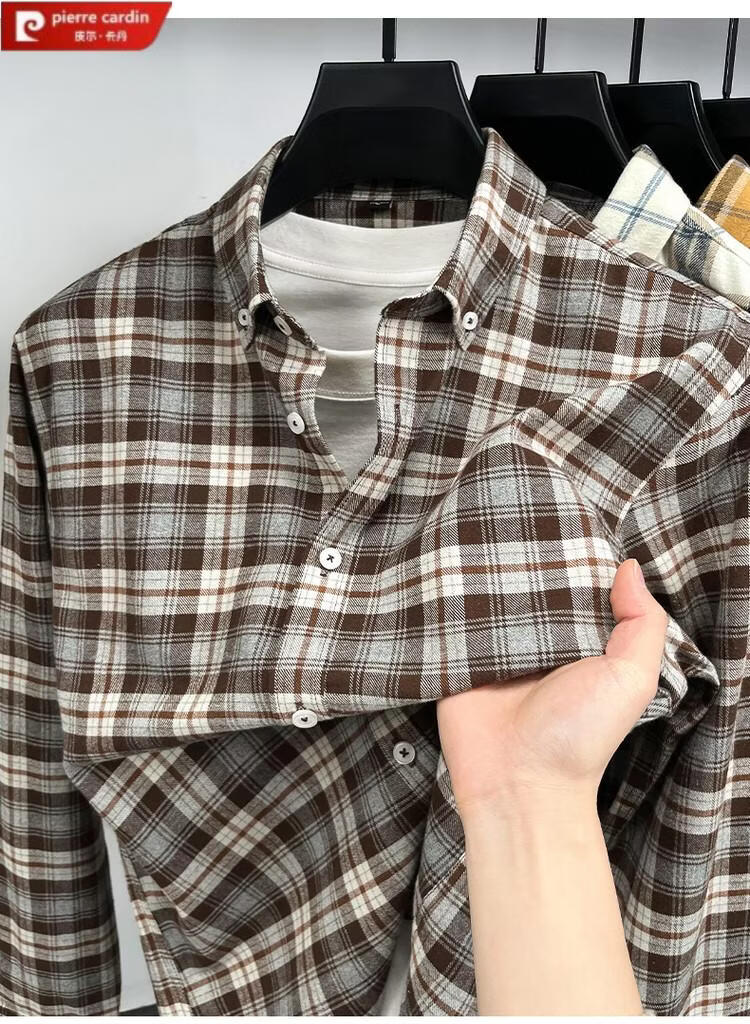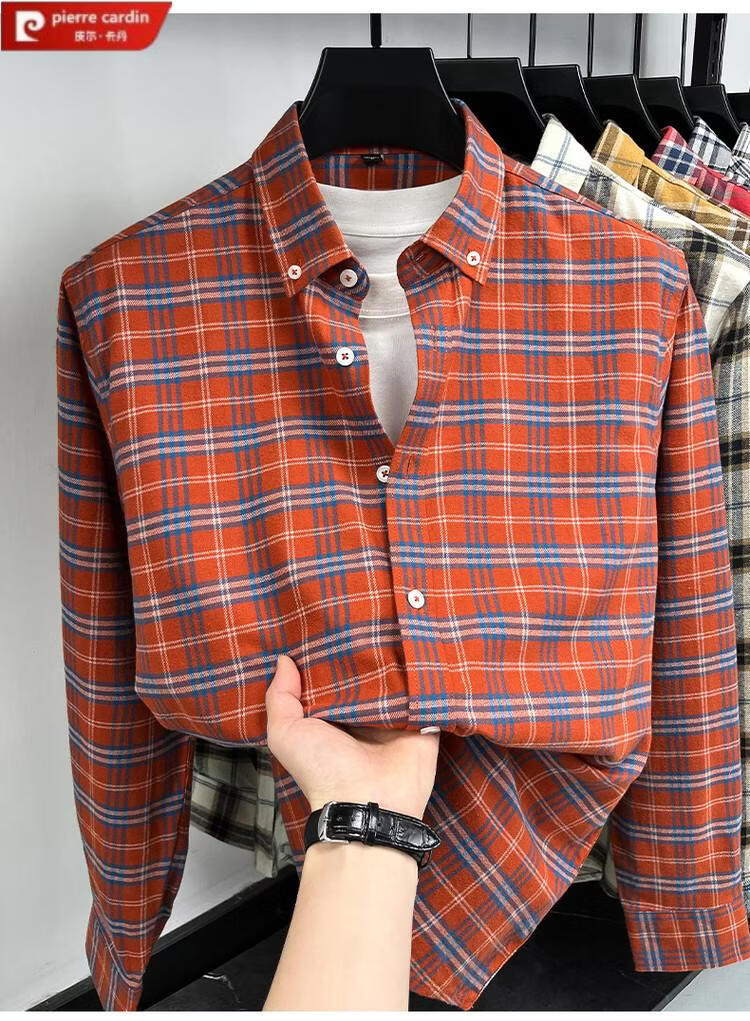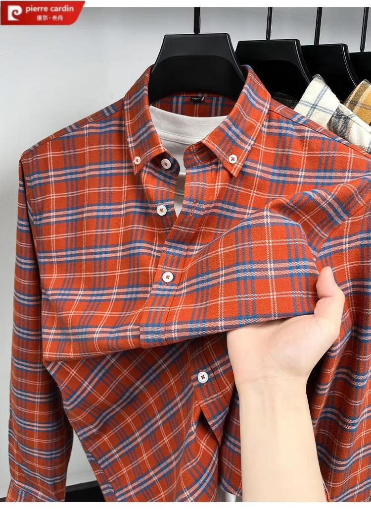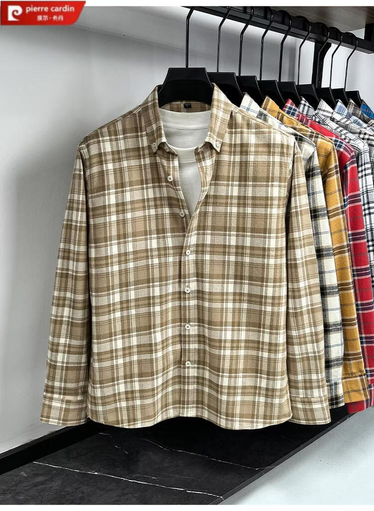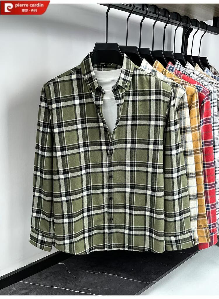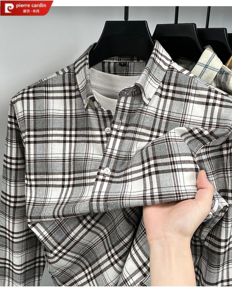 Pierre Cardin 100% cotton plaid long-sleeved shirt men's spring brushed shirt men's fashion casual no-iron inch shirt blue 100% cotton L