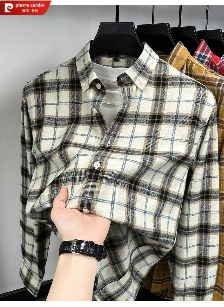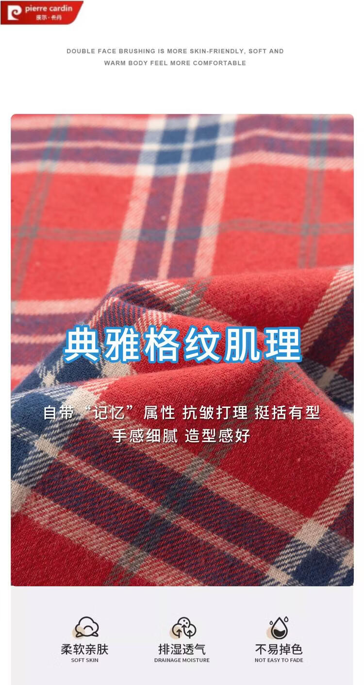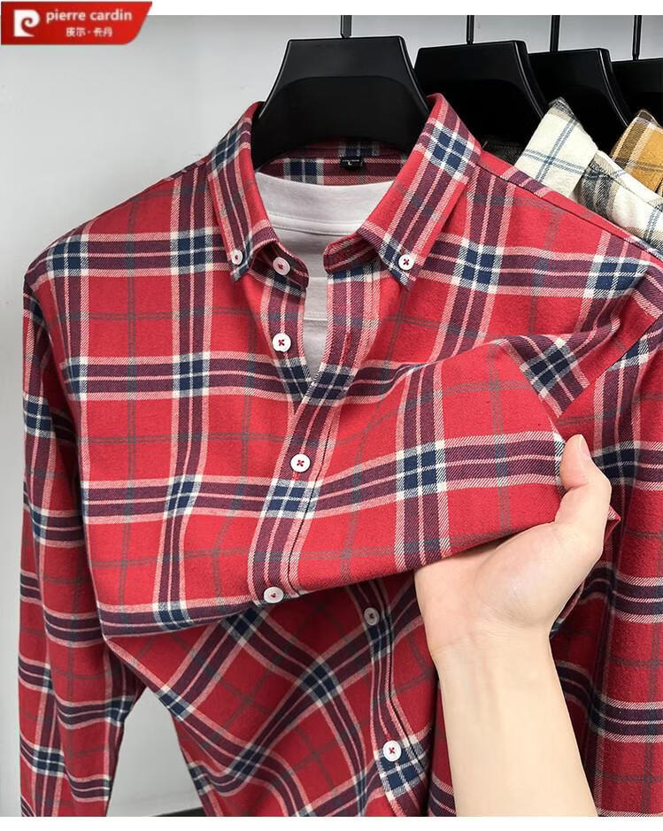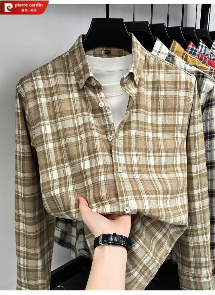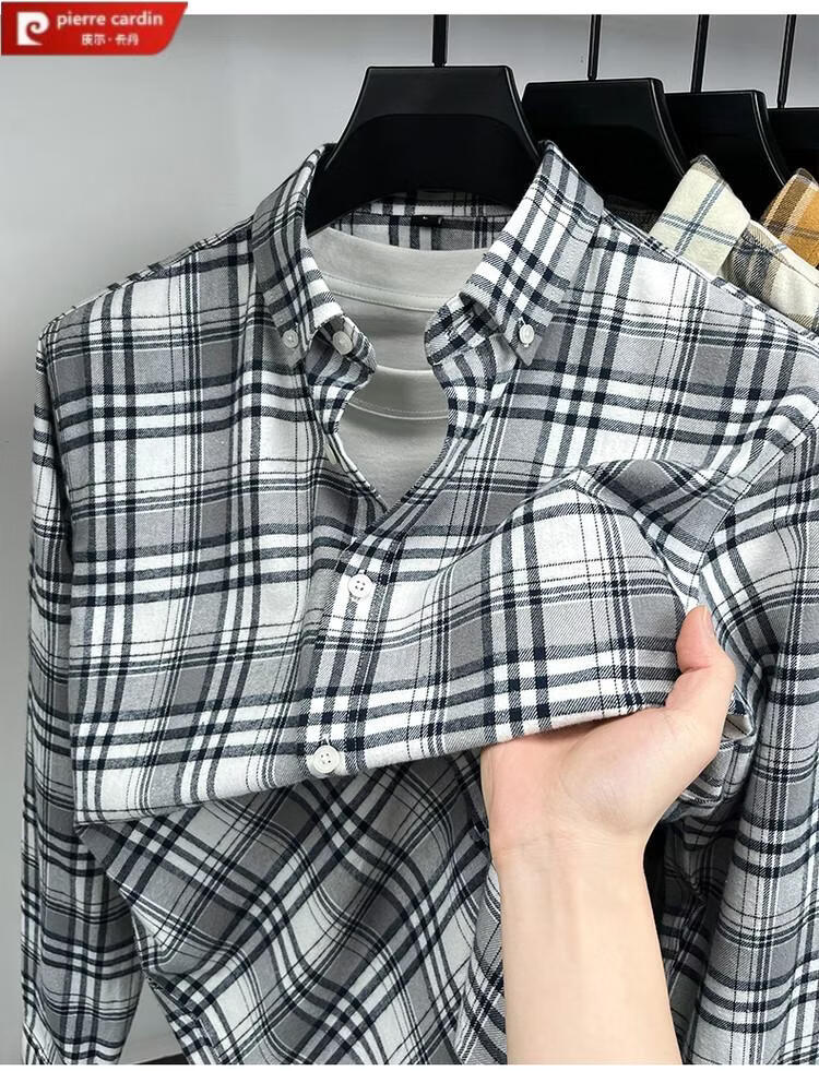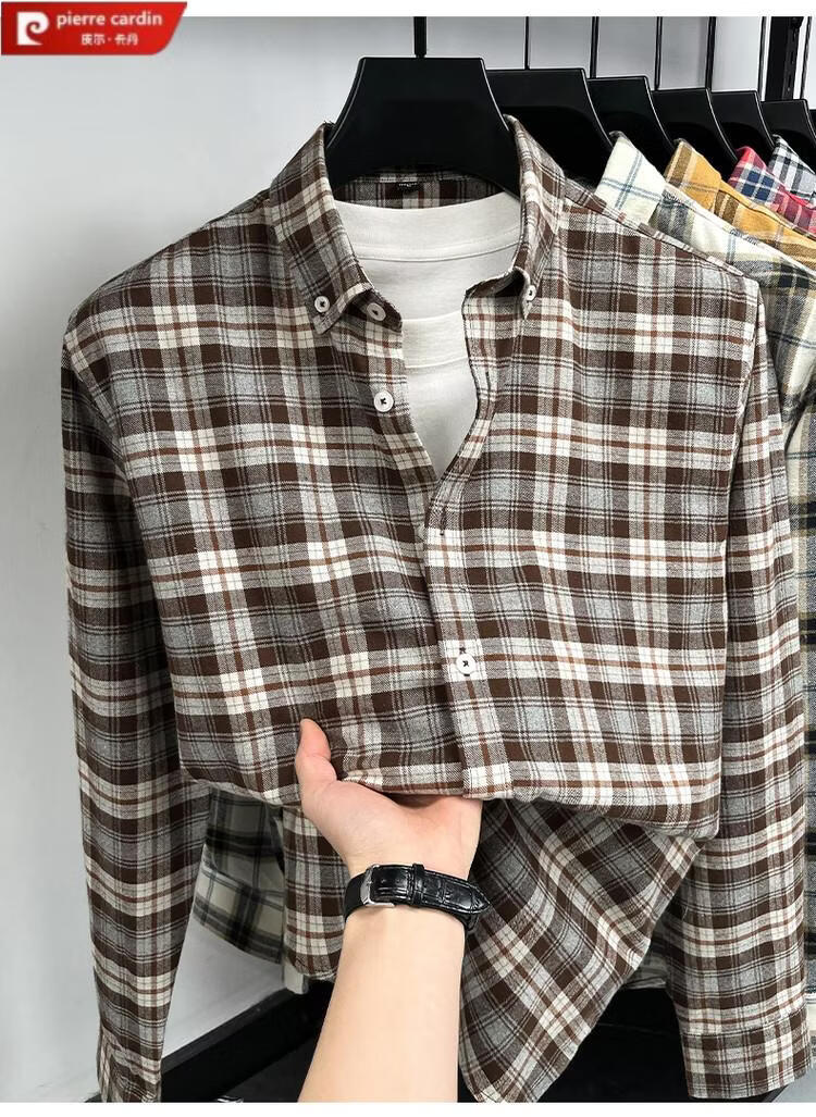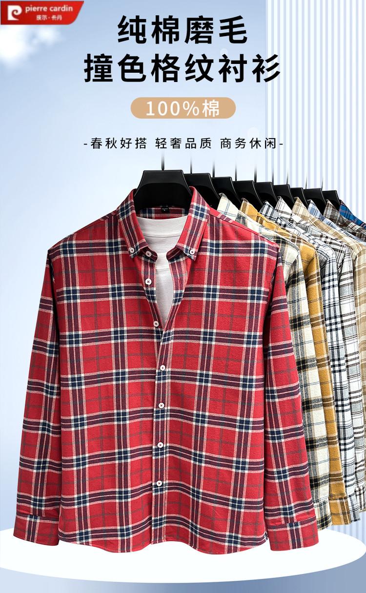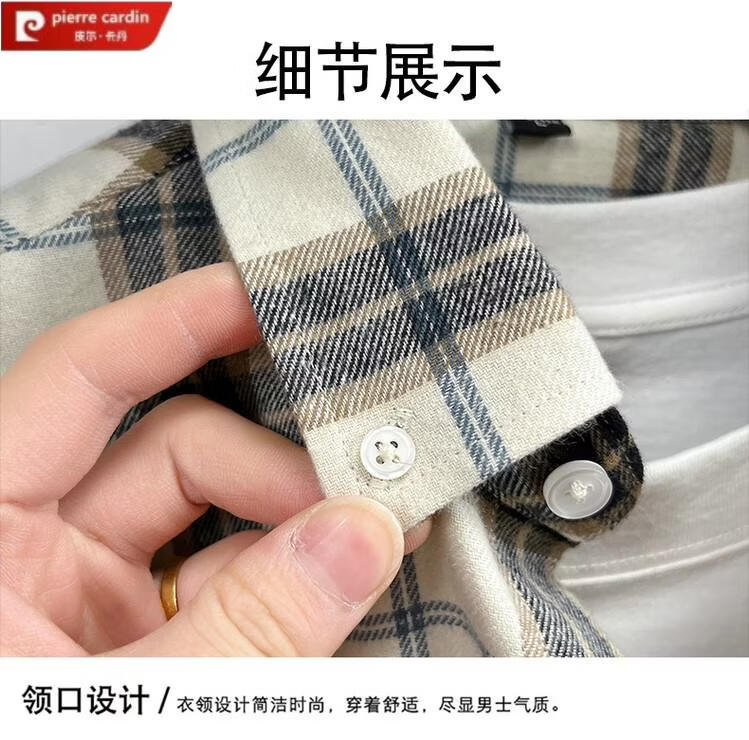 Pierre Cardin 100% cotton plaid long-sleeved shirt men's spring brushed shirt men's fashion casual no-iron inch shirt blue 100% cotton L
