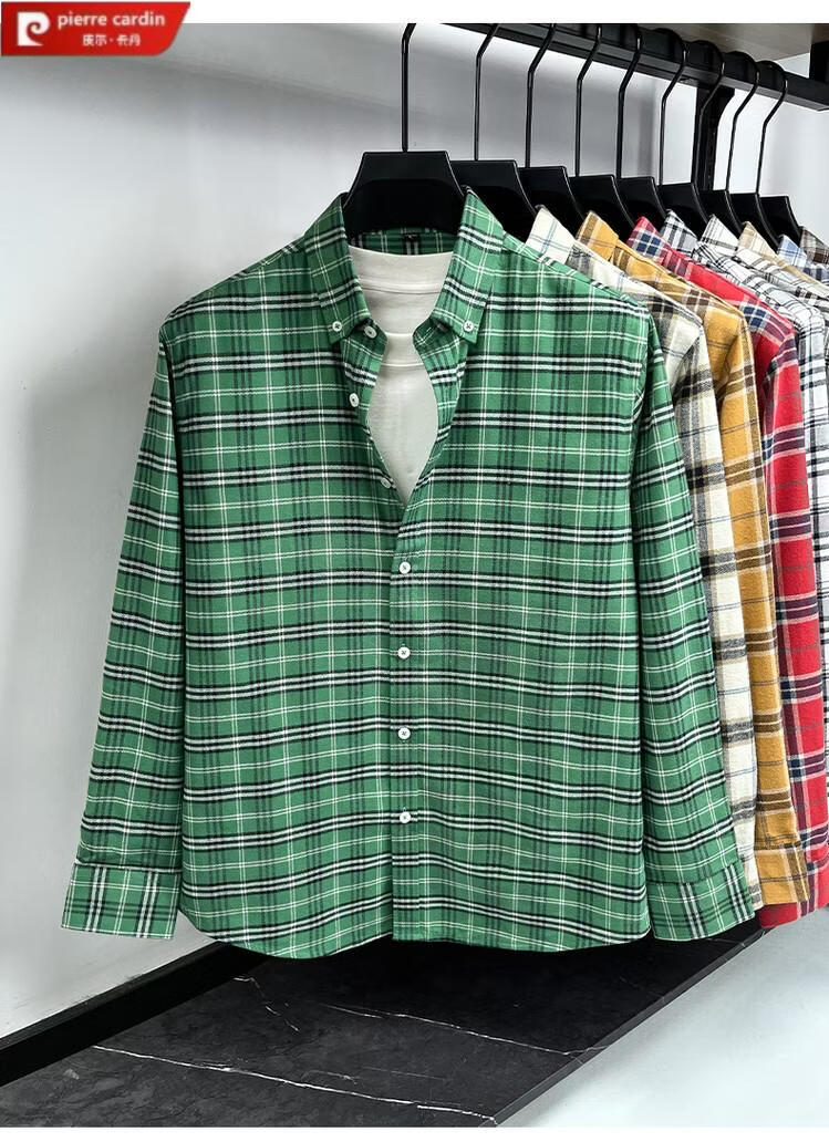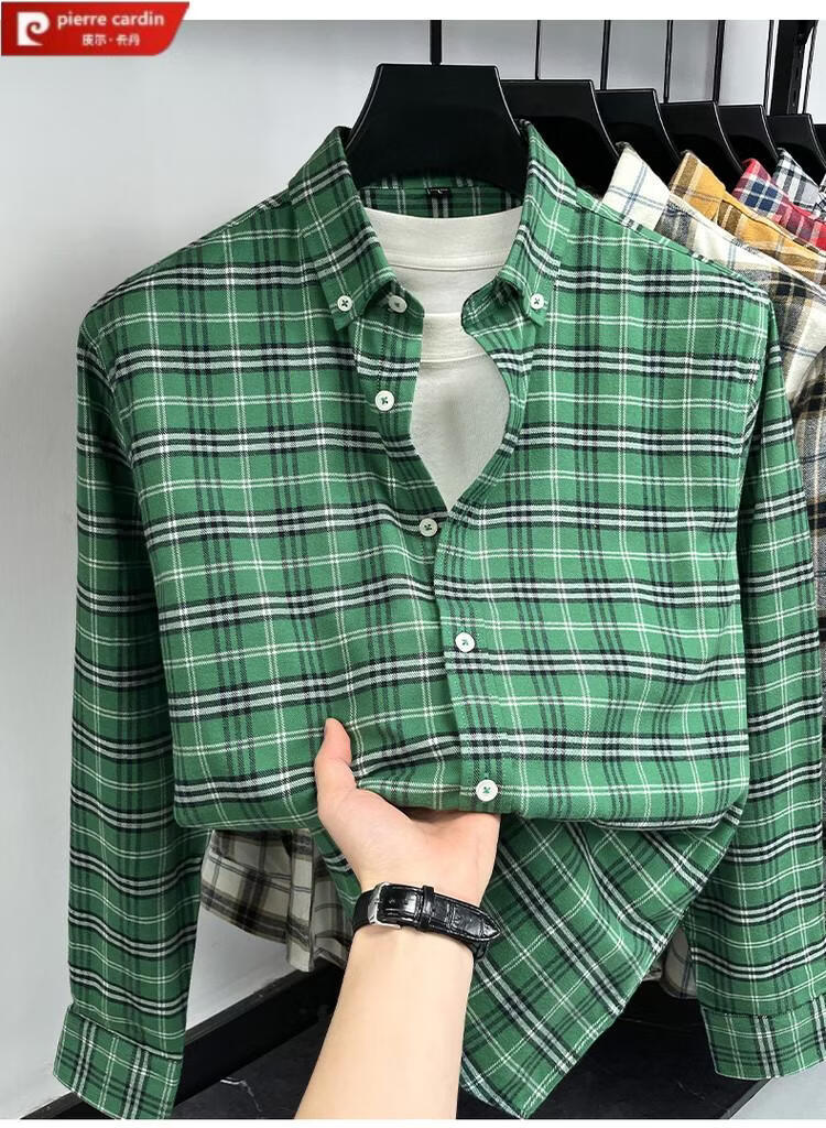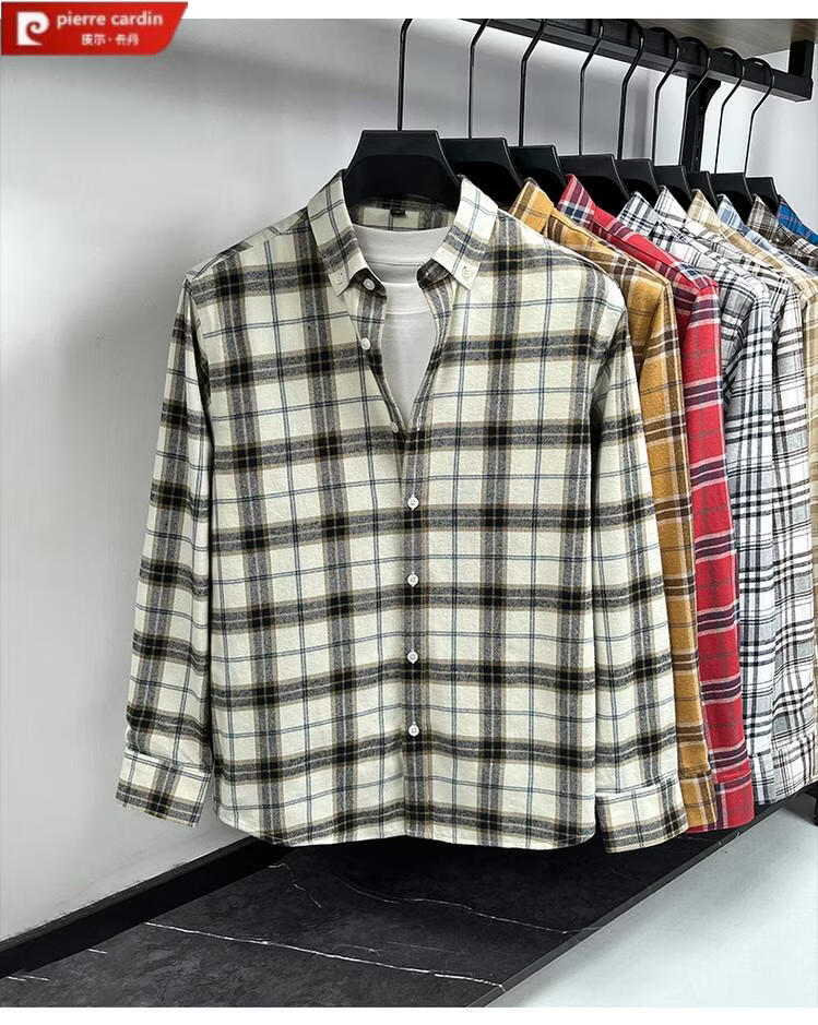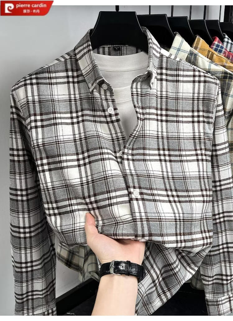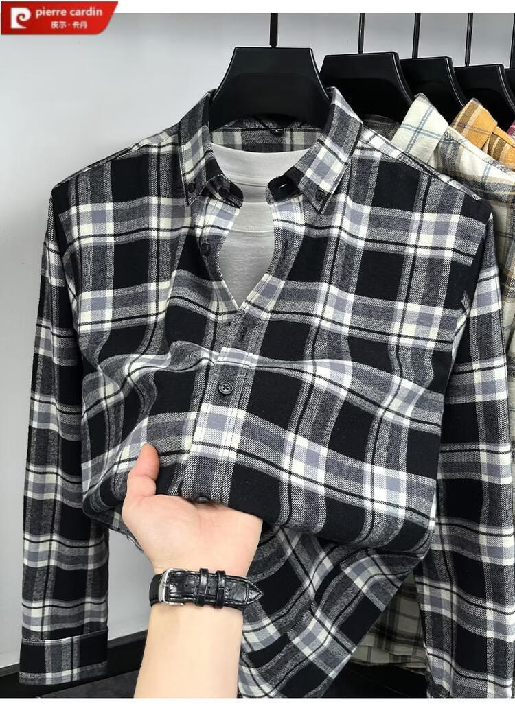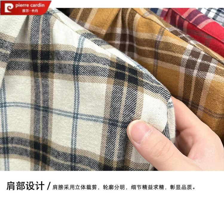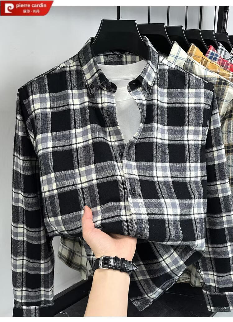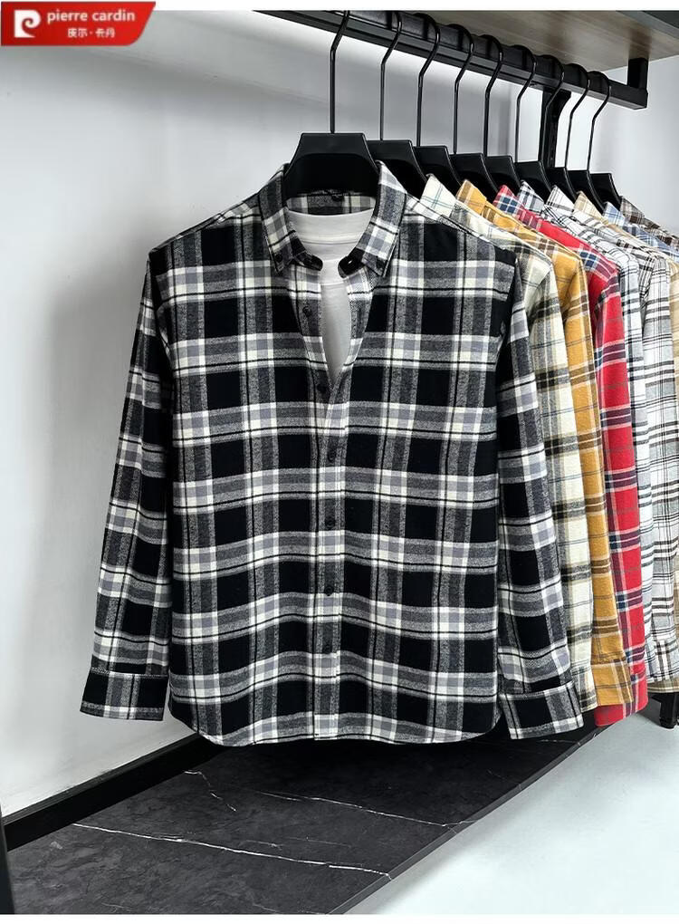 Pierre Cardin 100% cotton plaid long-sleeved shirt men's spring brushed shirt men's fashion casual no-iron inch shirt blue 100% cotton L