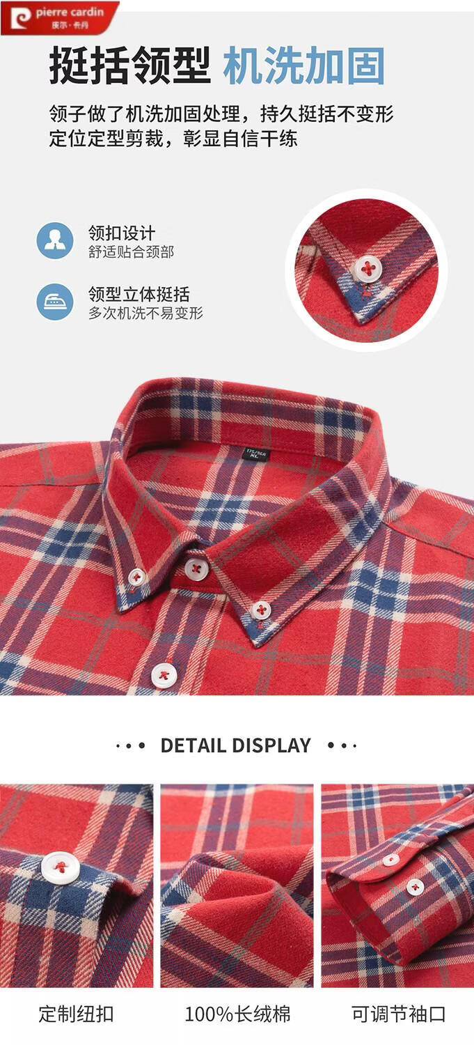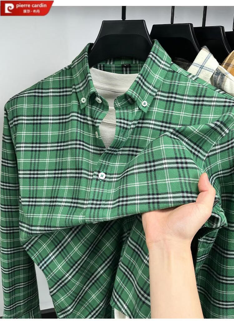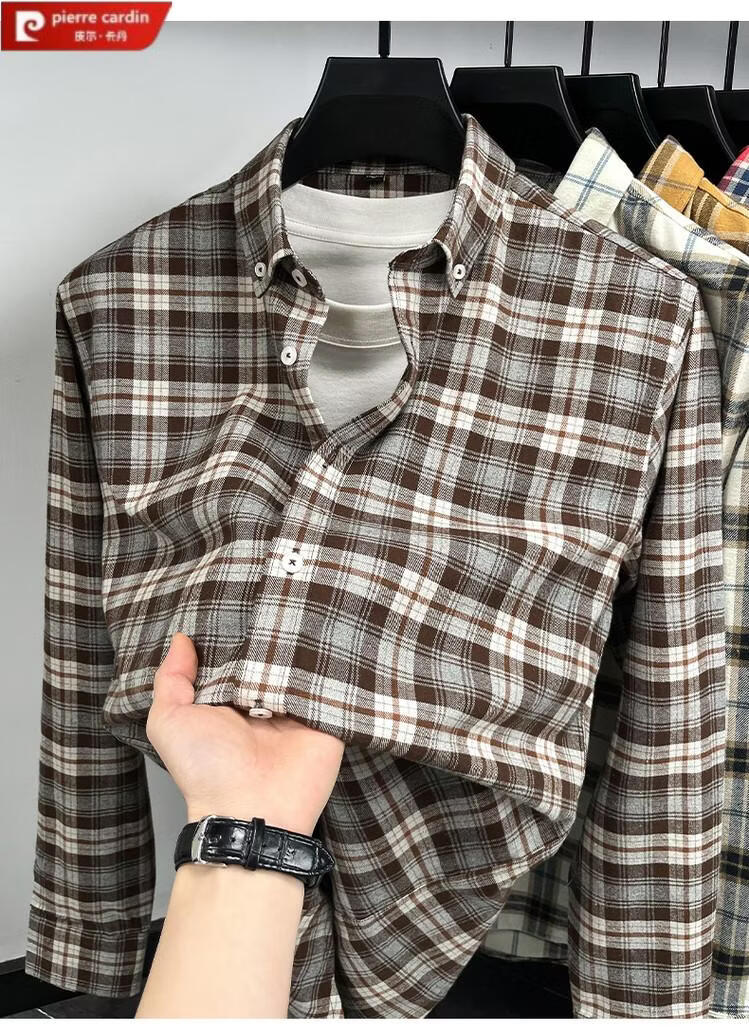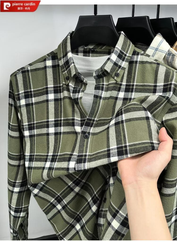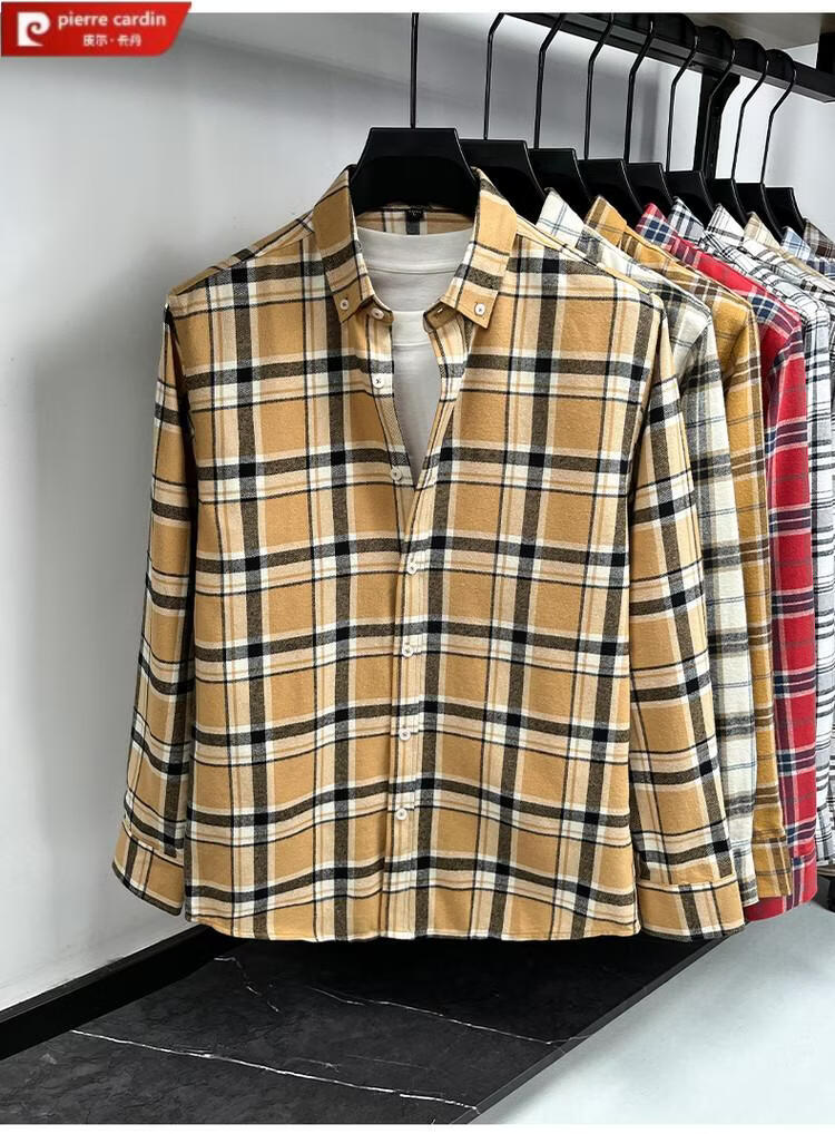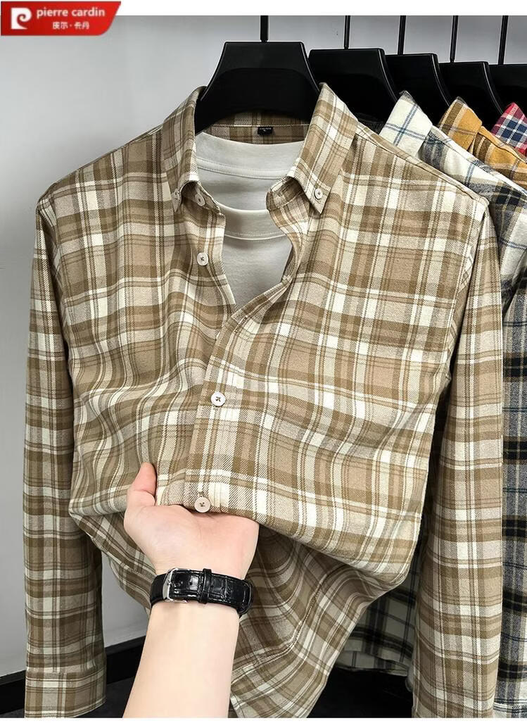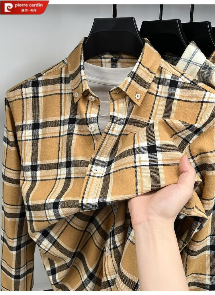 Pierre Cardin 100% cotton plaid long-sleeved shirt men's spring brushed shirt men's fashion casual no-iron inch shirt blue 100% cotton L