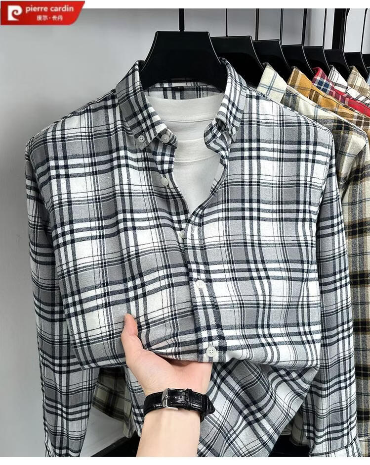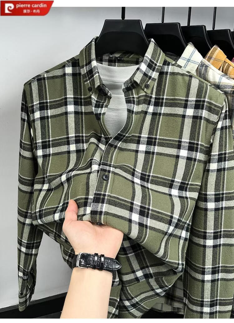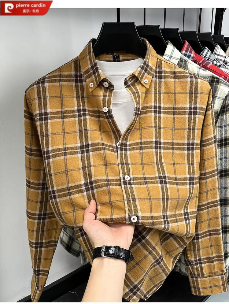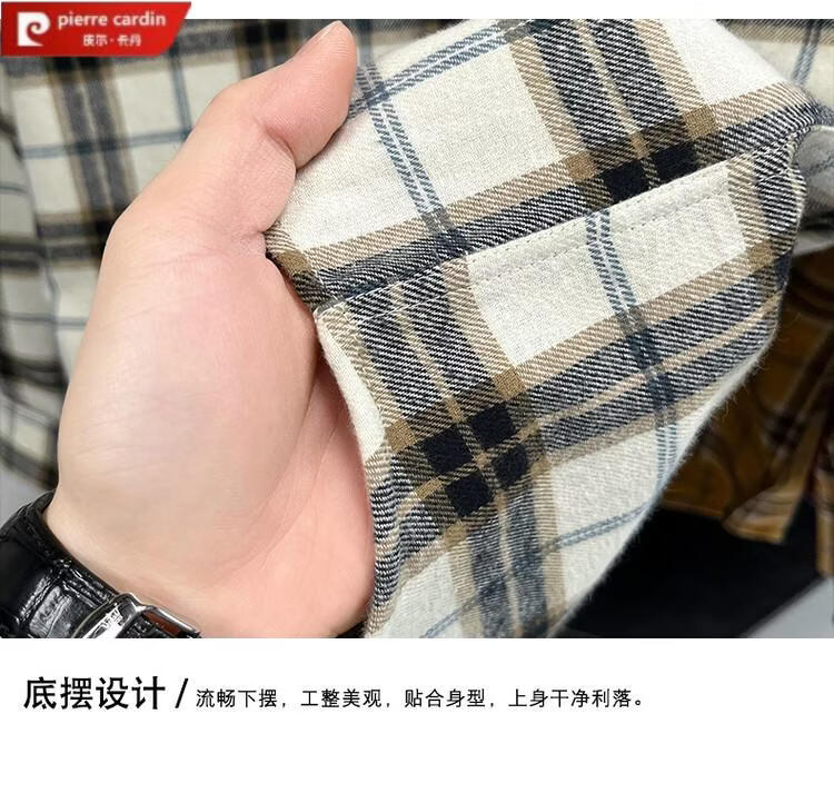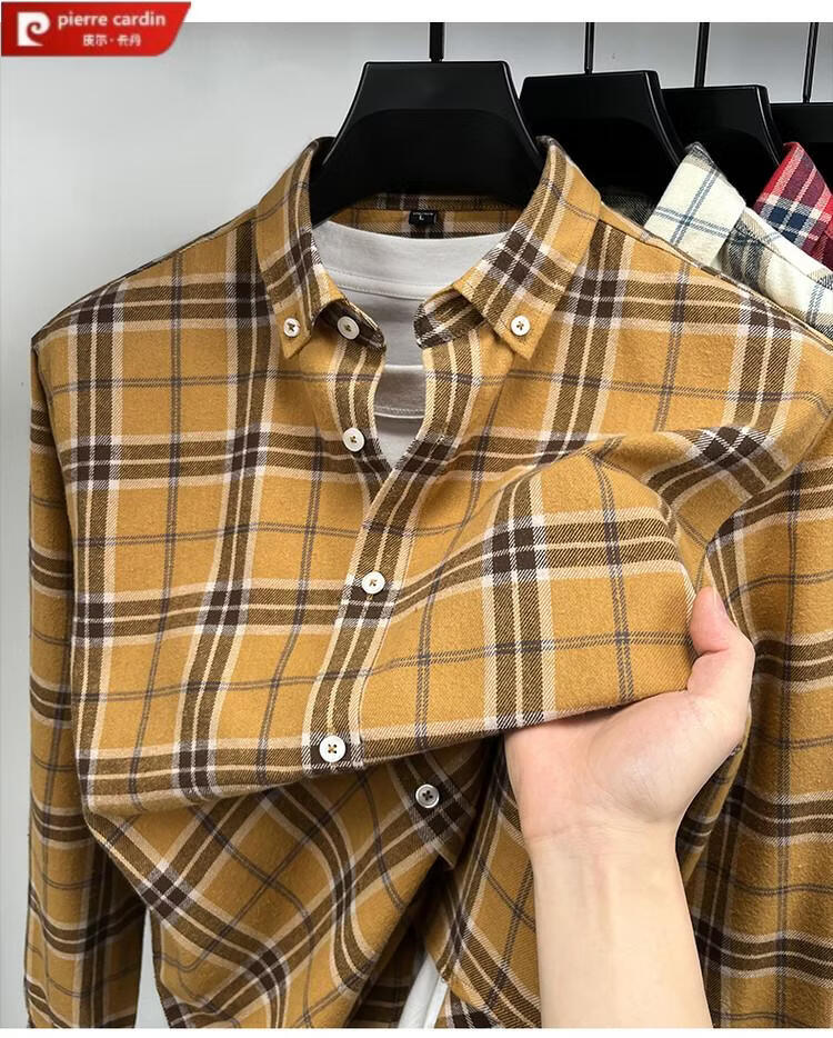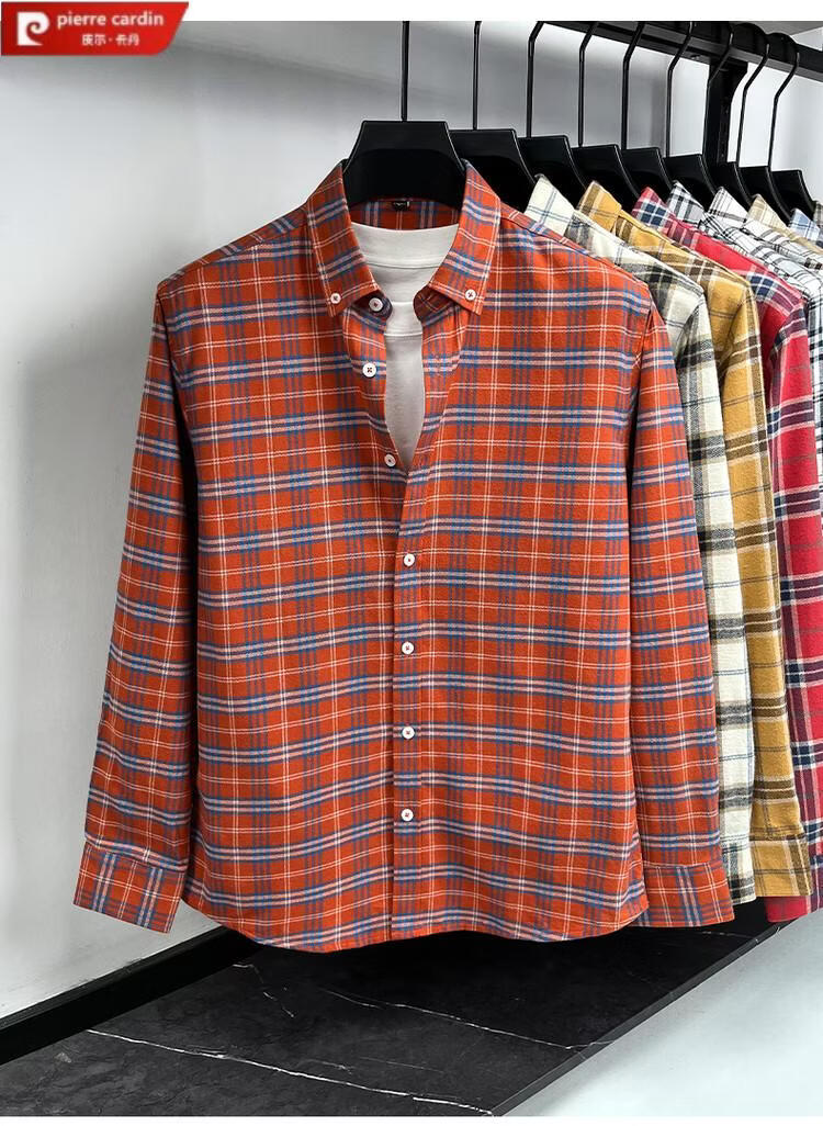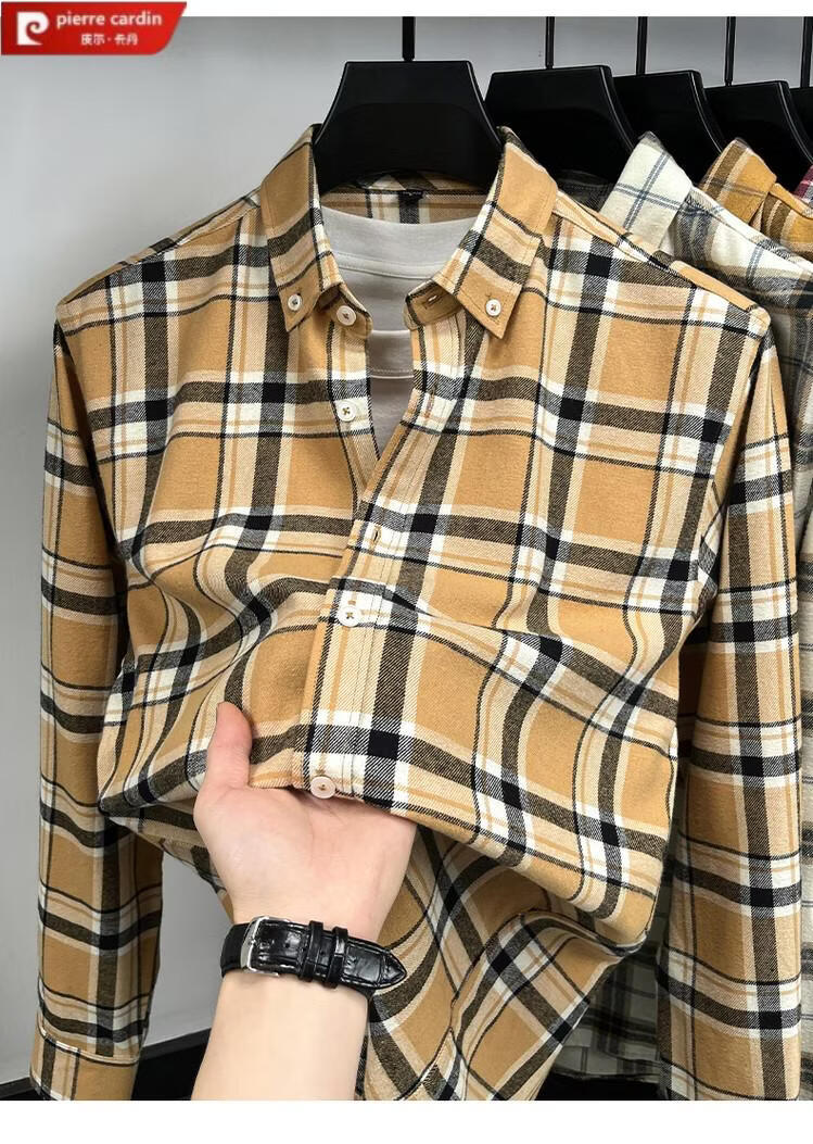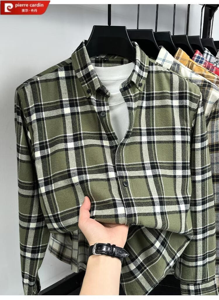 Pierre Cardin 100% cotton plaid long-sleeved shirt men's spring brushed shirt men's fashion casual no-iron inch shirt blue 100% cotton L