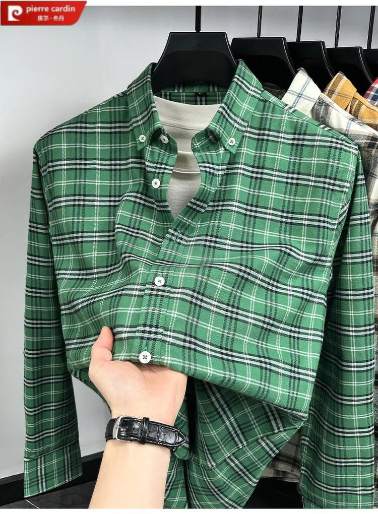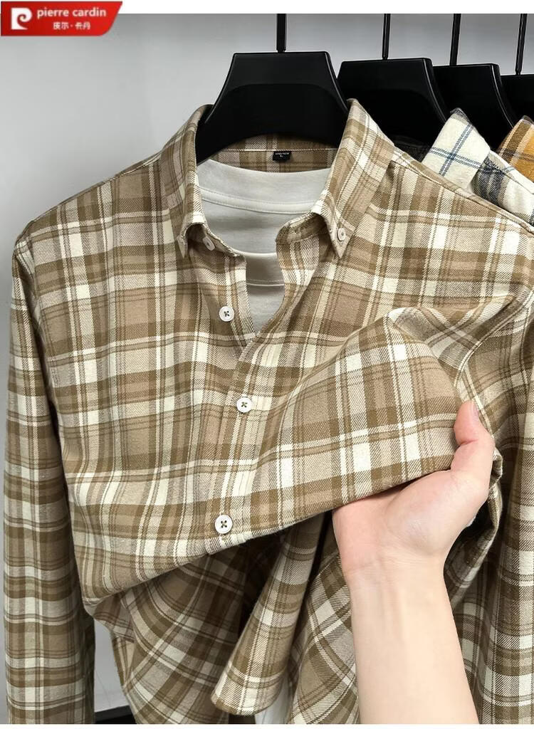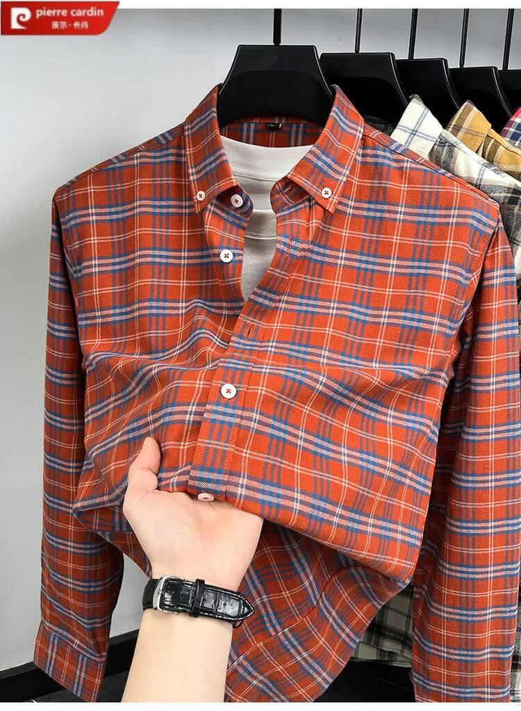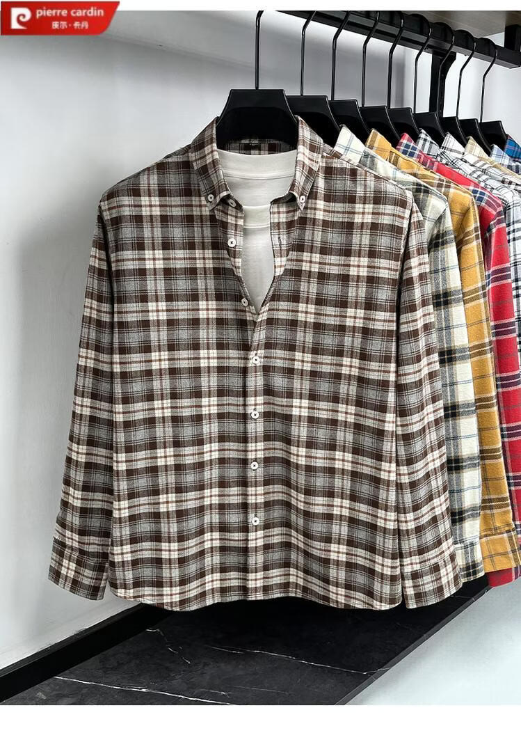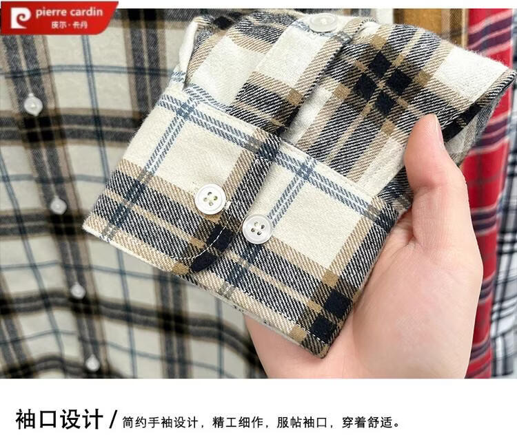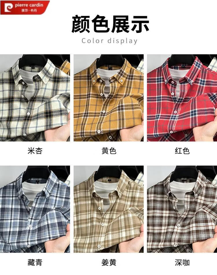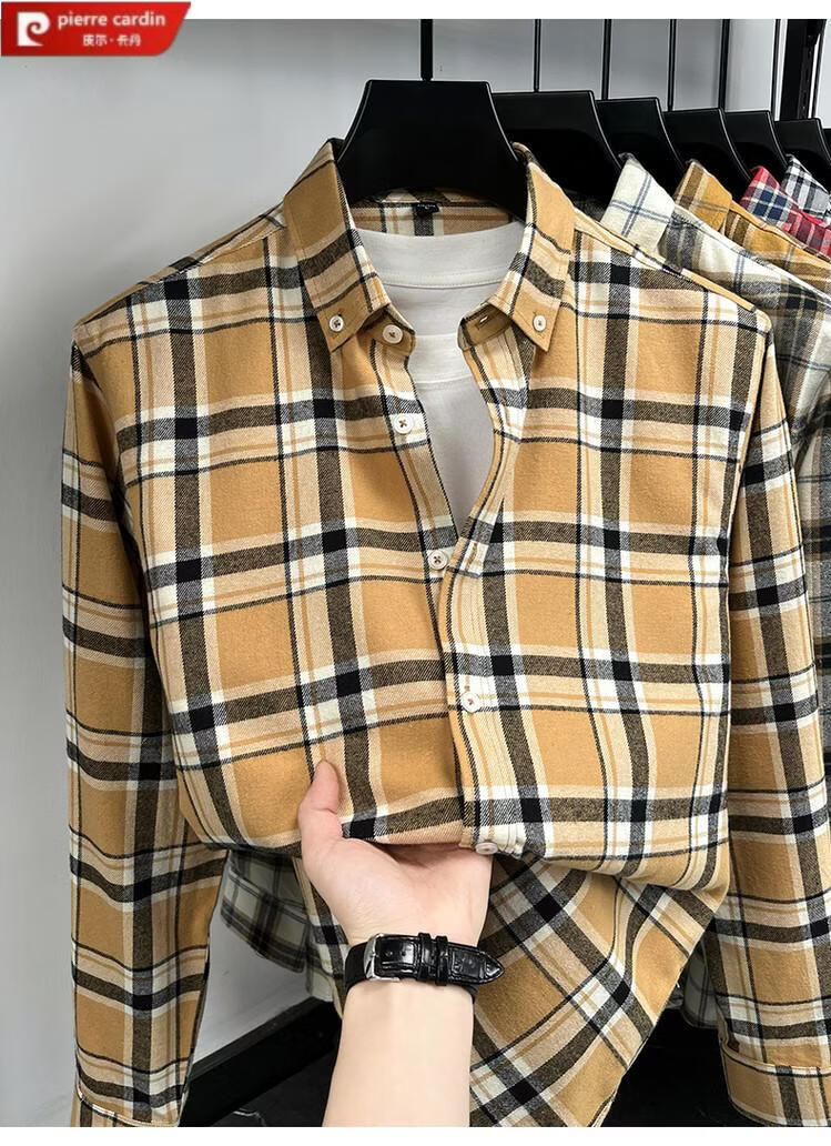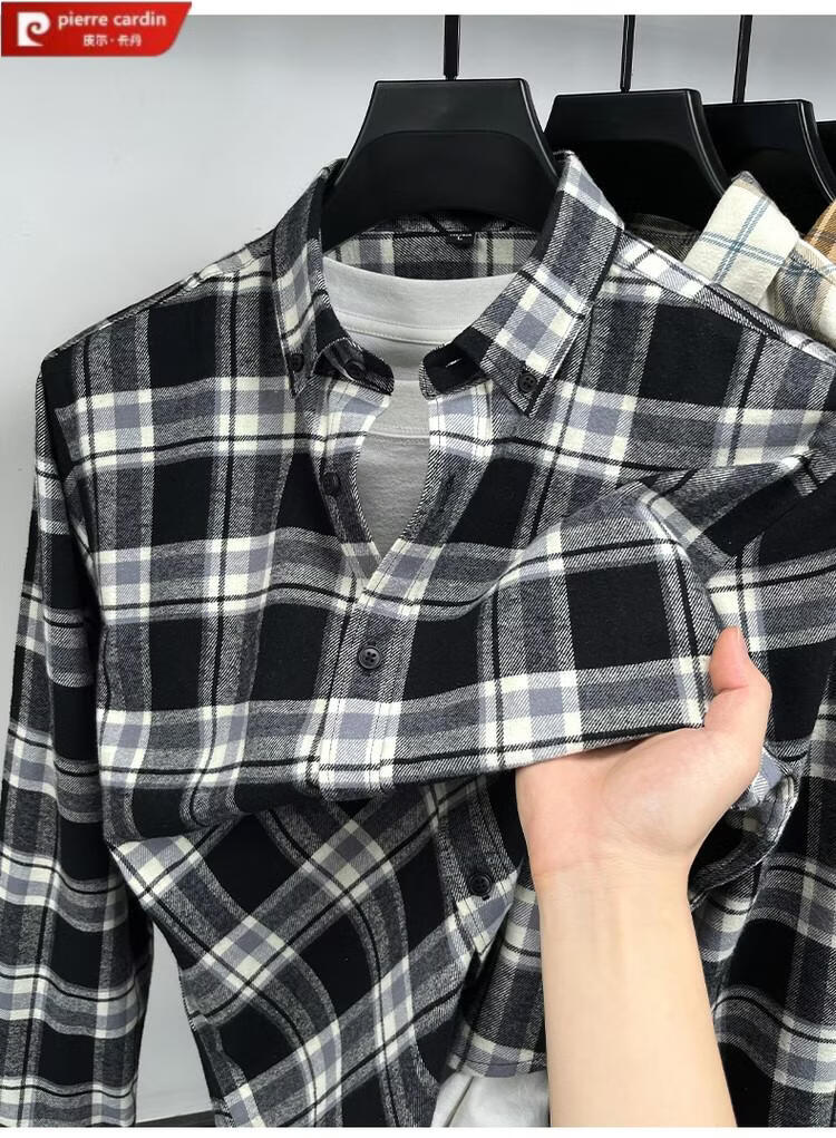 Pierre Cardin 100% cotton plaid long-sleeved shirt men's spring brushed shirt men's fashion casual no-iron inch shirt blue 100% cotton L