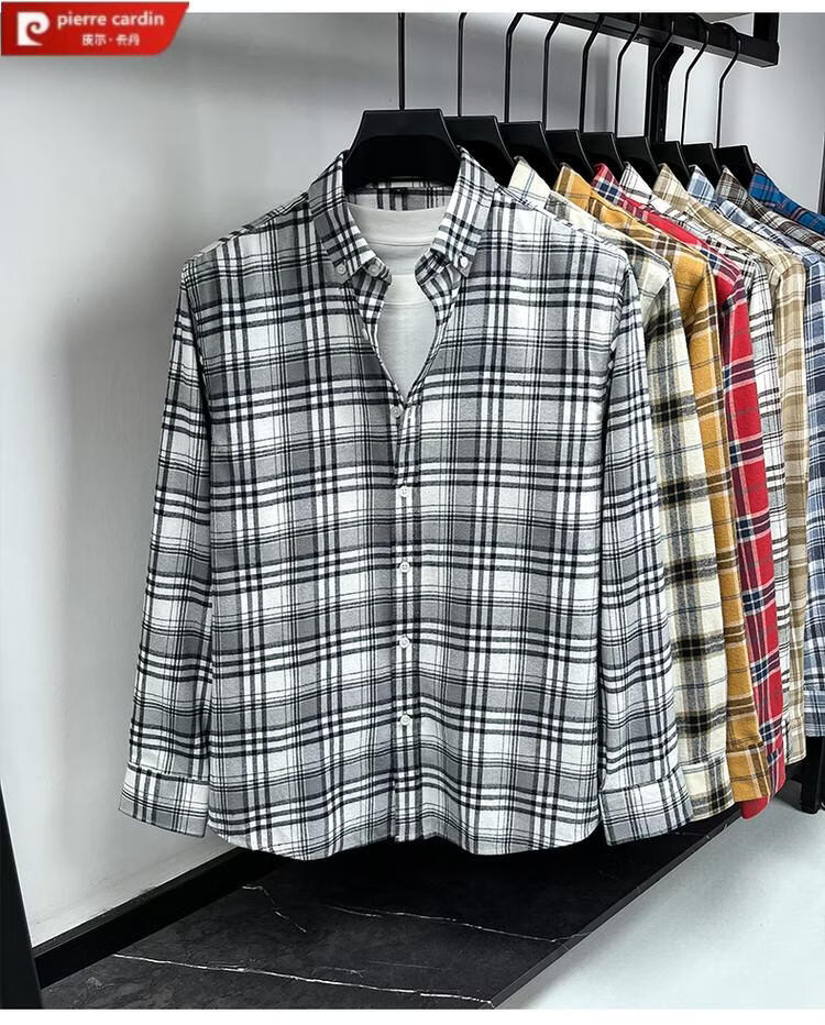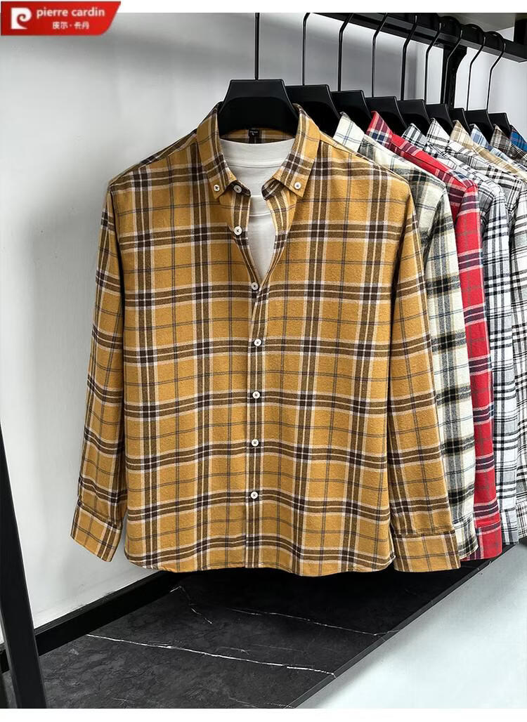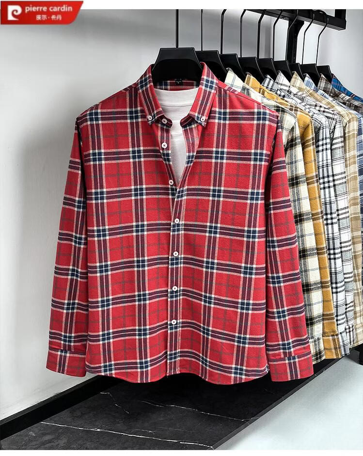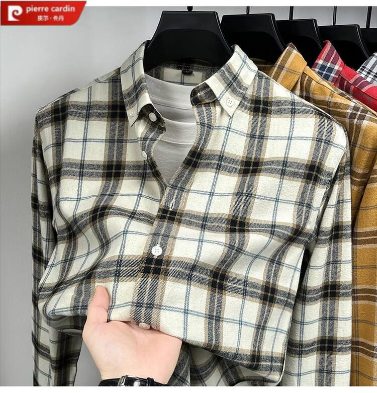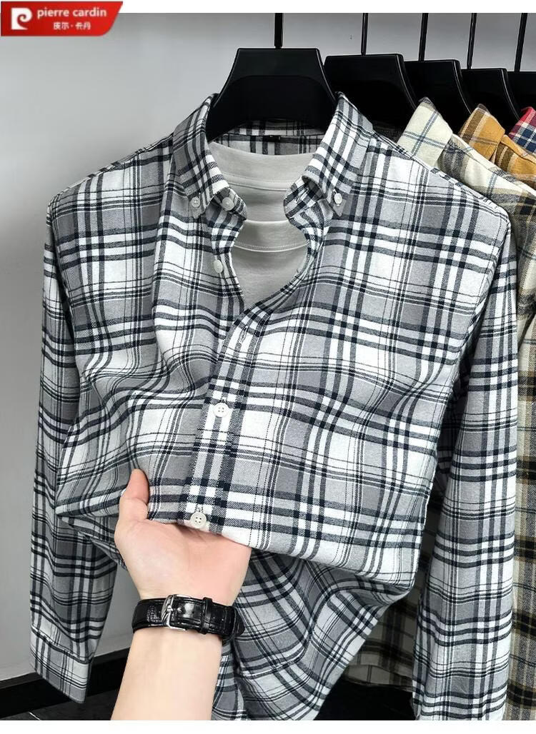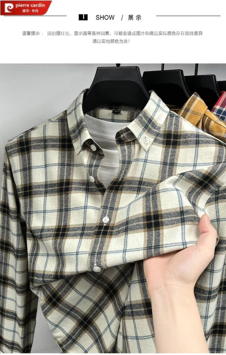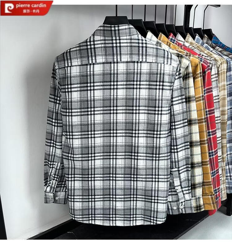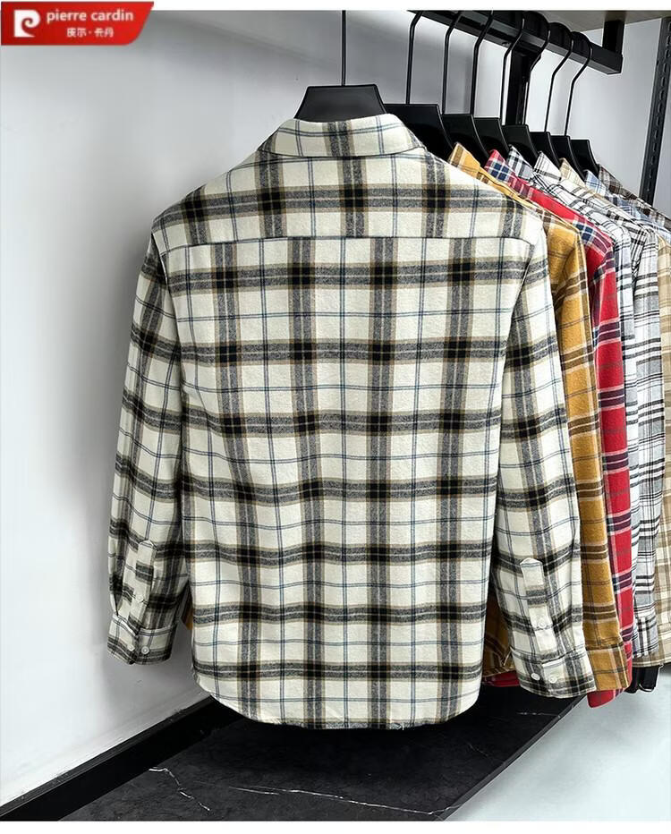 Pierre Cardin 100% cotton plaid long-sleeved shirt men's spring brushed shirt men's fashion casual no-iron inch shirt blue 100% cotton L