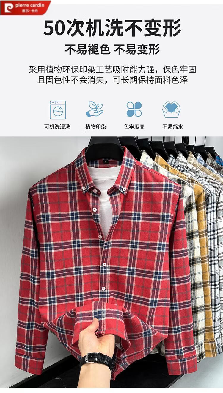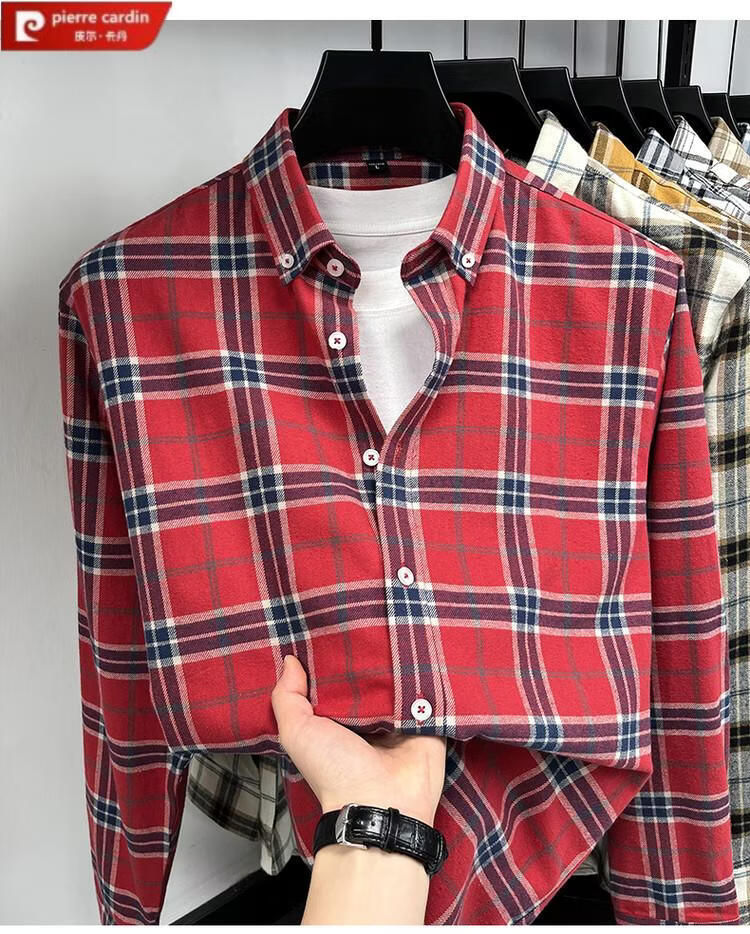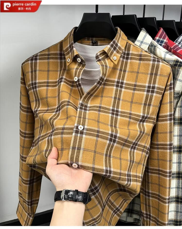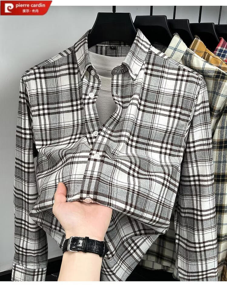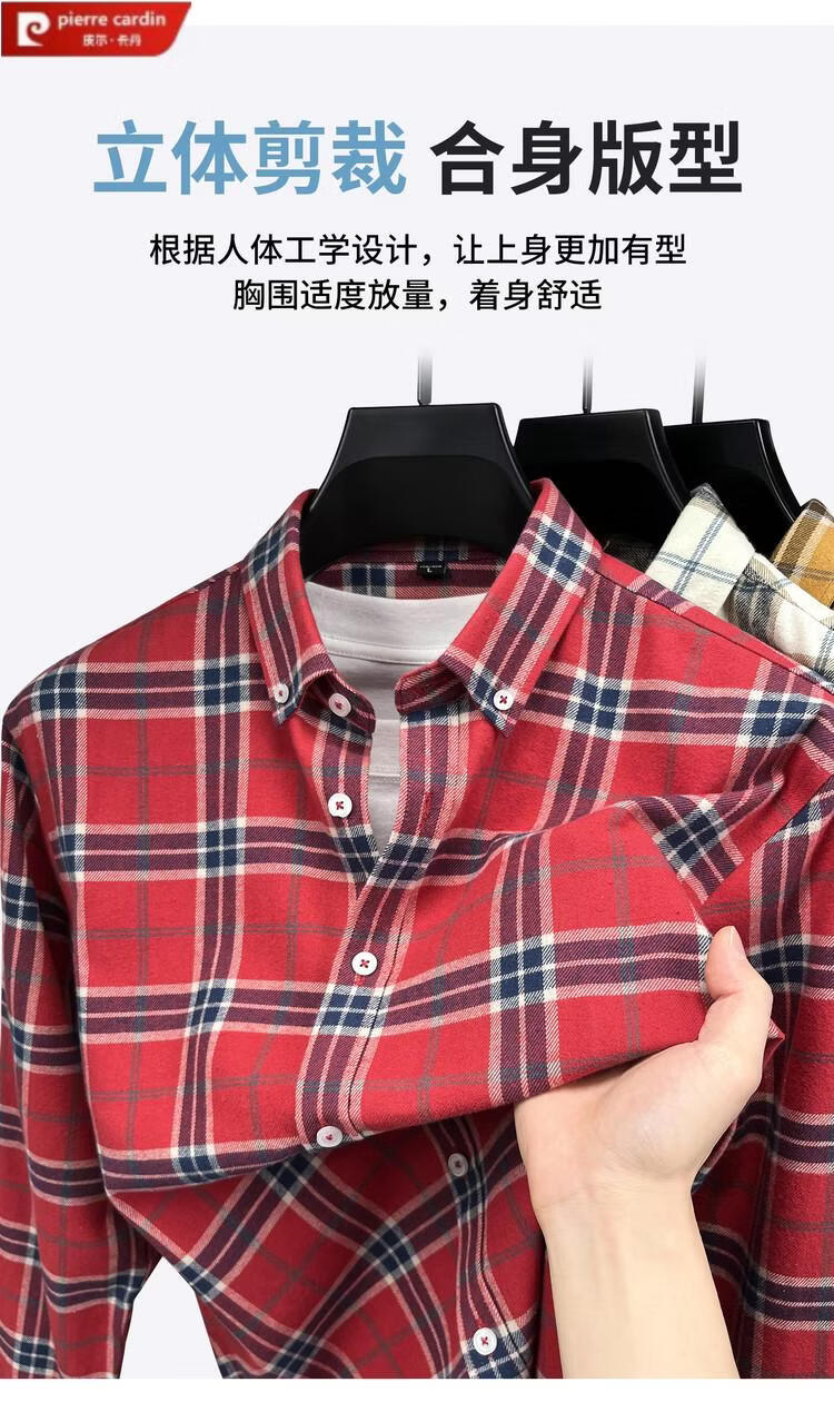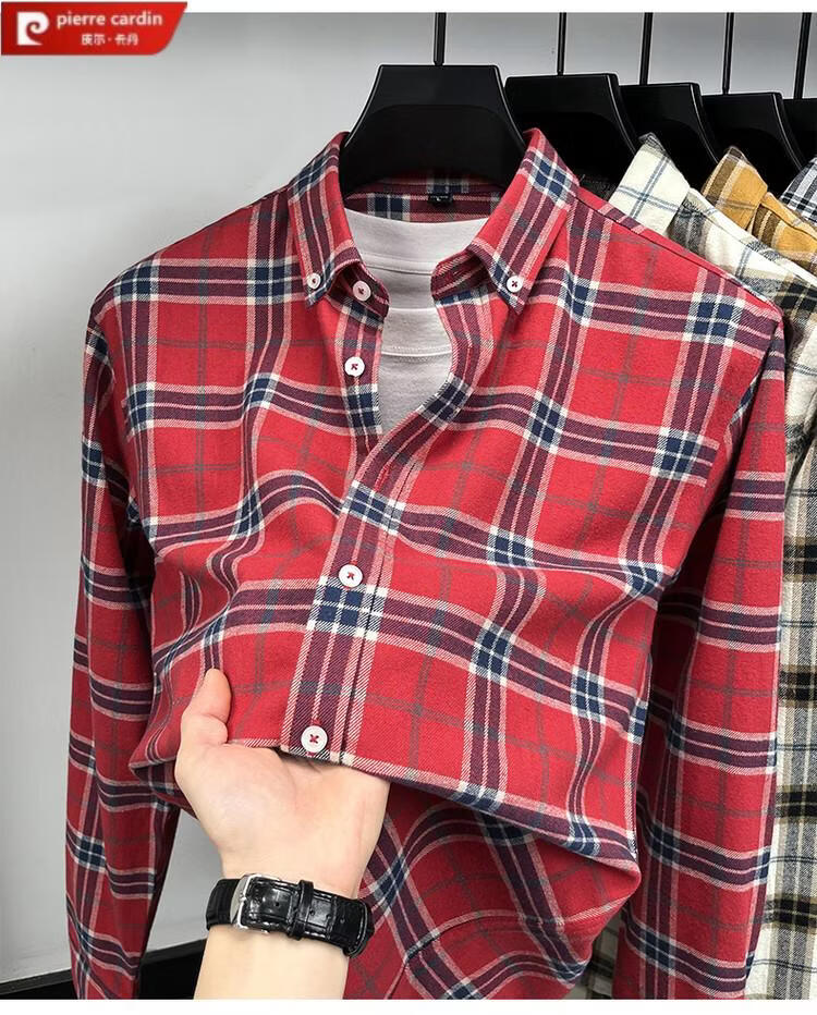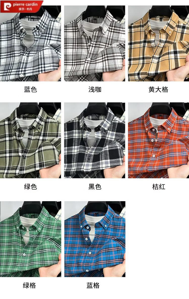 Pierre Cardin 100% cotton plaid long-sleeved shirt men's spring brushed shirt men's fashion casual no-iron inch shirt blue 100% cotton L
