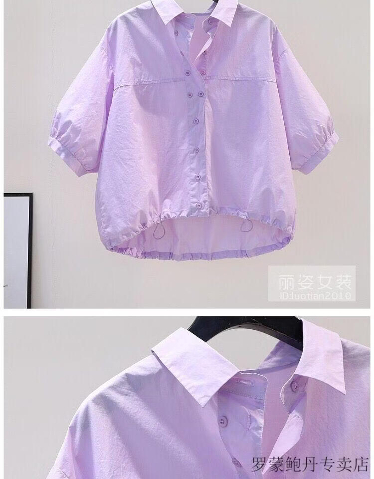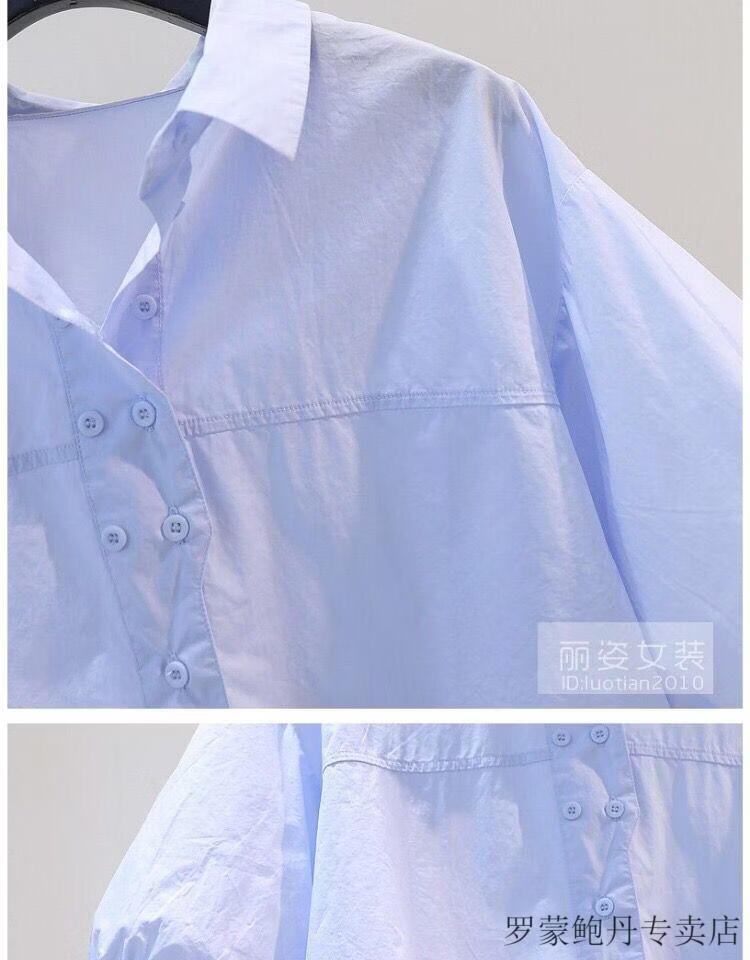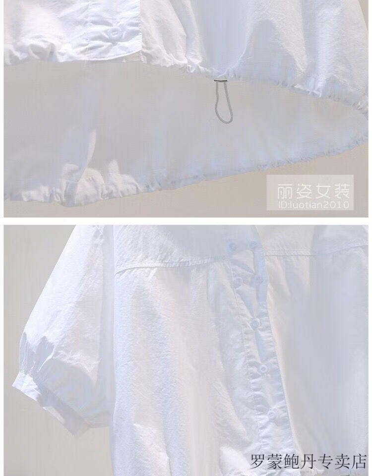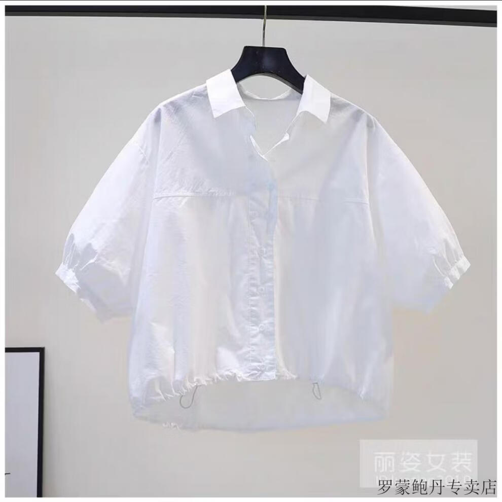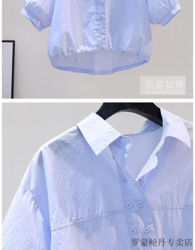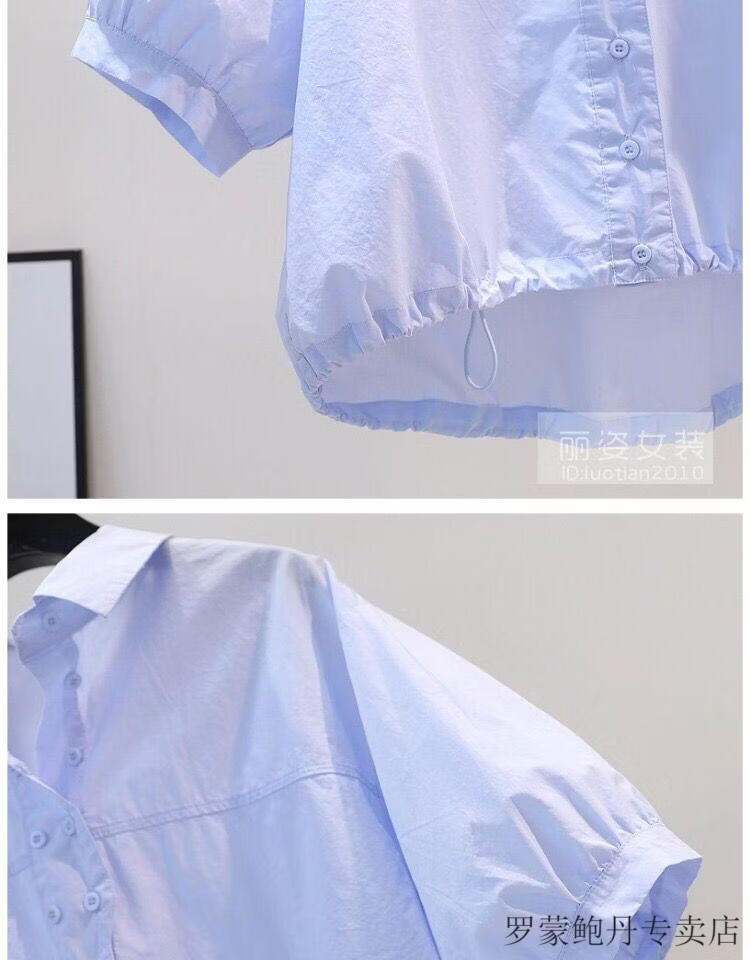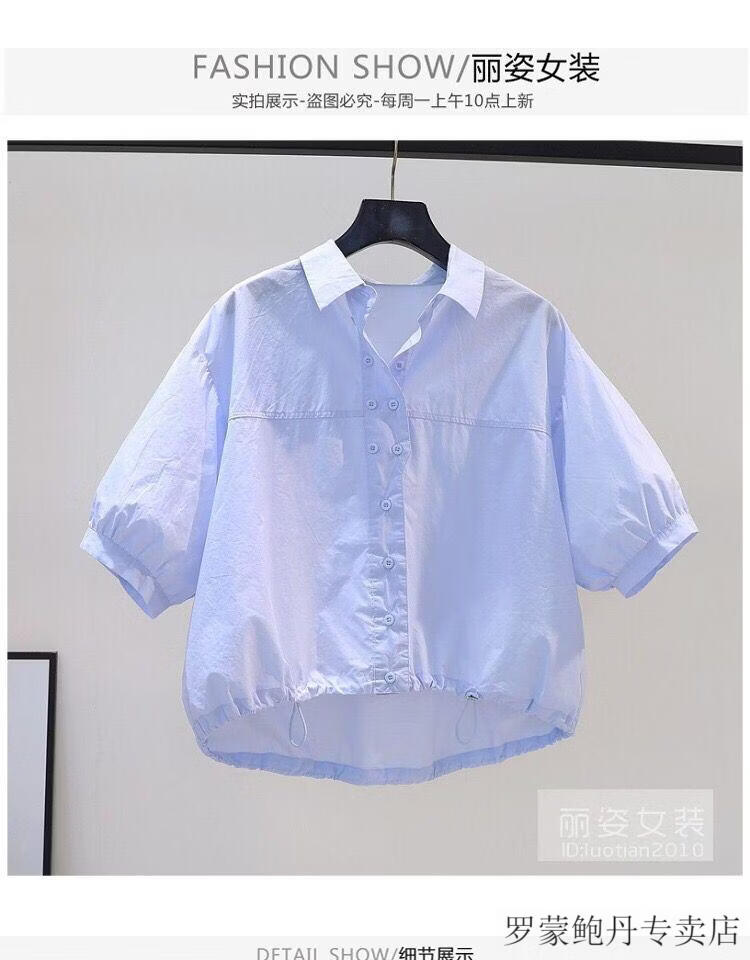 ROMON cotton shirt women's short petite 2026 summer thin hem drawstring design loose lantern sleeve shirt light blue S 80-100Jin Jin equals 0.5 kg