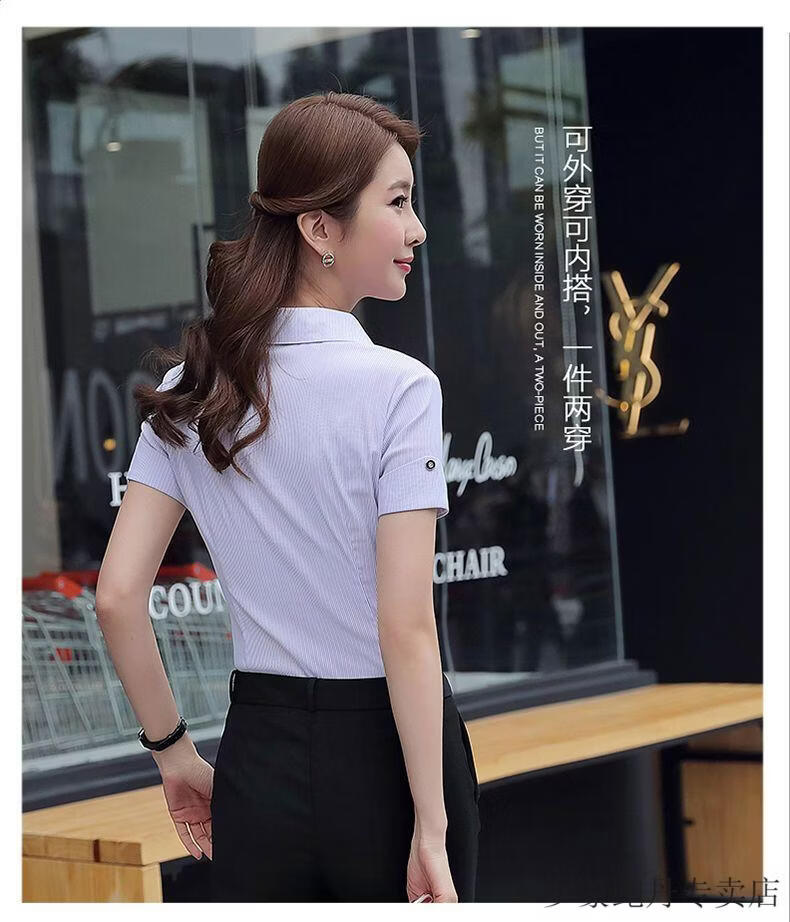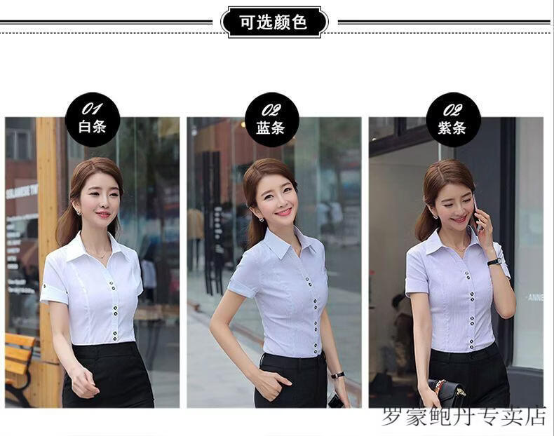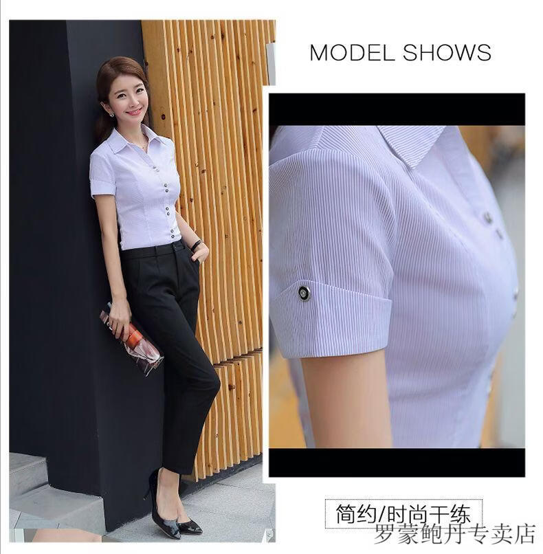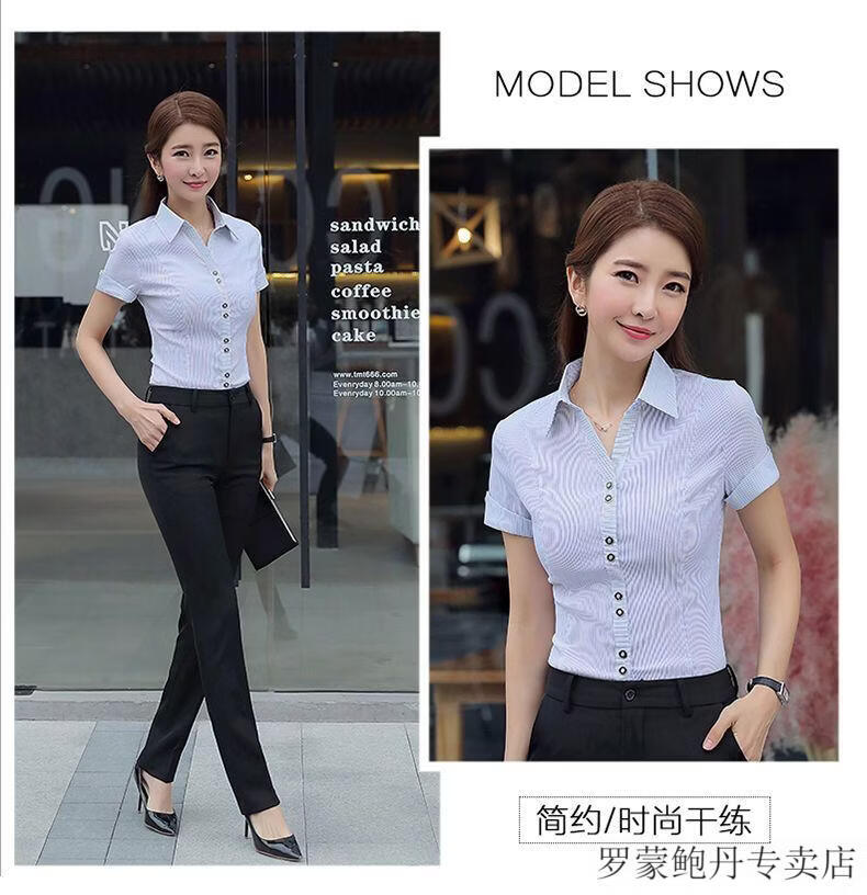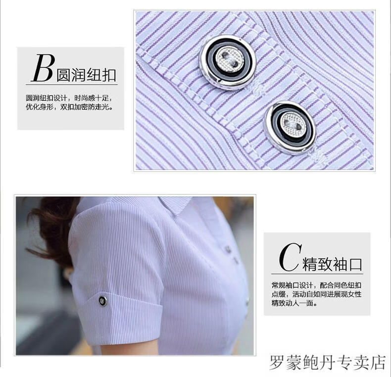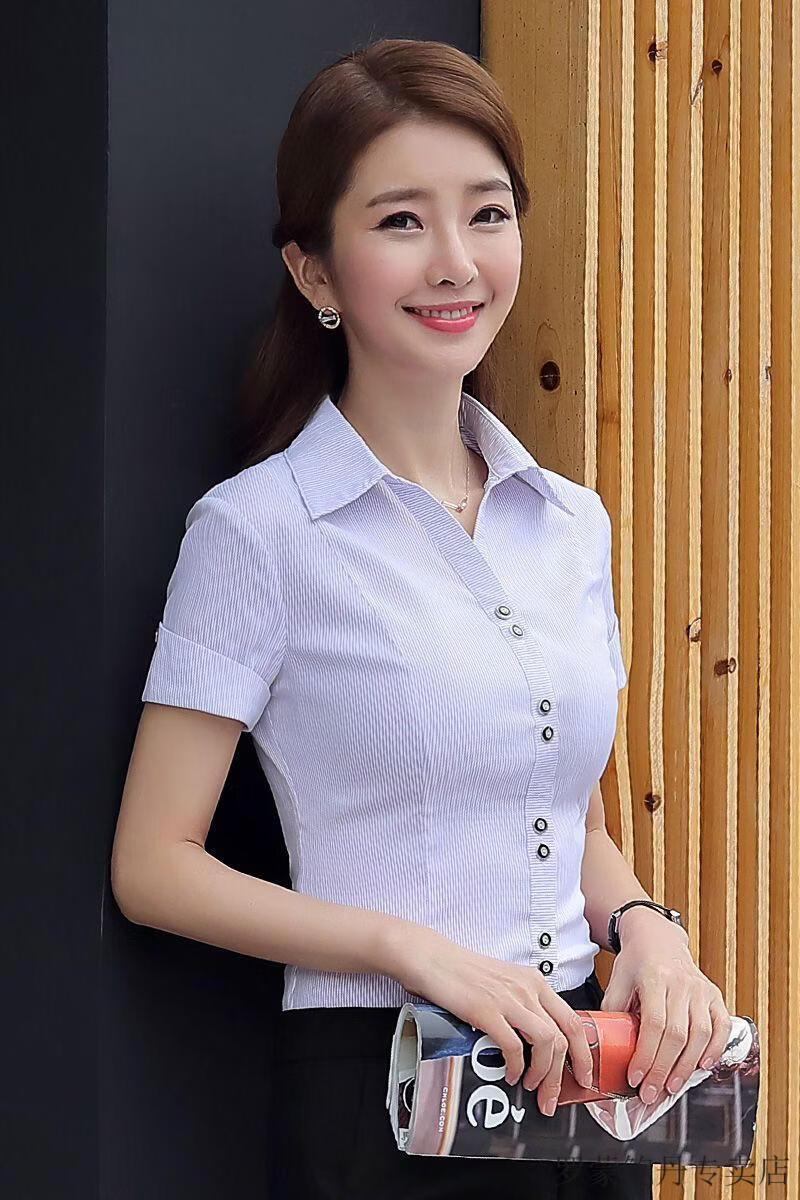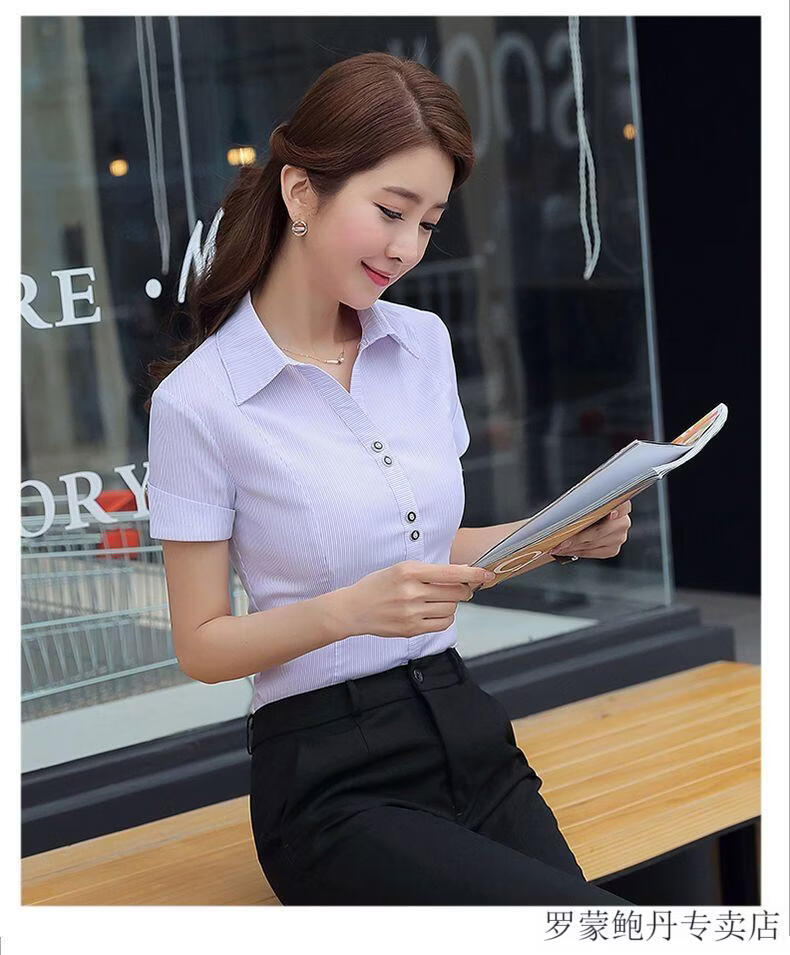 ROMON white shirt women's summer new short-sleeved top professional v-neck large size striped slim half-sleeved stretch shirt overalls purple short-sleeved S recommended 80-89Jin Jin equals 0.5 kg