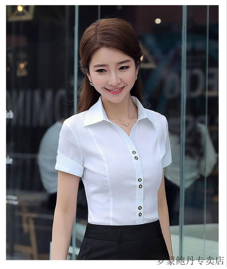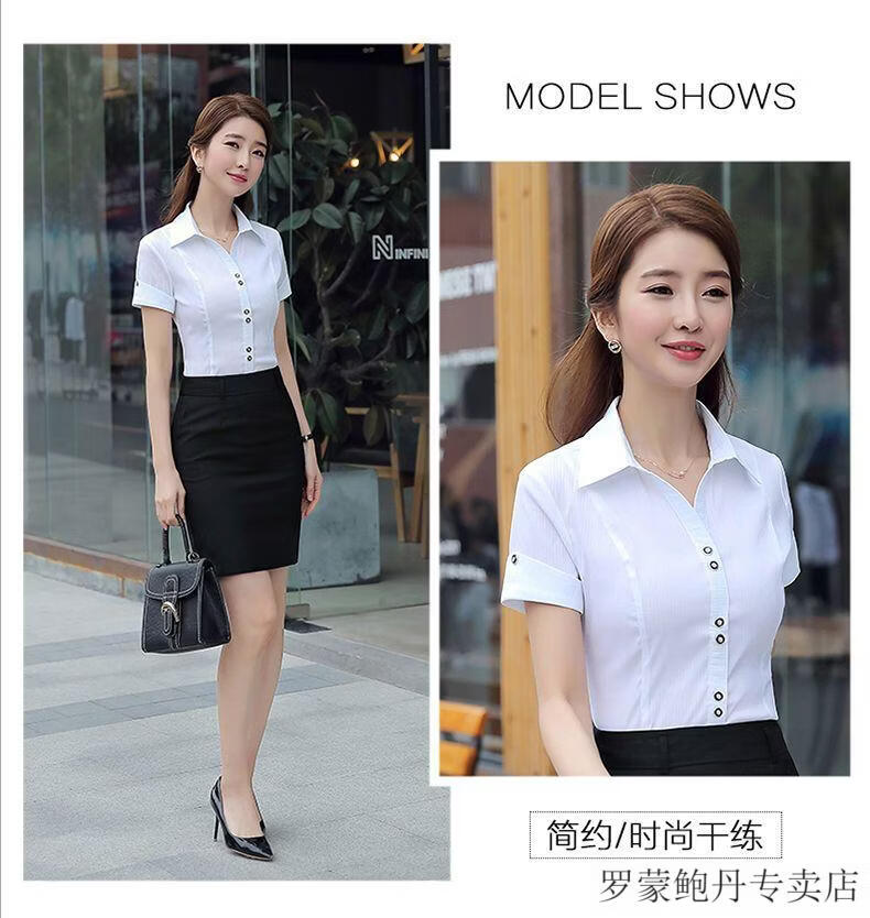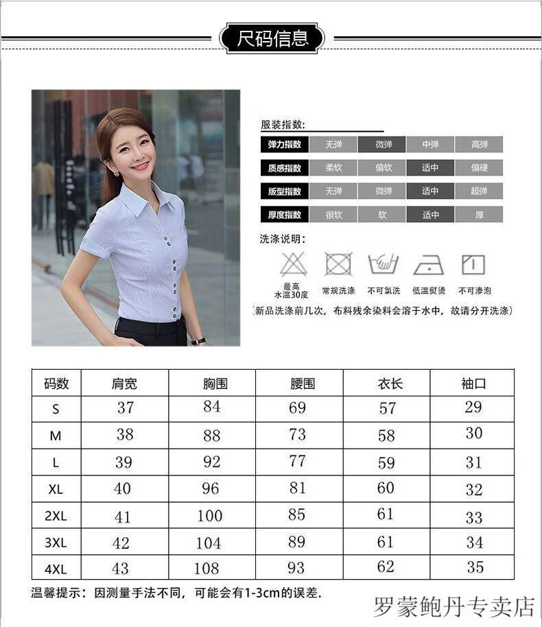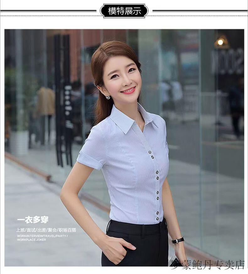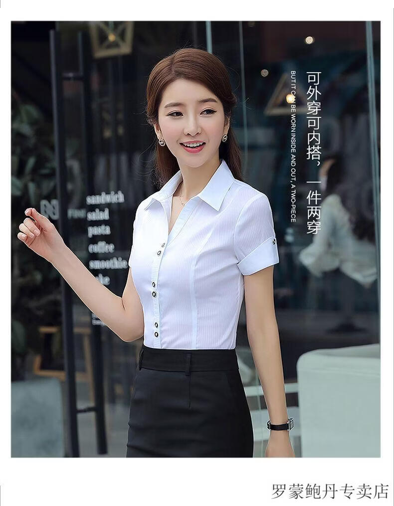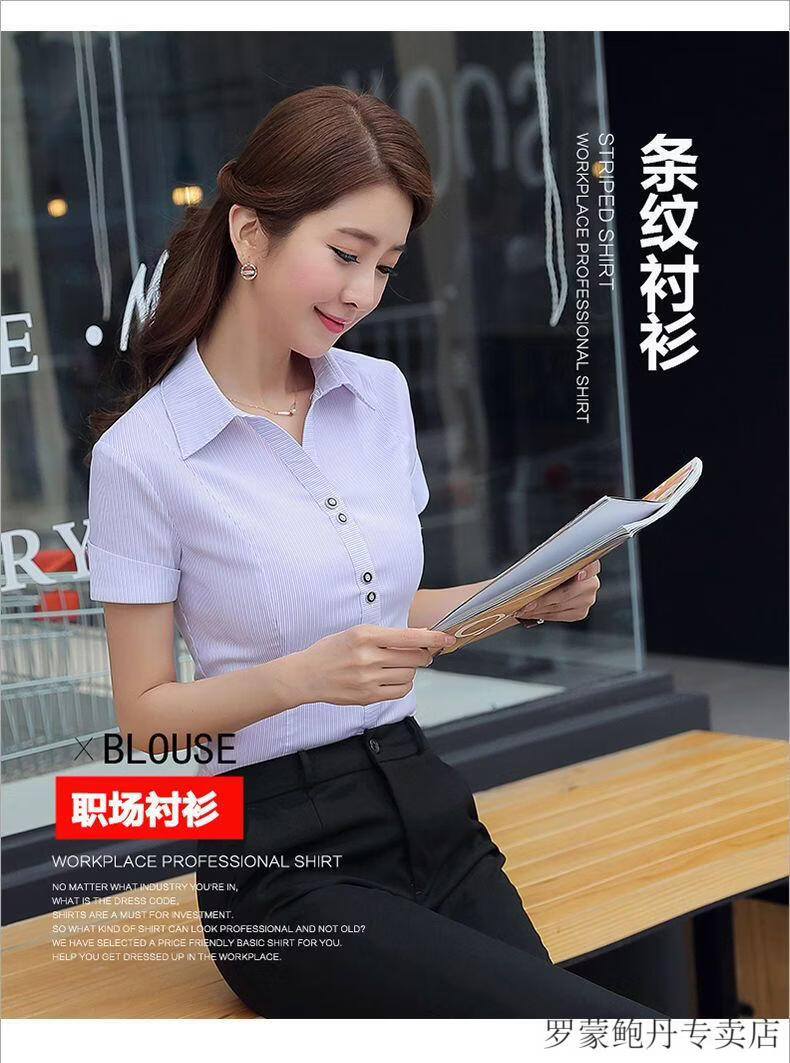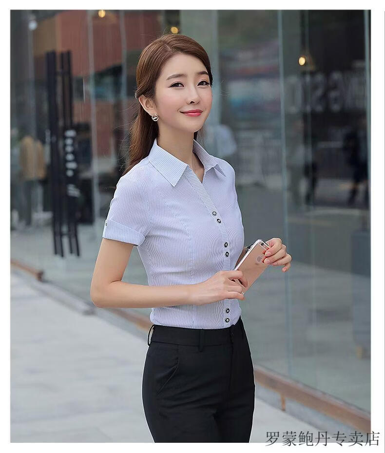ROMON white shirt women's summer new short-sleeved top professional v-neck large size striped slim half-sleeved stretch shirt overalls purple short-sleeved S recommended 80-89Jin Jin equals 0.5 kg