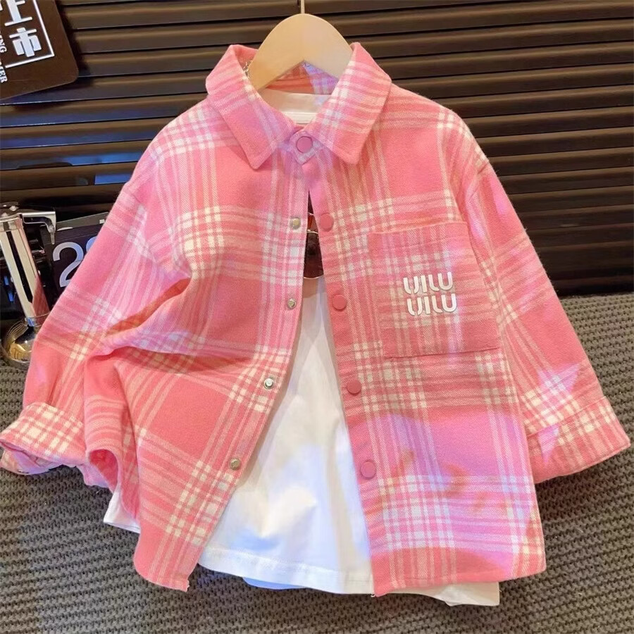 Girls' shirt spring 2026 new style children's long-sleeved plaid shirt spring and autumn coat little girl's top pink 140