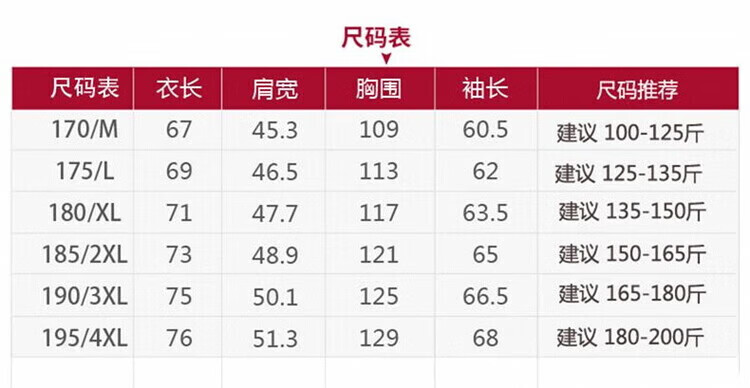 China (cm) 165 / 88-90 170 / 96-98 175 / 108-110 180 / 118-122 185 / 126-130