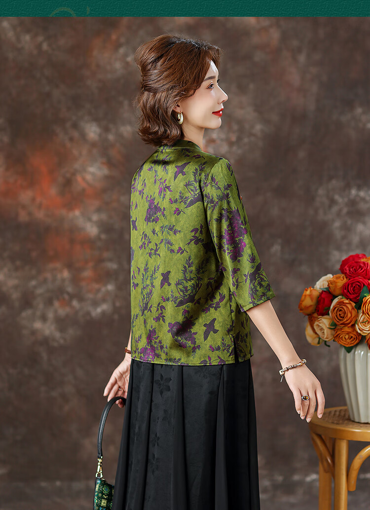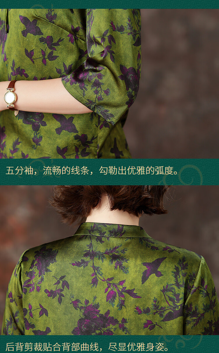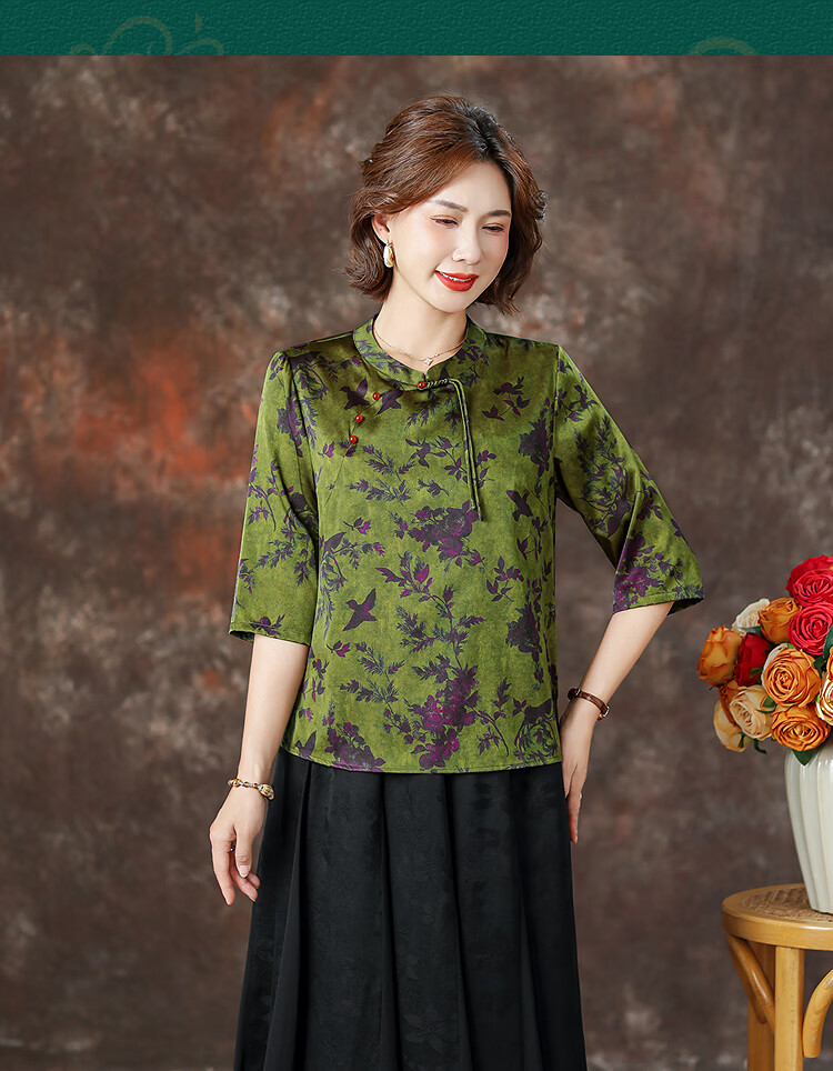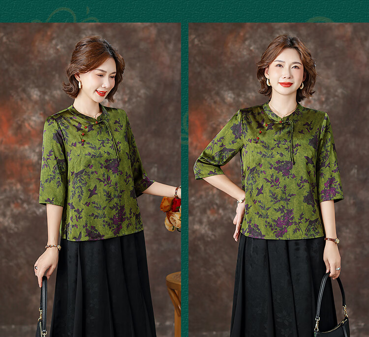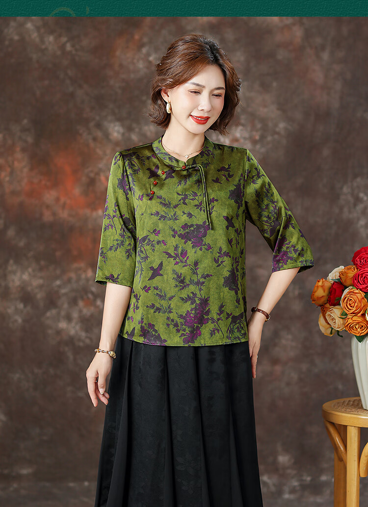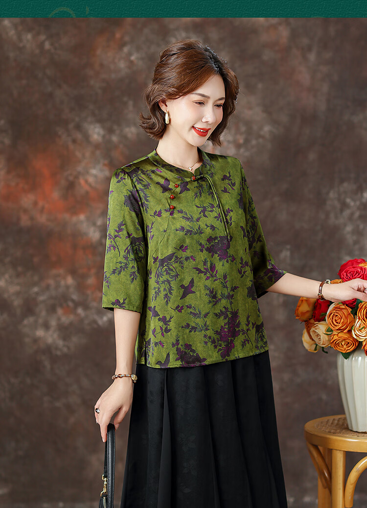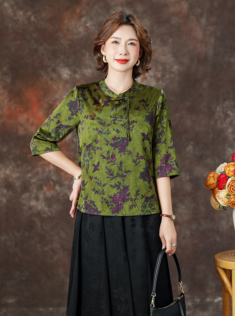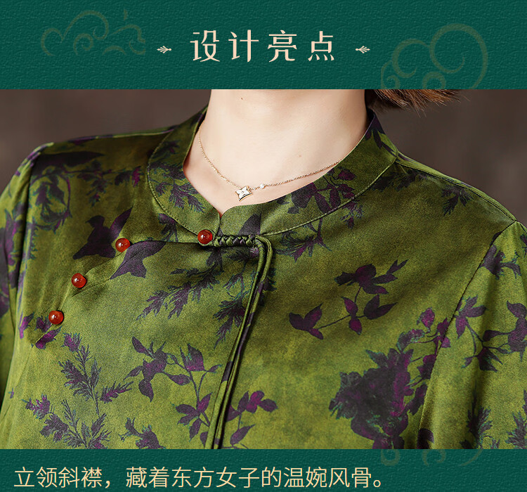 QUEDIT silk Chinese-style mulberry silk mid-sleeve shirt 2026 new stand-up collar plate-button oblique placket flower and bird print top Qingtang Ningzi/21 Mumi silk stretch satin L Recommended 110Jin Jin is equal to within 0.5 kg