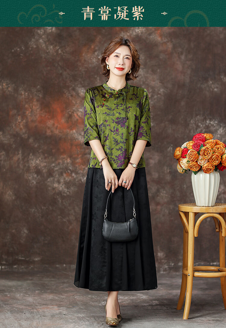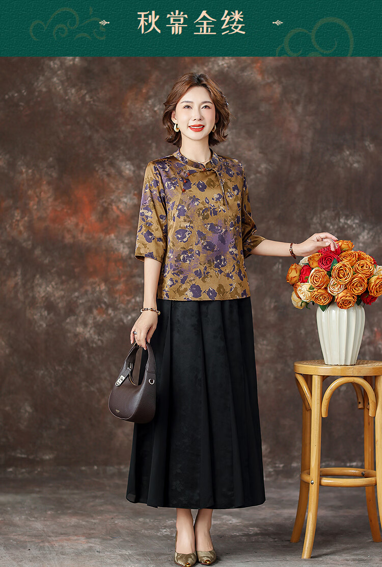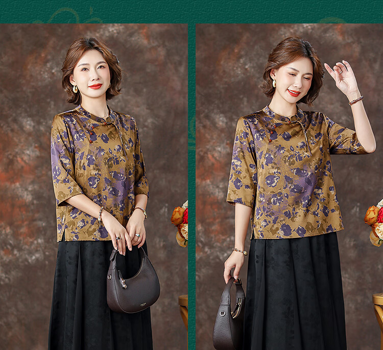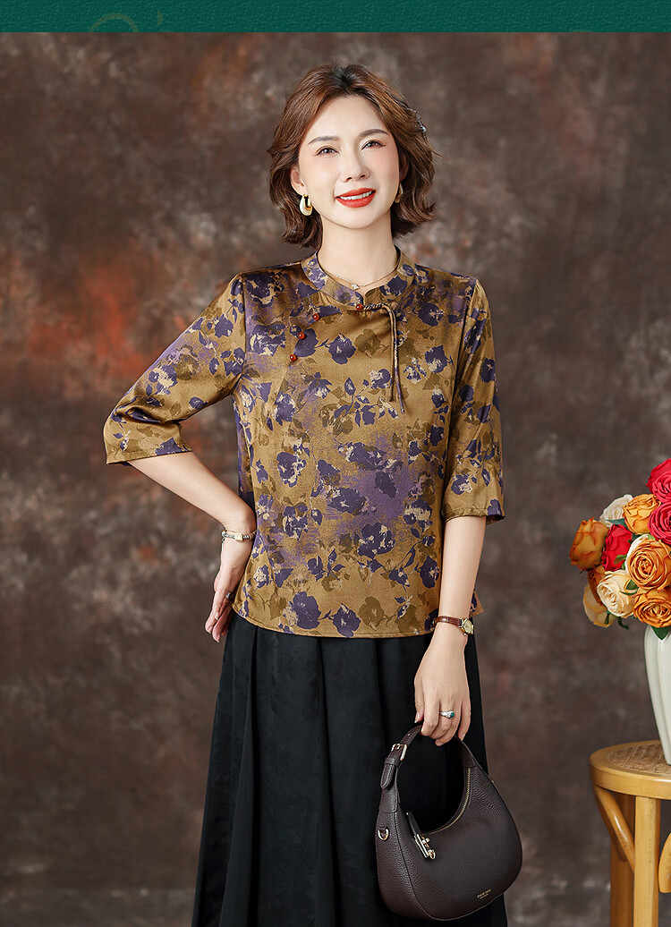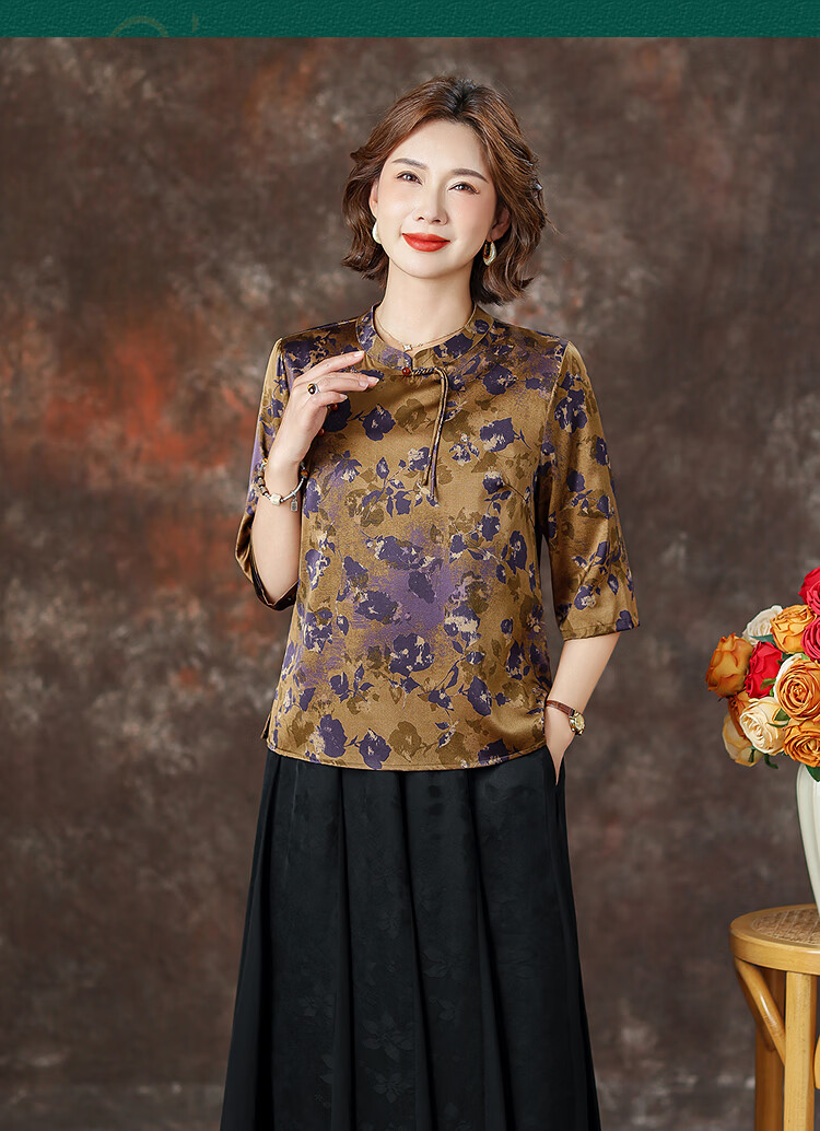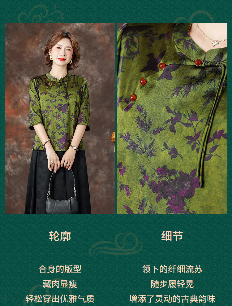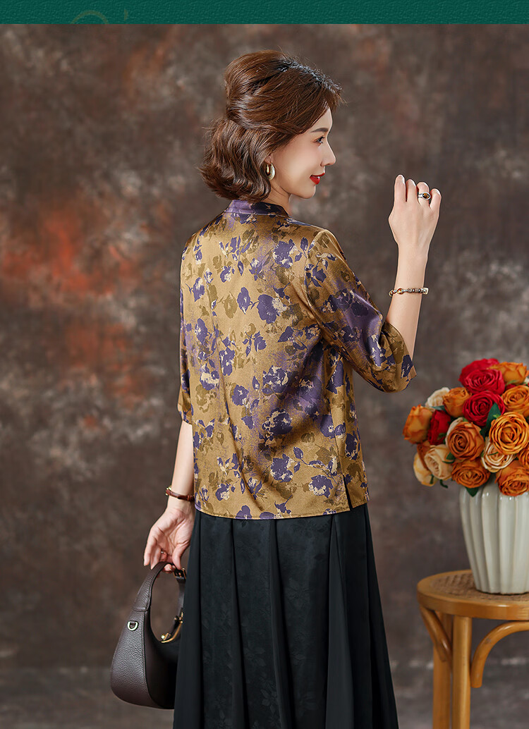 QUEDIT silk Chinese-style mulberry silk mid-sleeve shirt 2026 new stand-up collar plate-button oblique placket flower and bird print top Qingtang Ningzi/21 Mumi silk stretch satin L Recommended 110Jin Jin is equal to within 0.5 kg