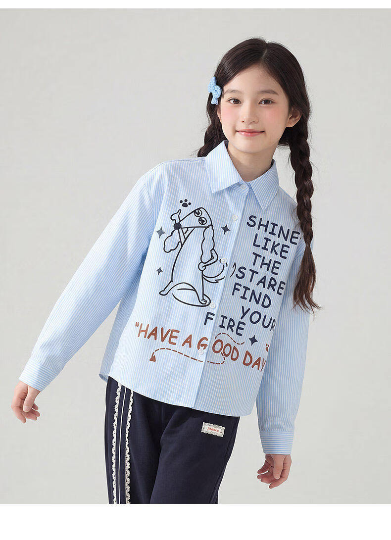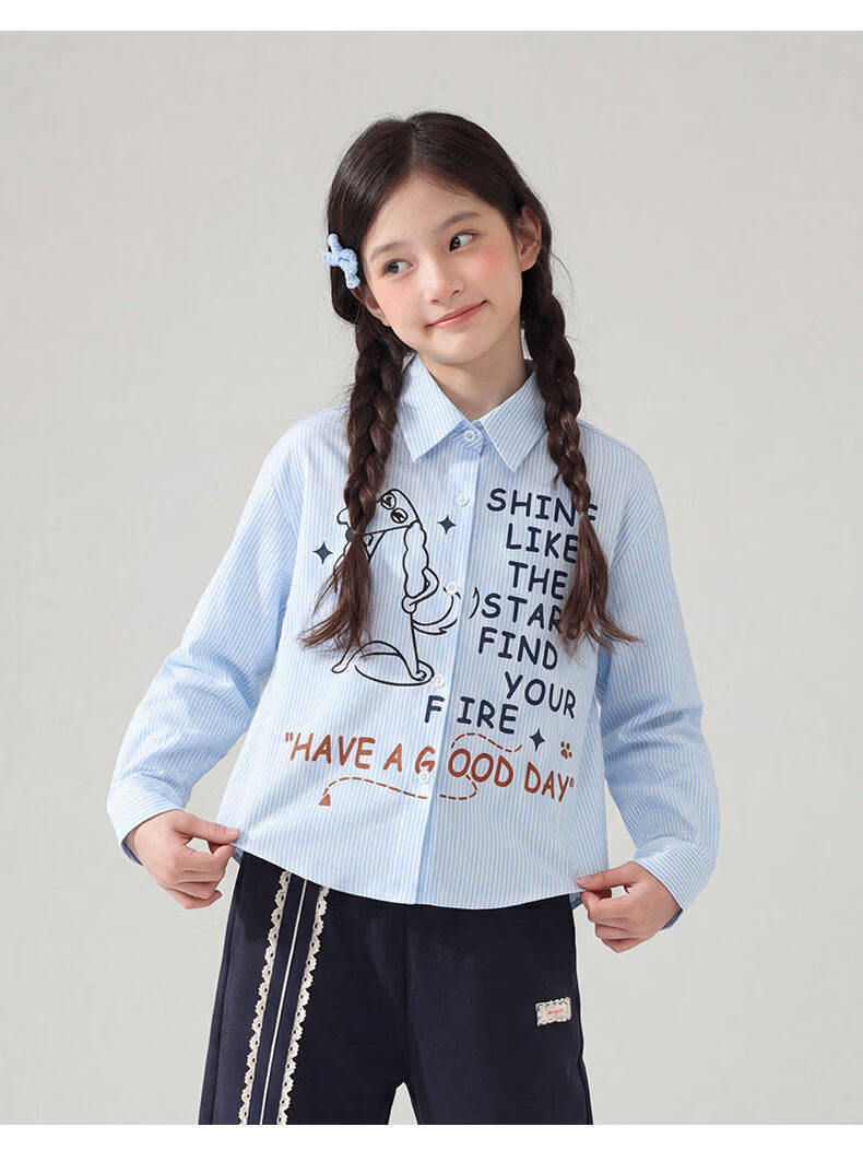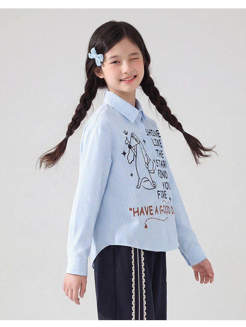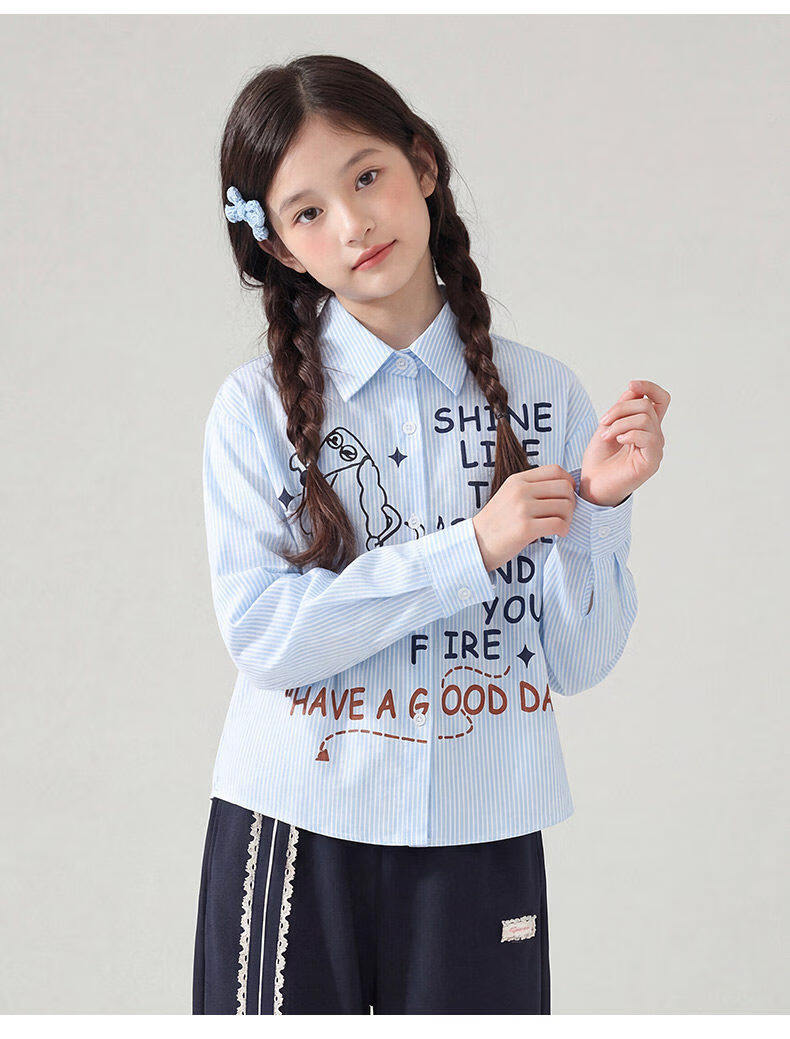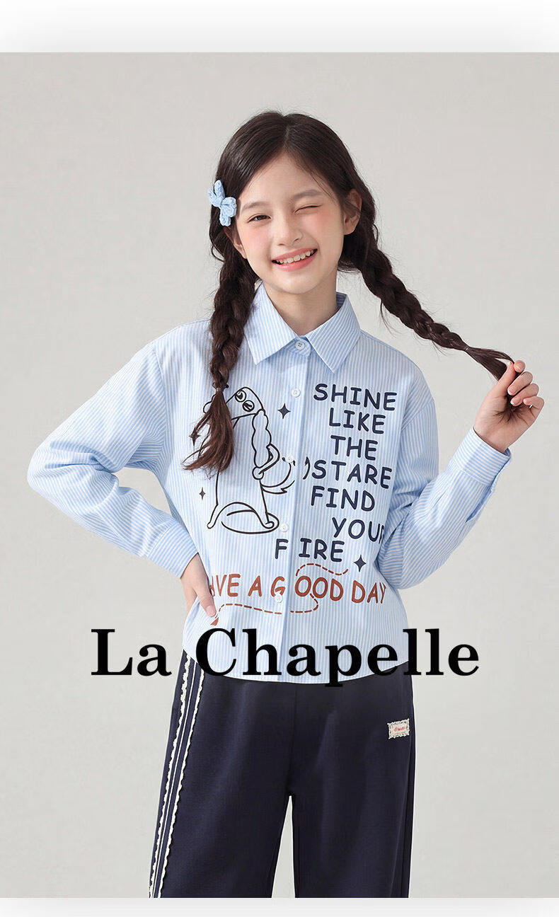 La Chapelle girls super good-looking shirt jacket 2026 new big children's long-sleeved tops versatile girls spring and autumn Korean version light blue strips cute graffiti print can be worn inside or as a jacket 140 130-140cm, recommended 30-35KG