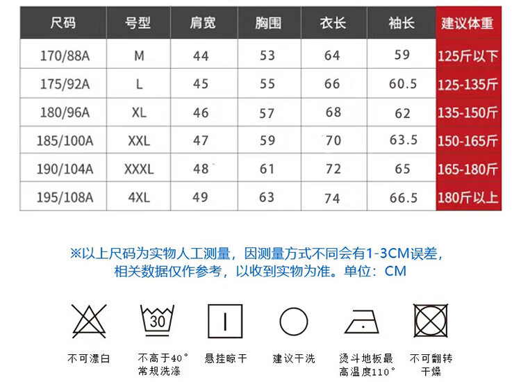 China (cm) 165 / 88-90 170 / 96-98 175 / 108-110 180 / 118-122 185 / 126-130