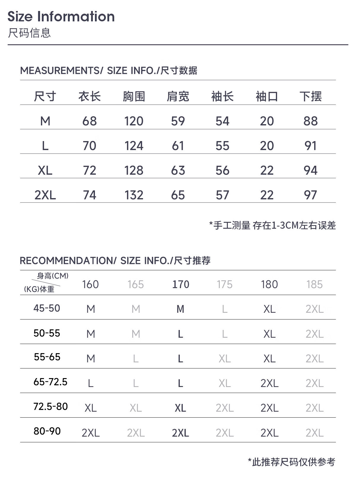 China (cm) 160-165/84-86 165-170 / 88-90 167-172 / 92-96 168-173 / 98-102 170-176 / 106-110