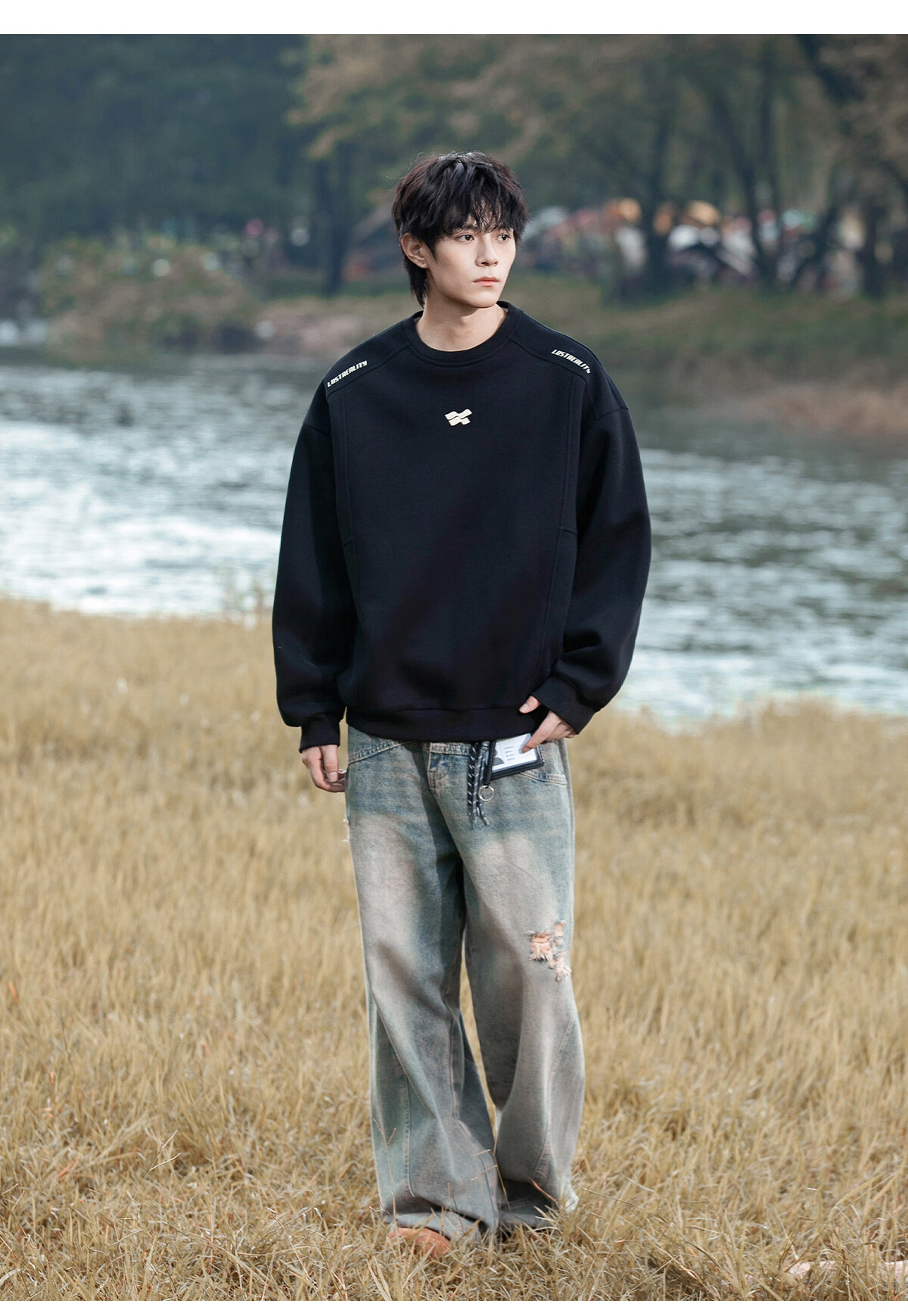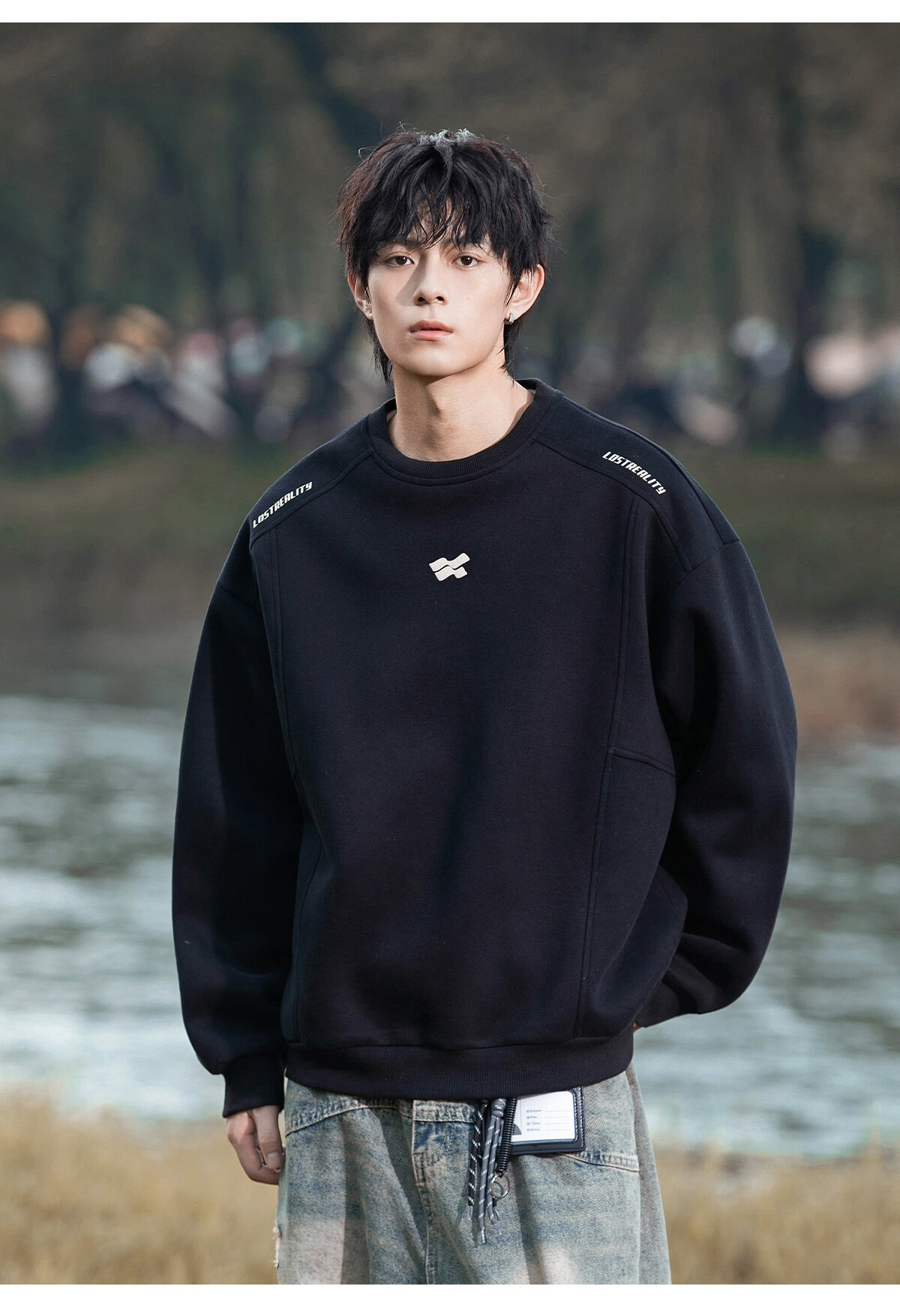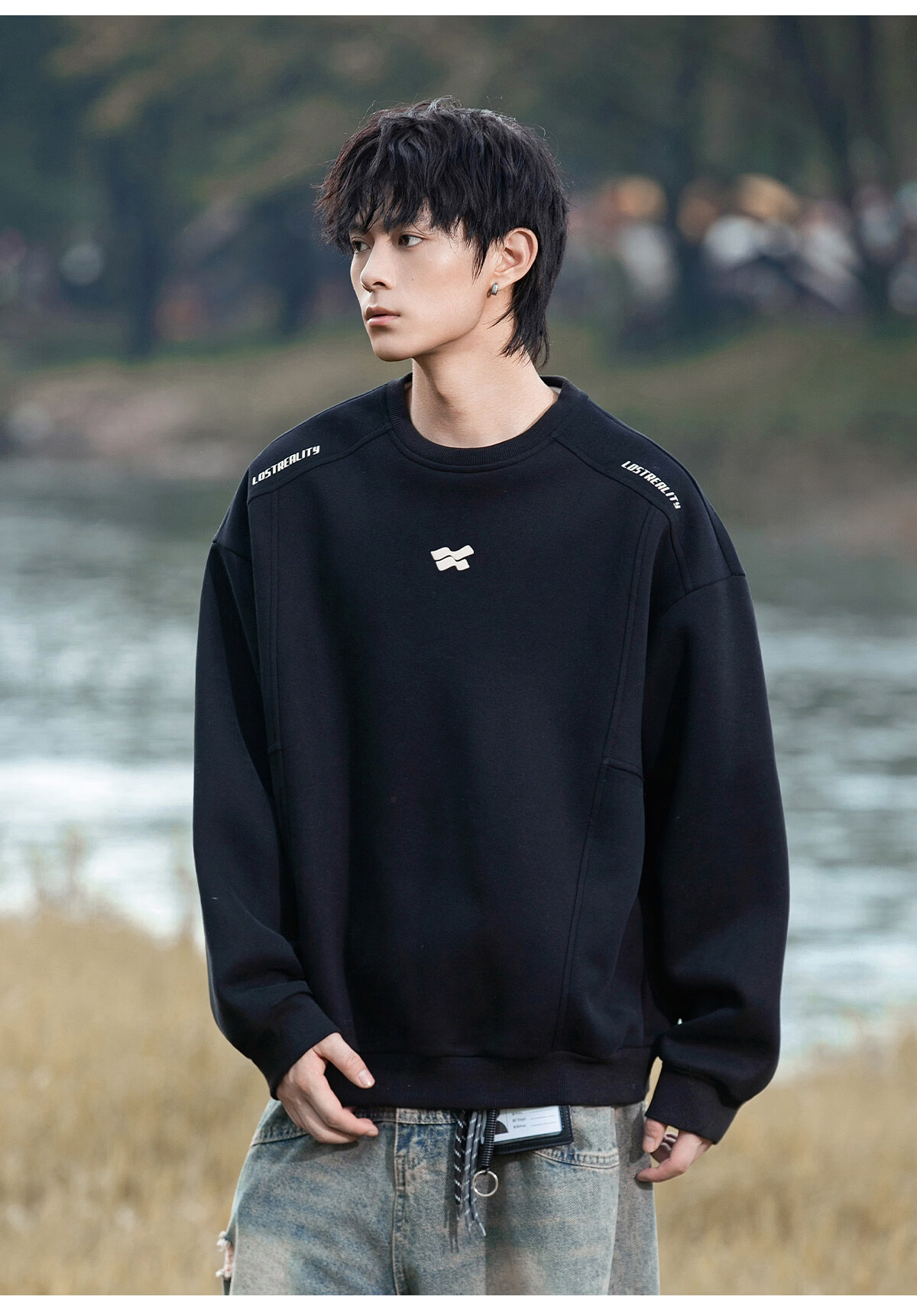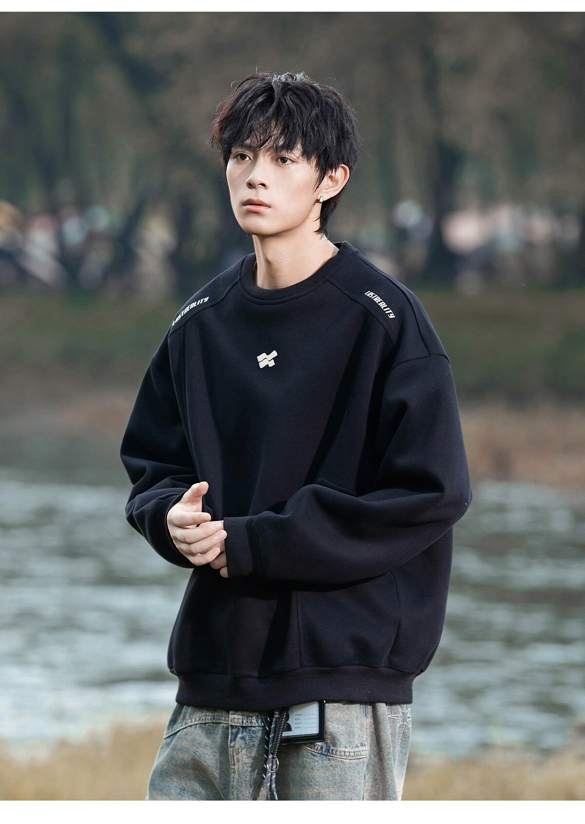 Playboy 400g American heavyweight men's sweatshirt high street trendy casual loose couple top spring American round neck jacket black M