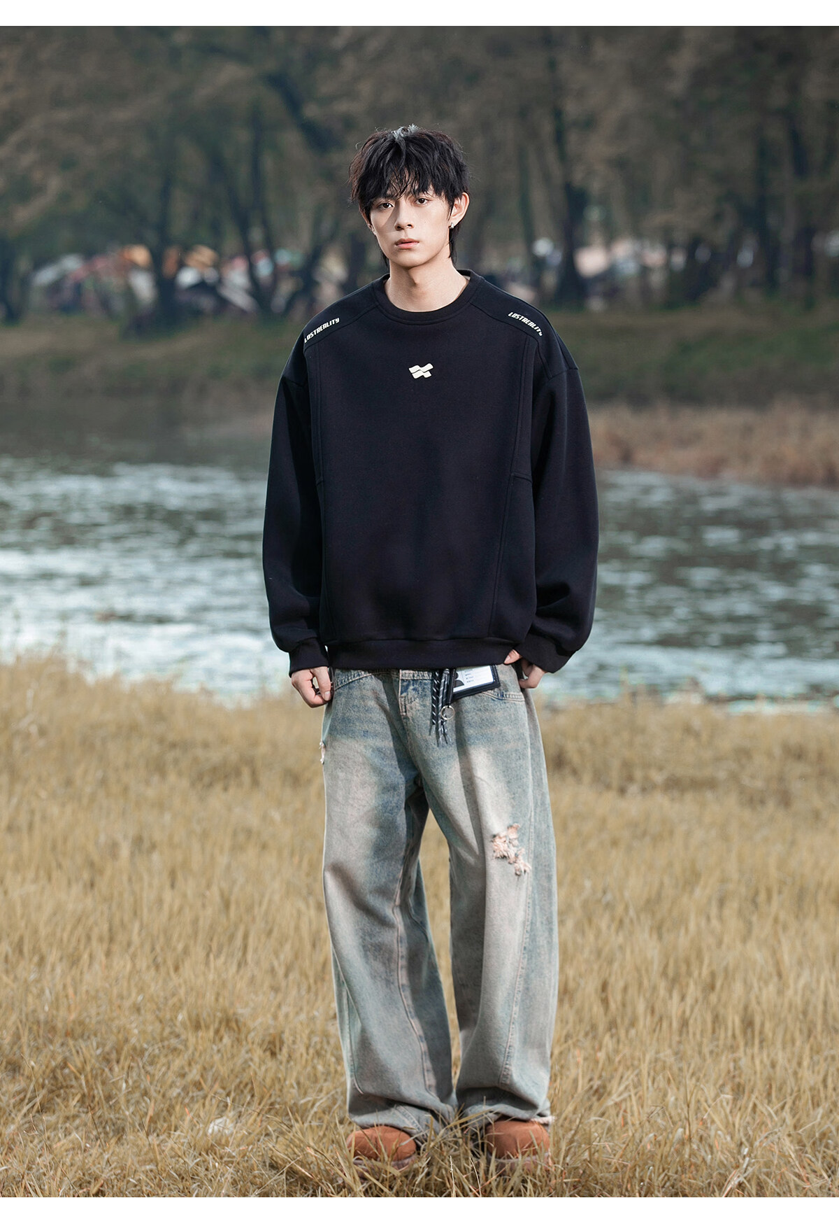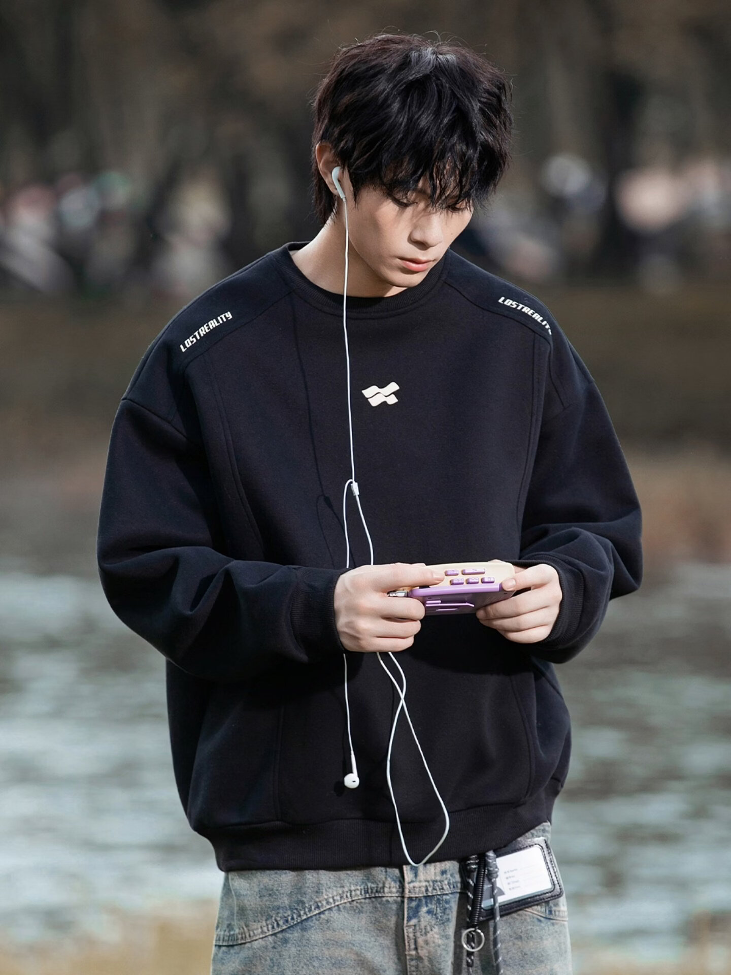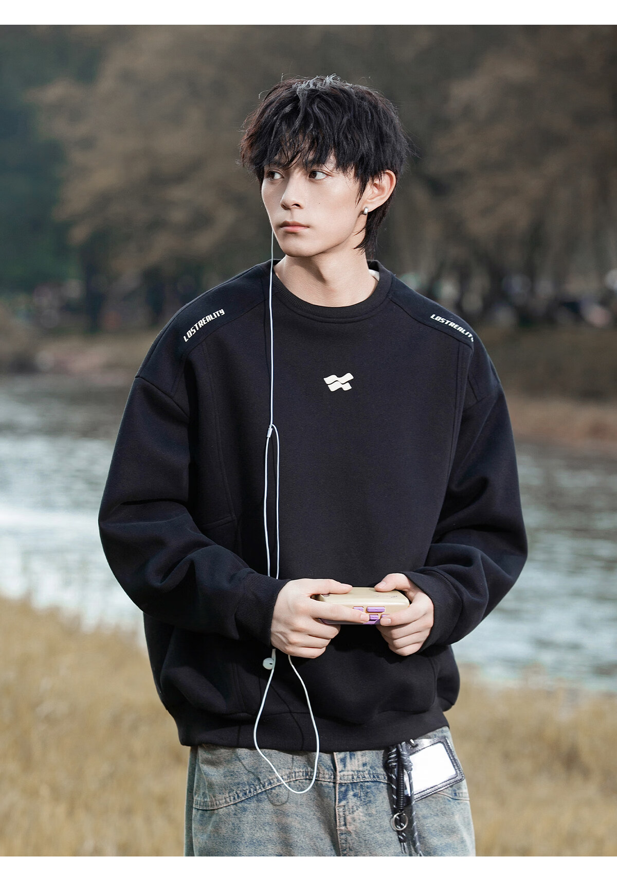 Playboy 400g American heavyweight men's sweatshirt high street trendy casual loose couple top spring American round neck jacket black M