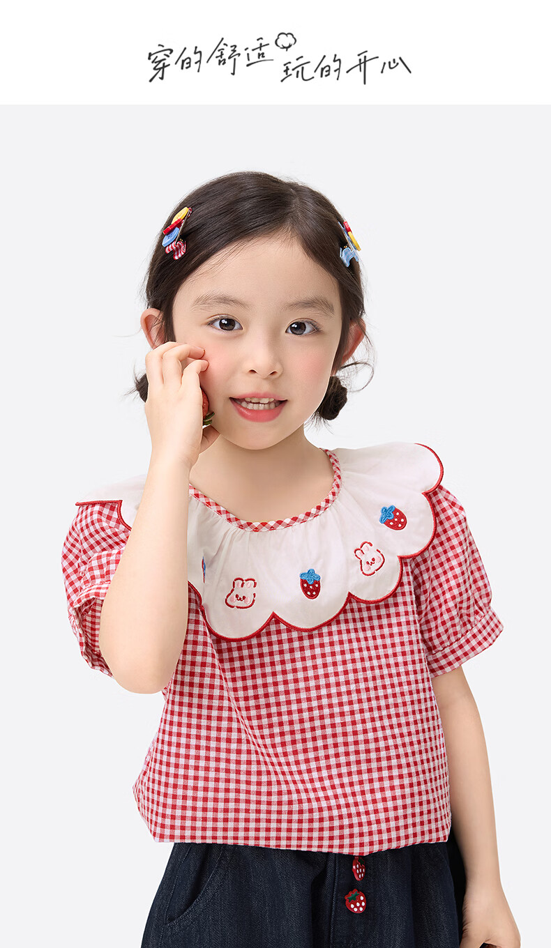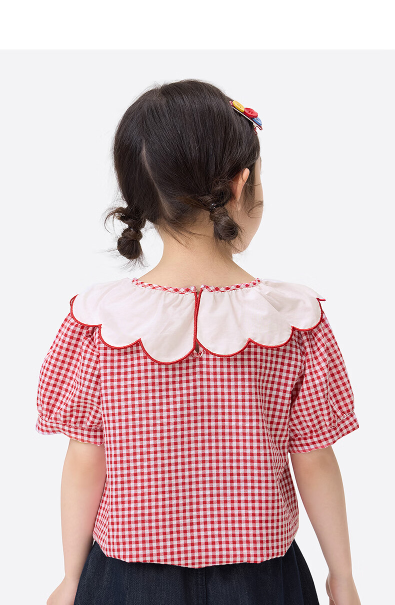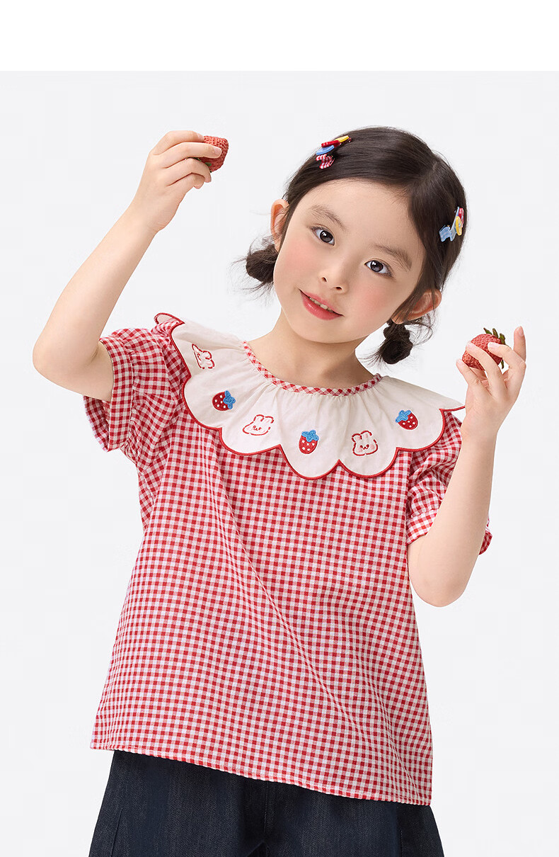 Xiaoyinman children's clothing girls cartoon wave collar shirt breathable 26 years old children's loose casual short-sleeved top red plaid 140