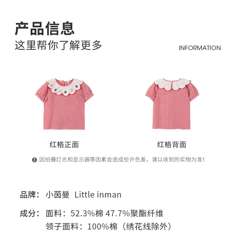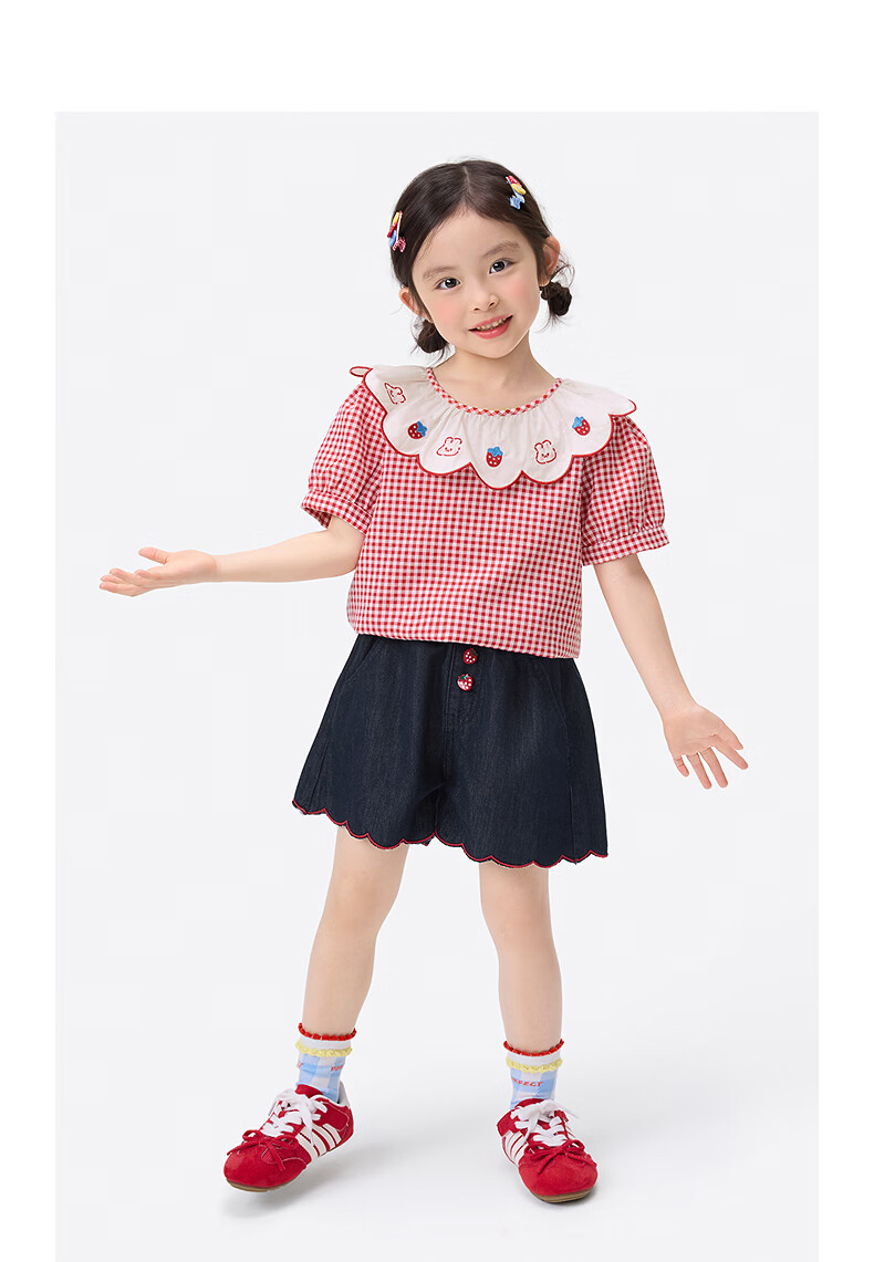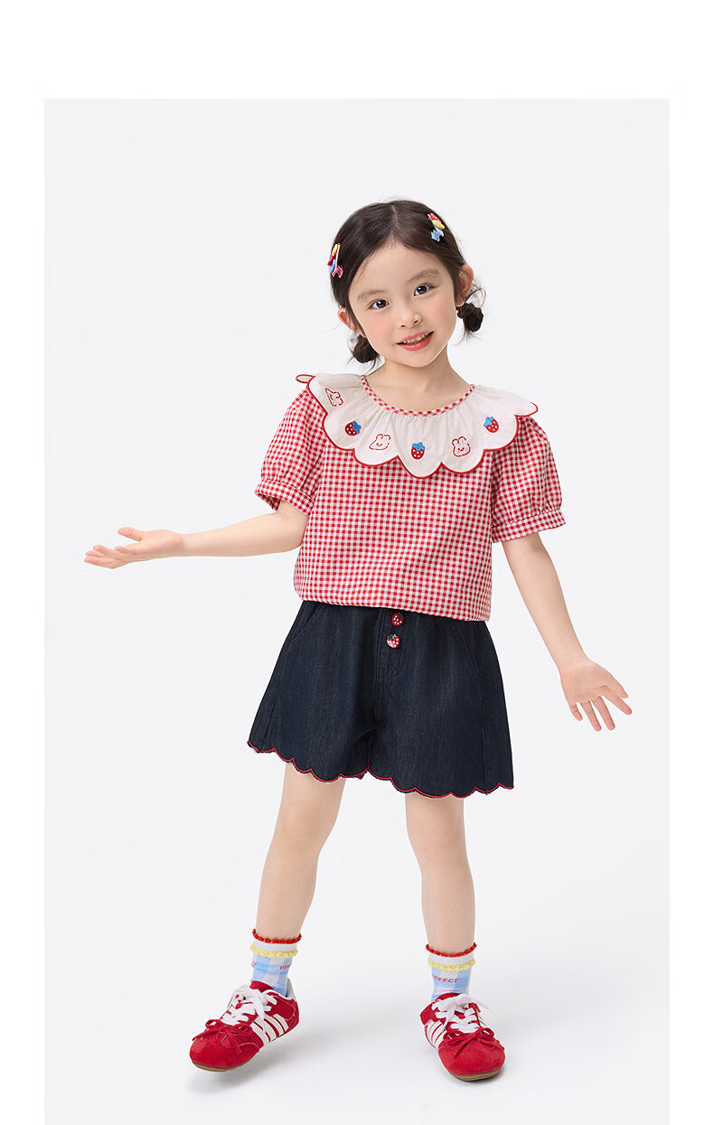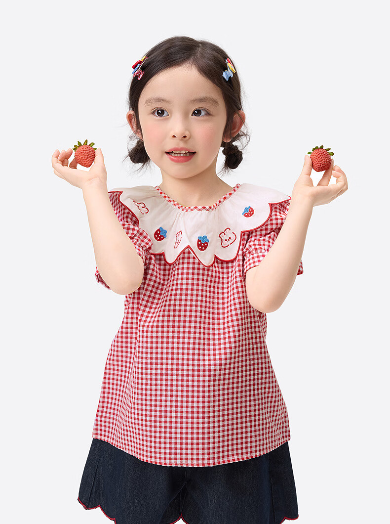 Xiaoyinman children's clothing girls cartoon wave collar shirt breathable 26 years old children's loose casual short-sleeved top red plaid 140