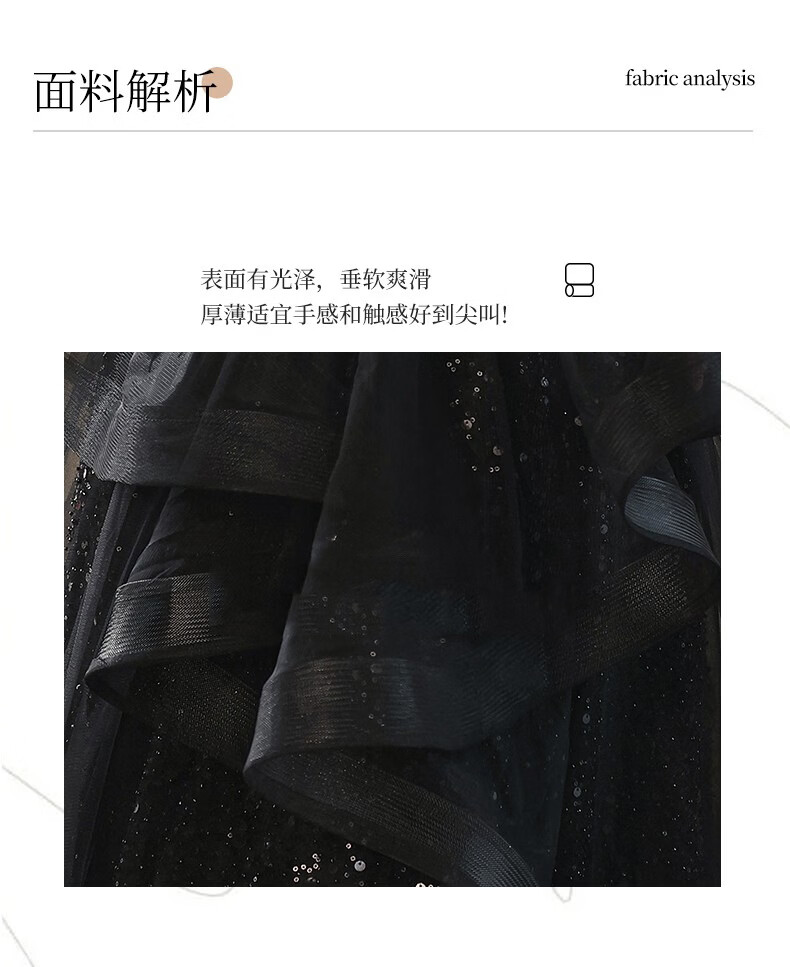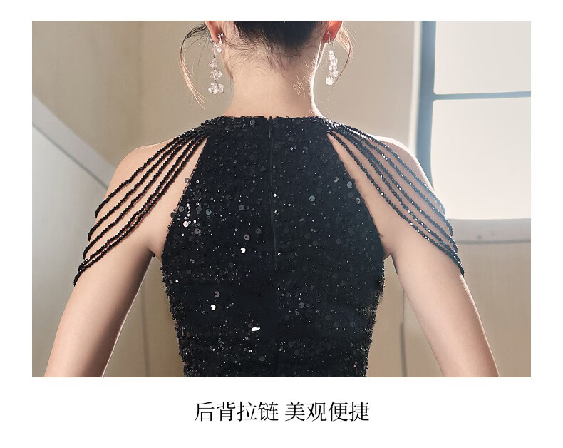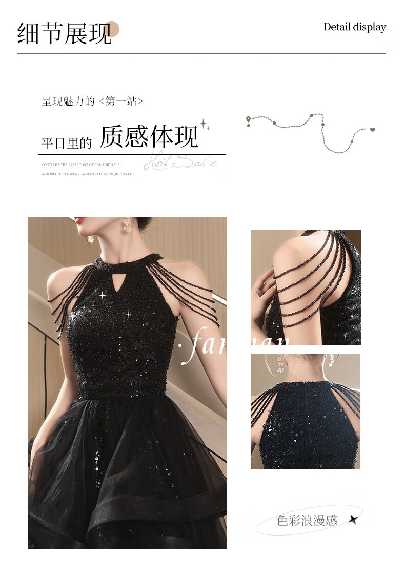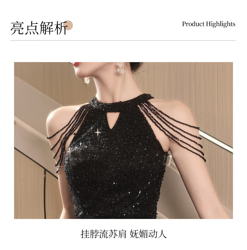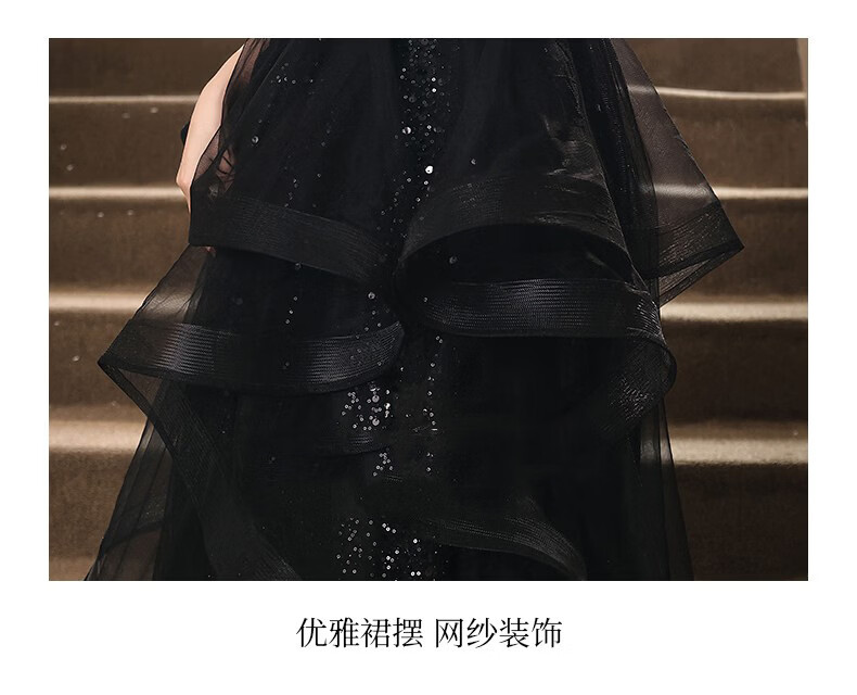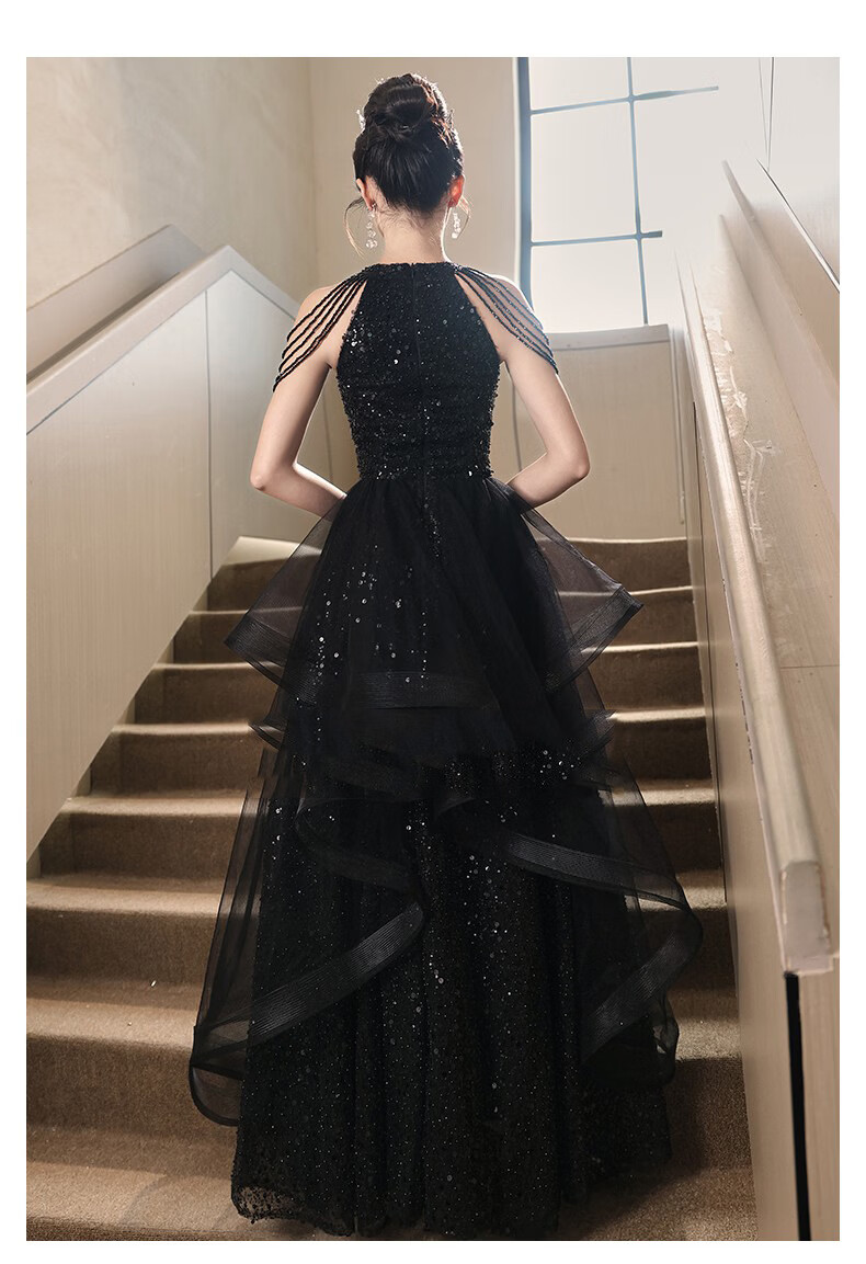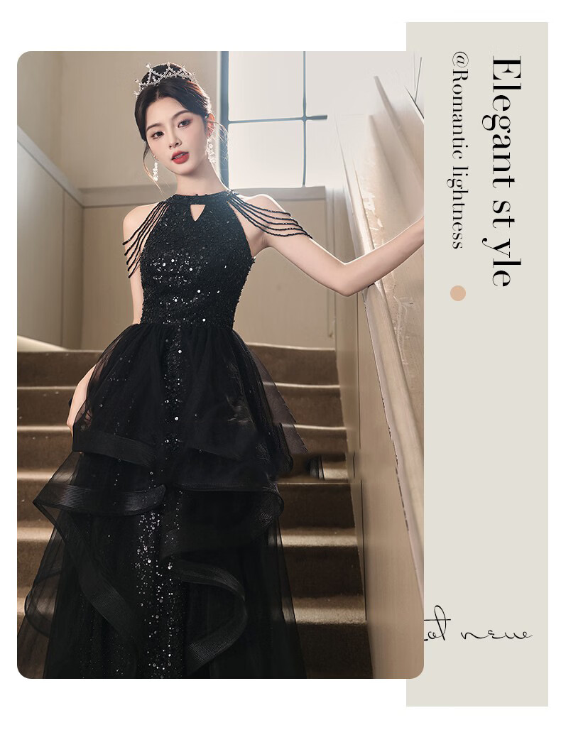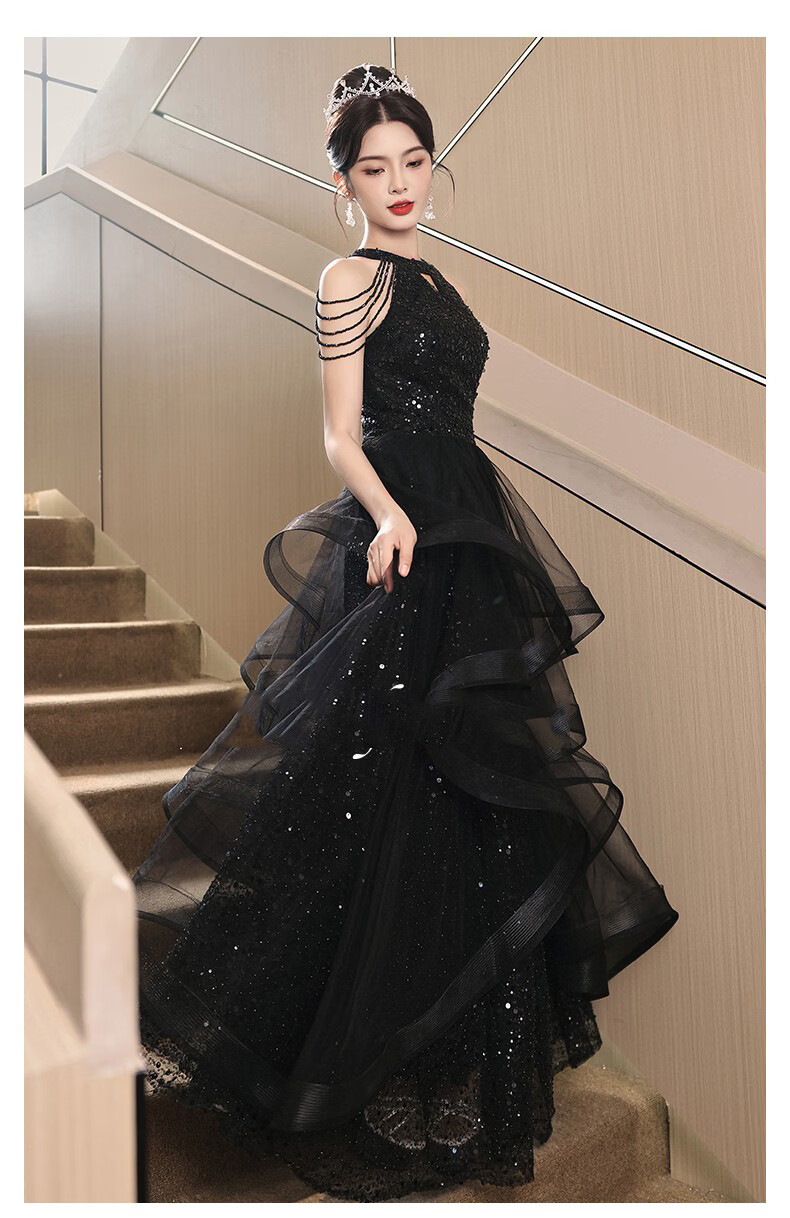 UKUHPK Black Banquet Evening Dress 2026 New Sequined Tassel Puff Skirt Art Exam Annual Meeting Performance Dress Black XL
