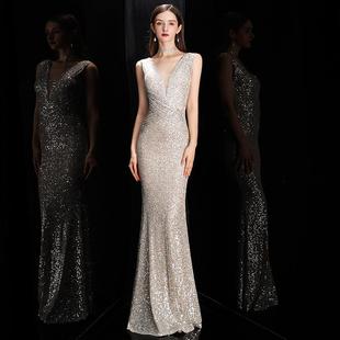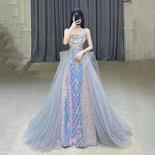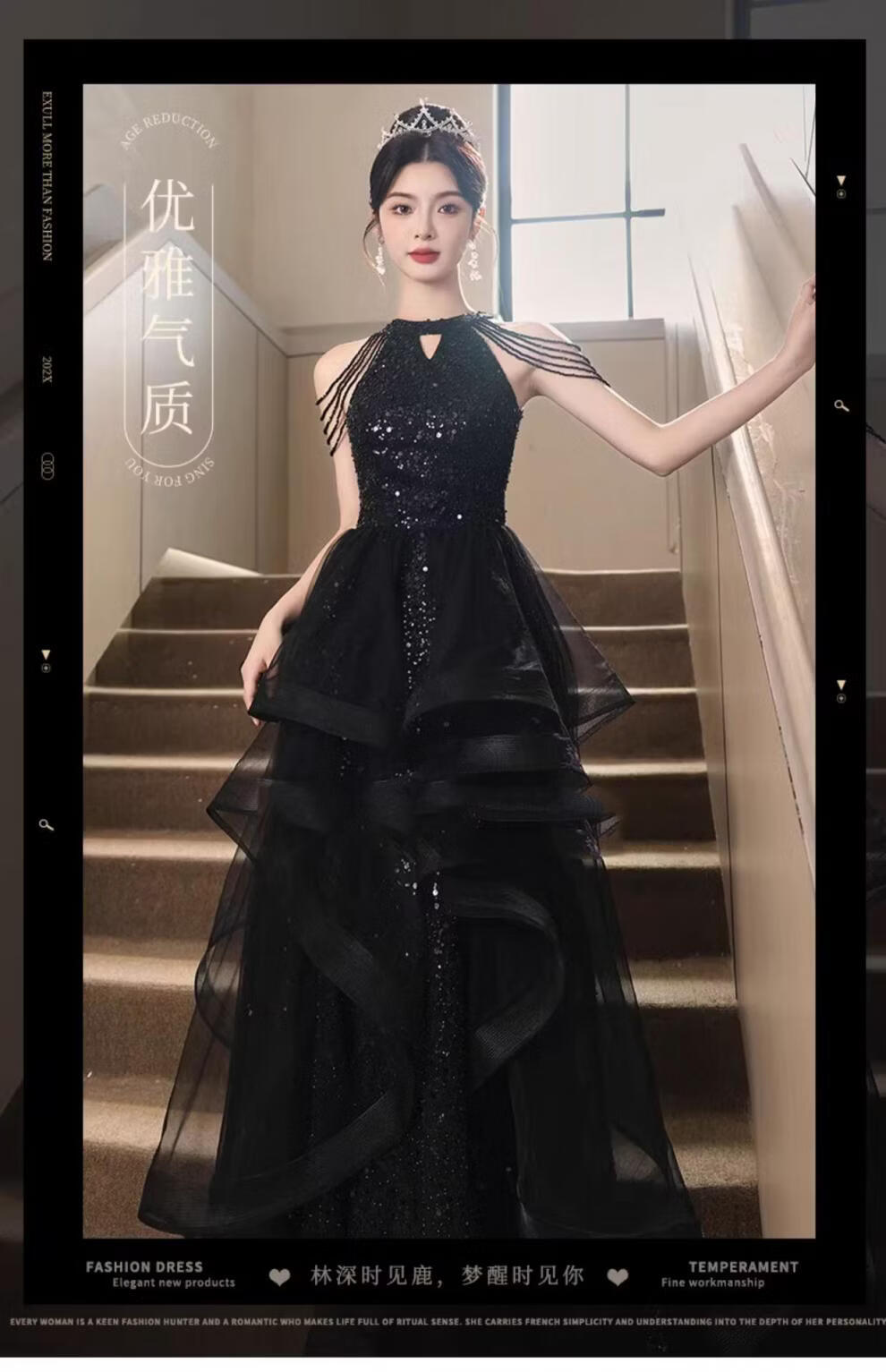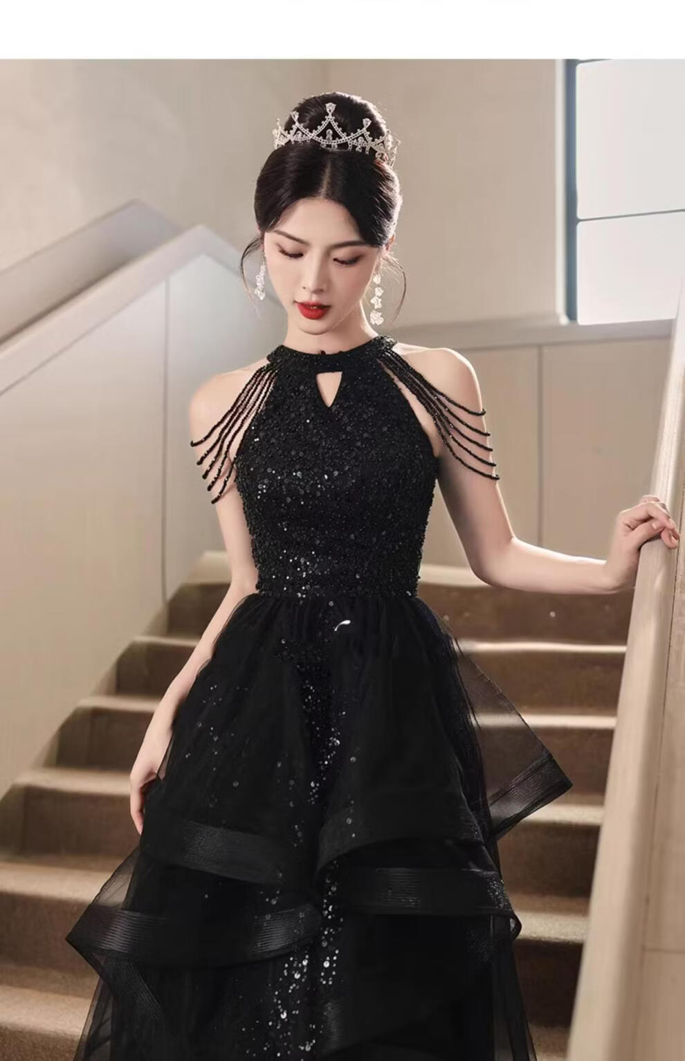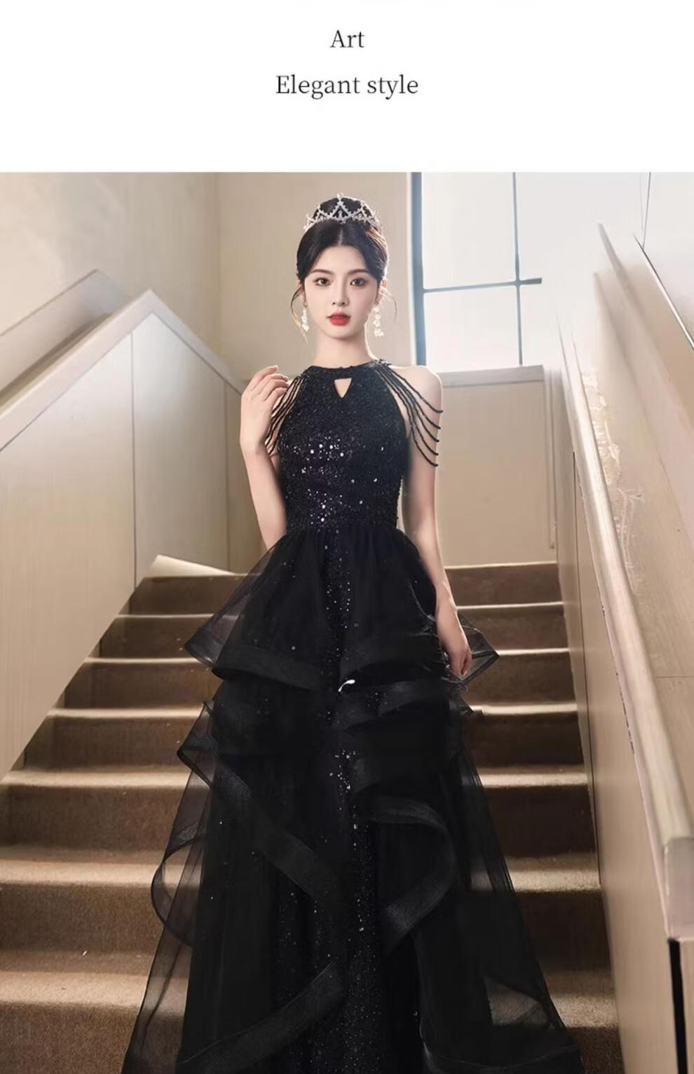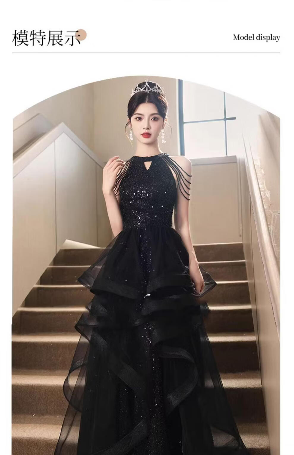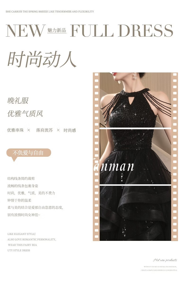 UKUHPK Black Banquet Evening Dress 2026 New Sequined Tassel Puff Skirt Art Exam Annual Meeting Performance Dress Black XL