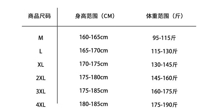 China (cm) 165 / 88-90 170 / 96-98 175 / 108-110 180 / 118-122 185 / 126-130