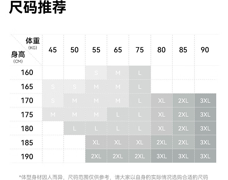 China (cm) 160-165/84-86 165-170 / 88-90 167-172 / 92-96 168-173 / 98-102 170-176 / 106-110