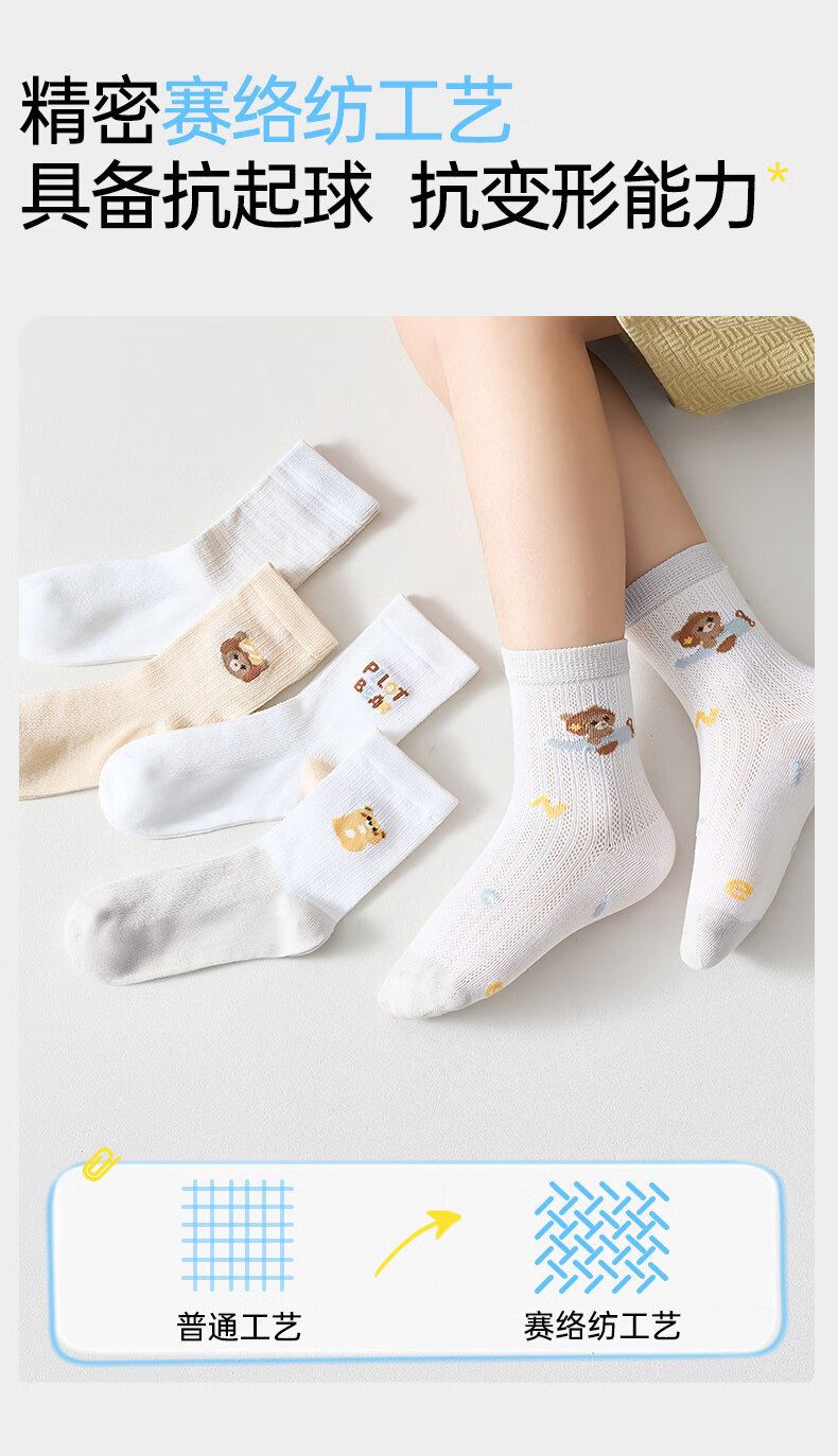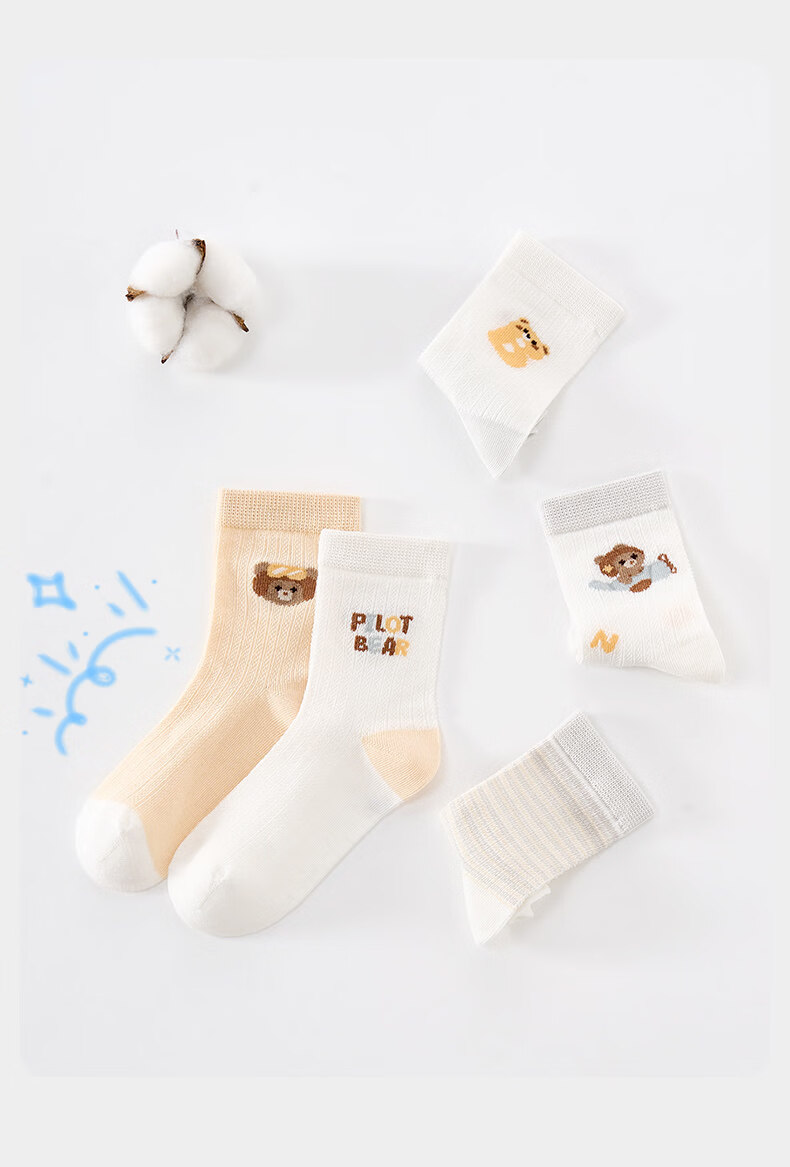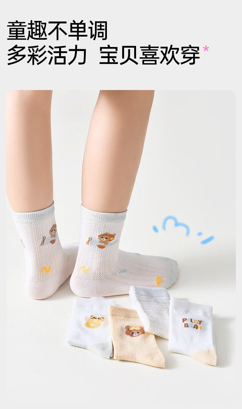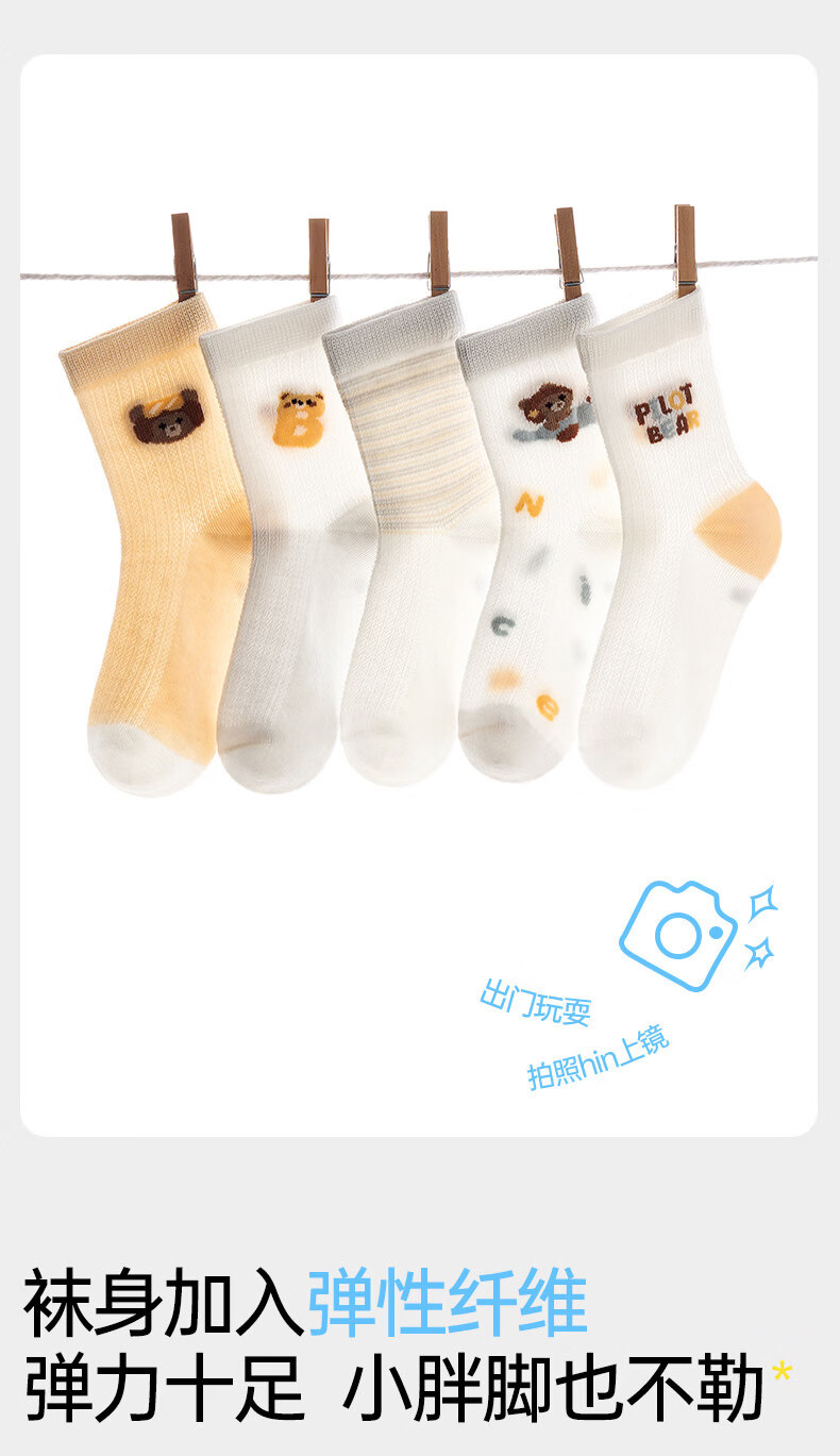 Cotton boys' socks spring and summer thin children's antibacterial boneless breathable cotton socks boys' 100% cotton mid-calf socks skin-friendly 5 pairs ZA102-Soft and Cute Bear-5 pairs 100% cotton breathable mesh socks 3-5 years old - foot length 14-16CM shoe size 20-24