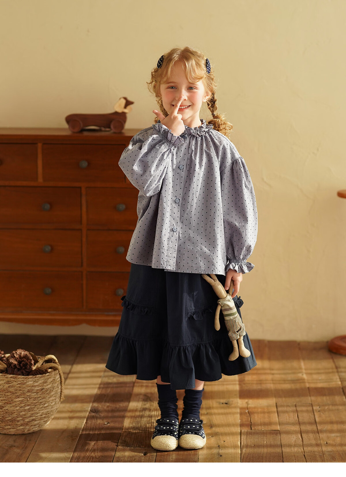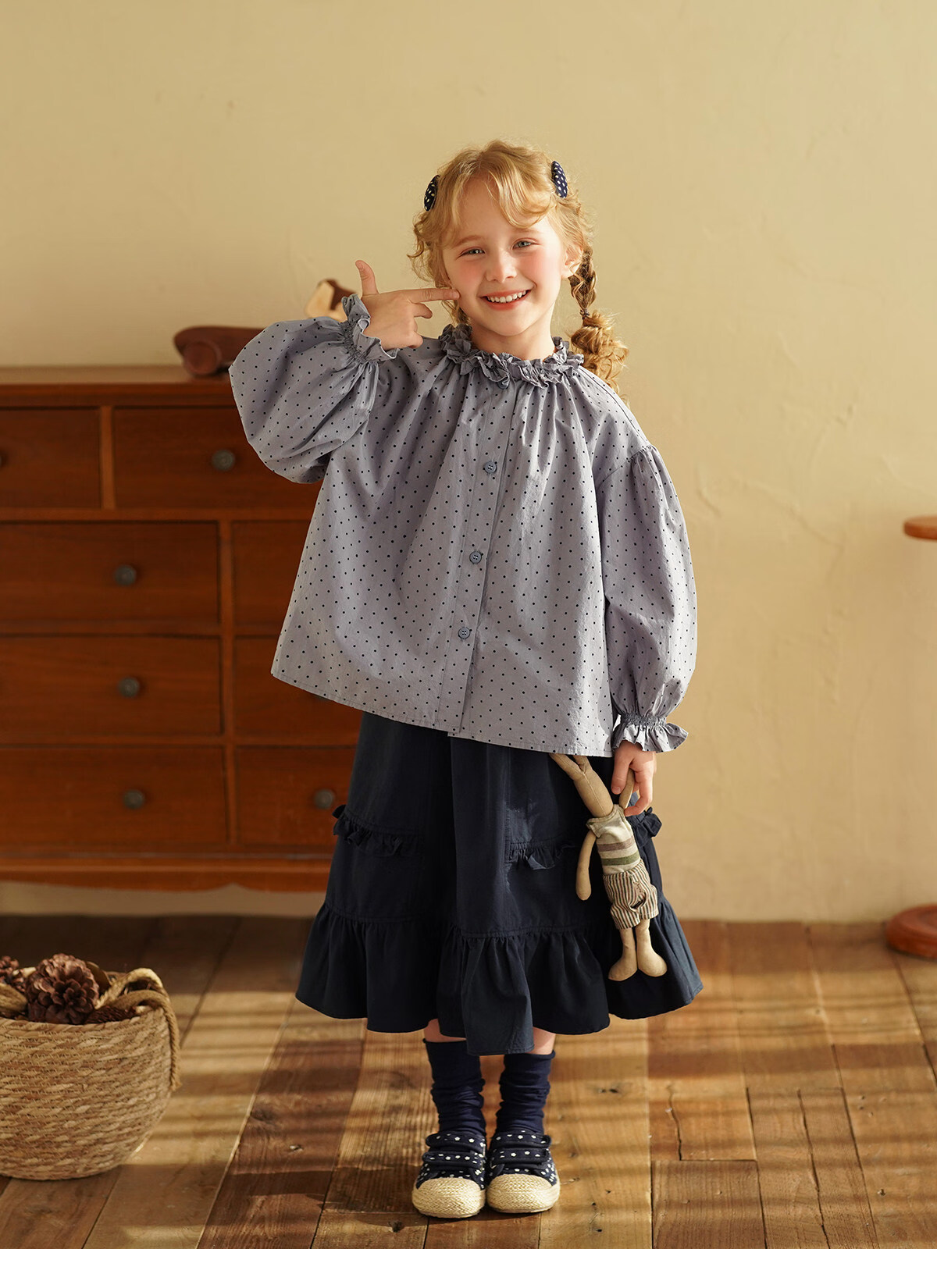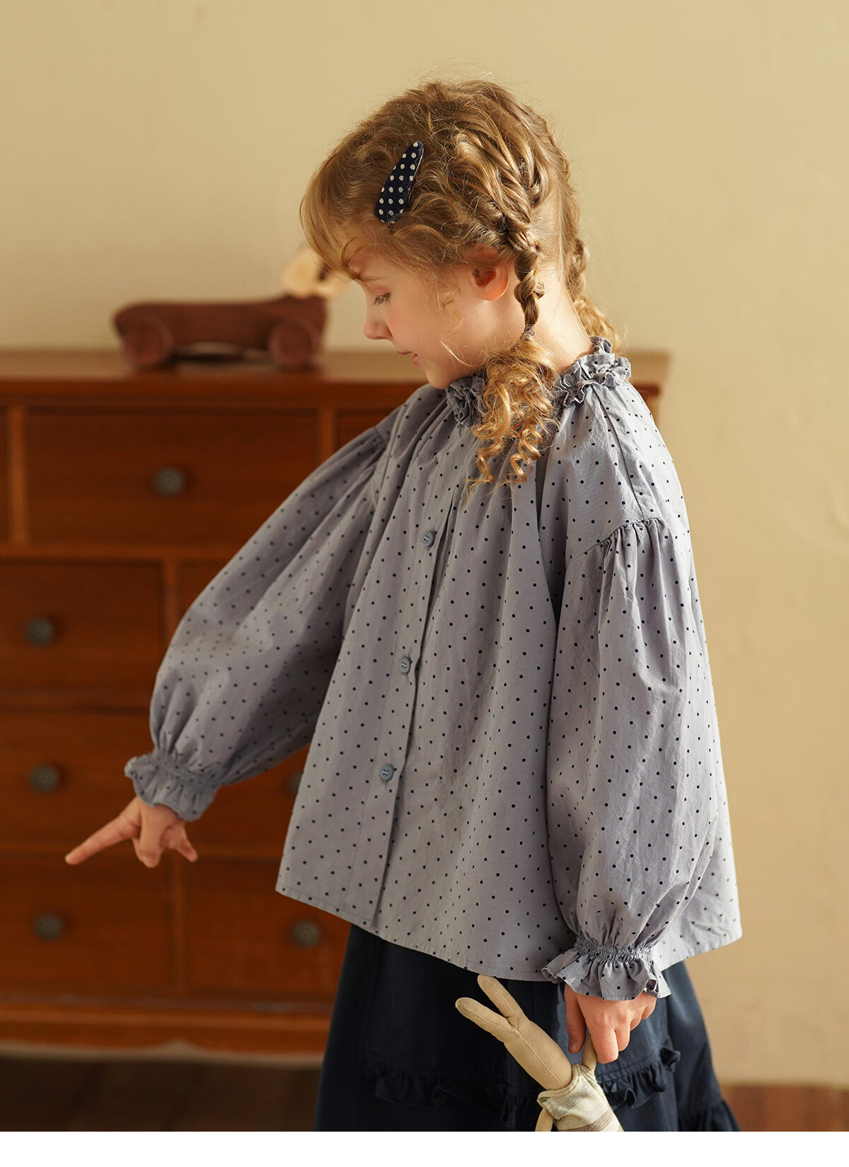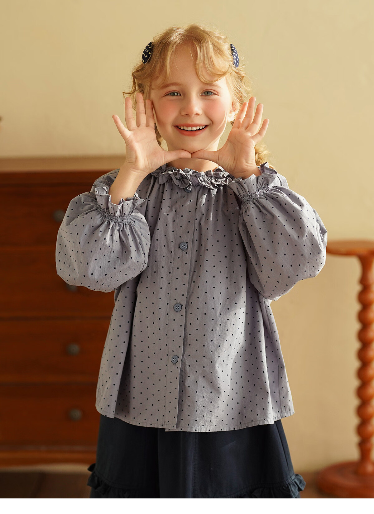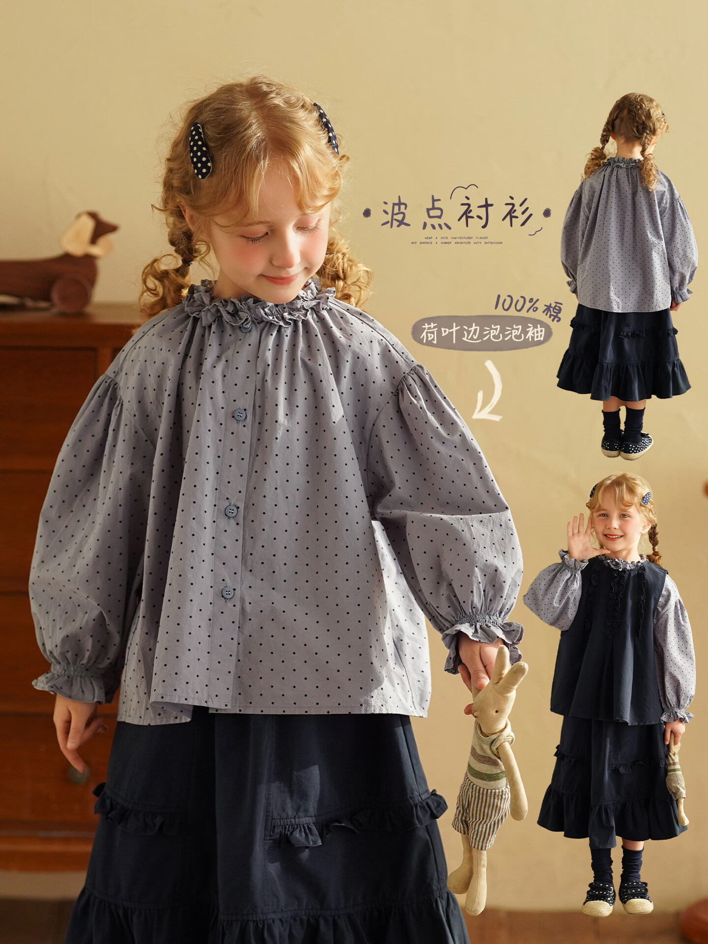 Yantaijia girls pure cotton polka dot lace shirt spring new little girl doll shirt foreign style puff sleeve top haze blue 130
