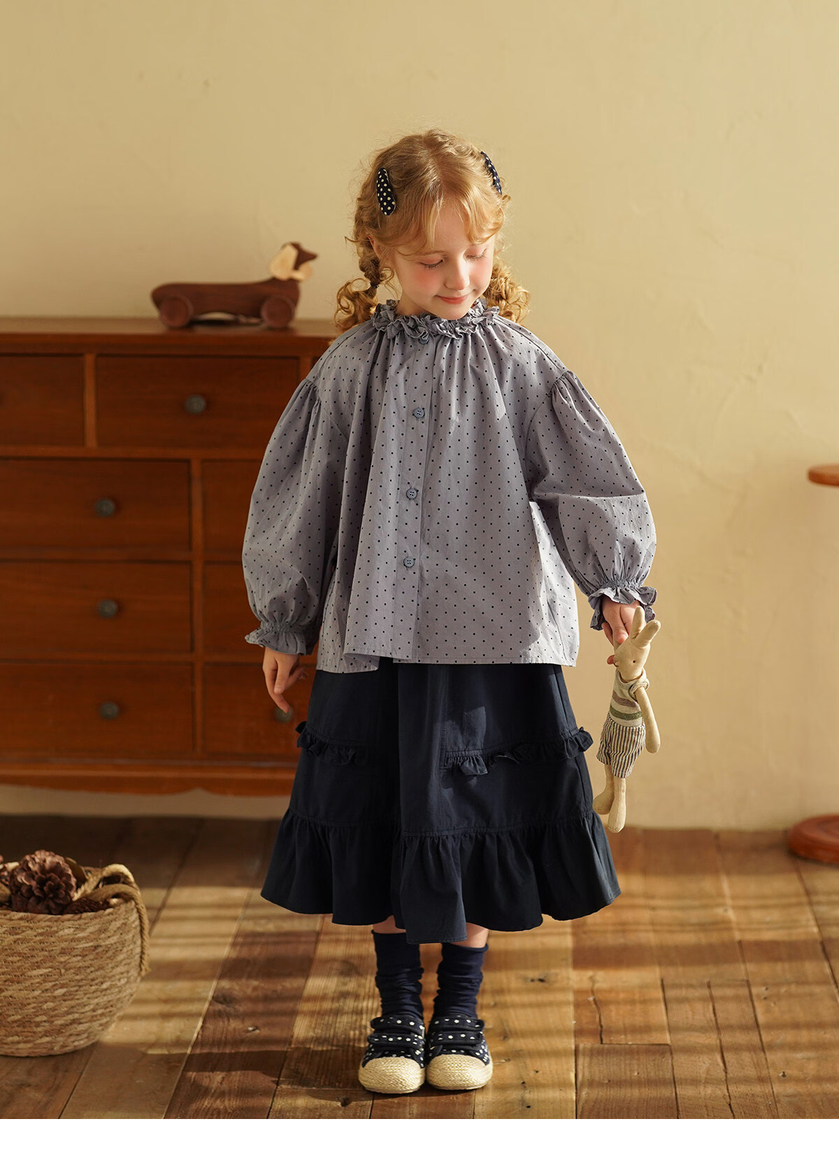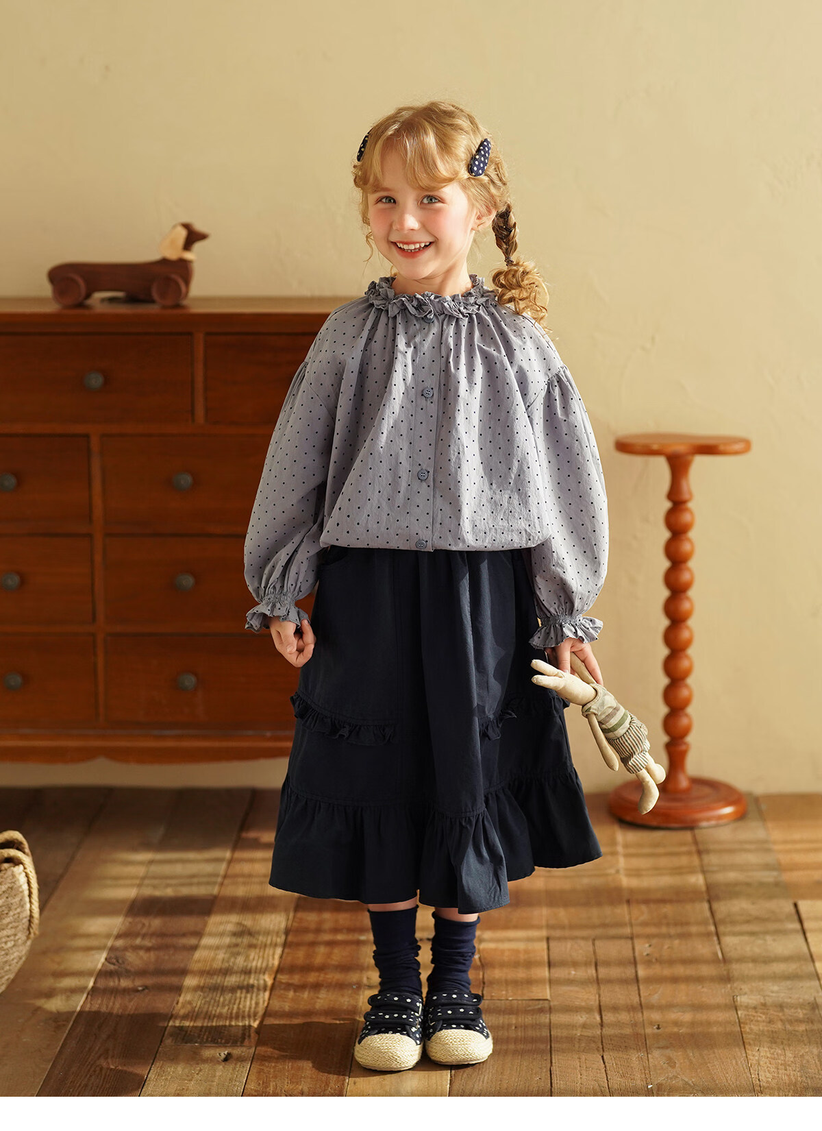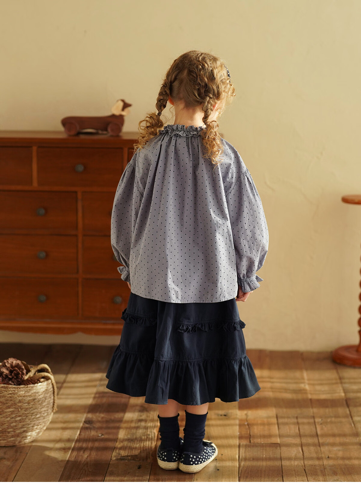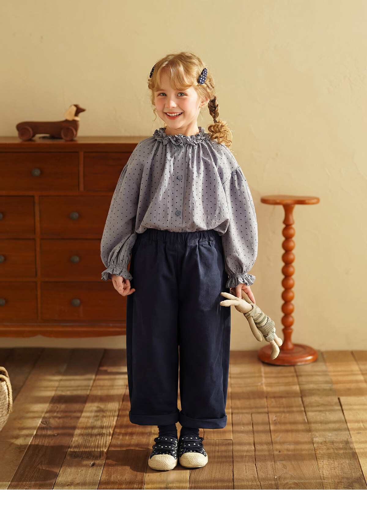 Yantaijia girls pure cotton polka dot lace shirt spring new little girl doll shirt foreign style puff sleeve top haze blue 130