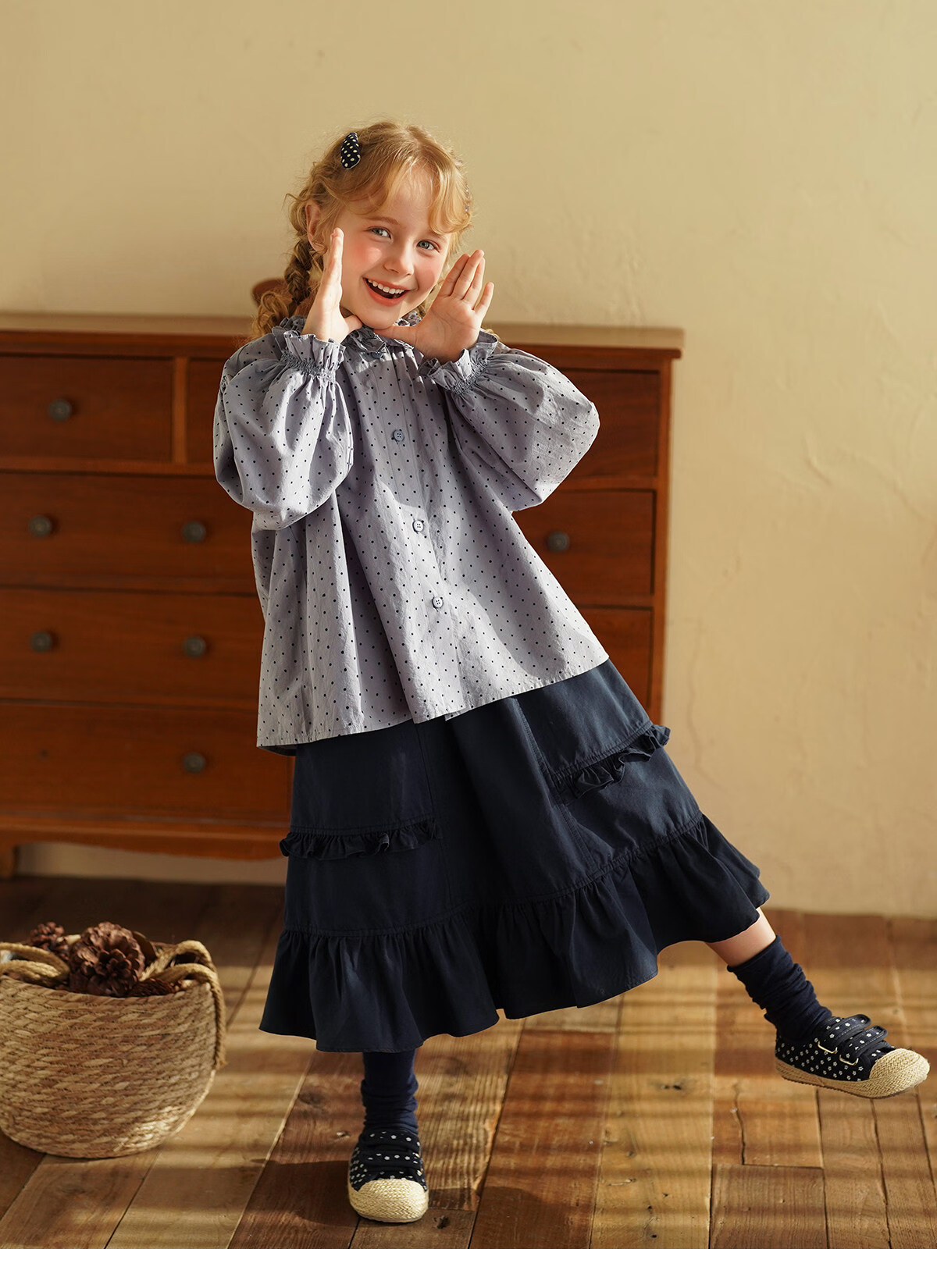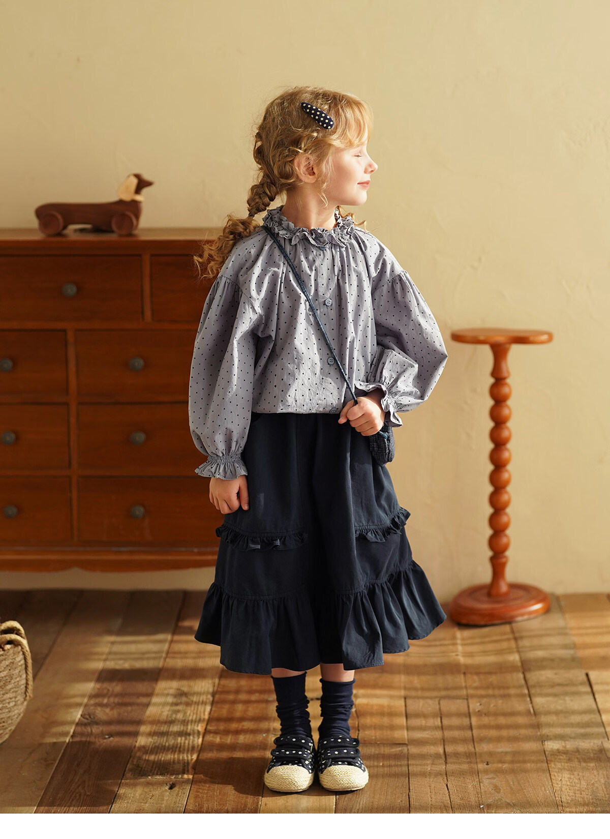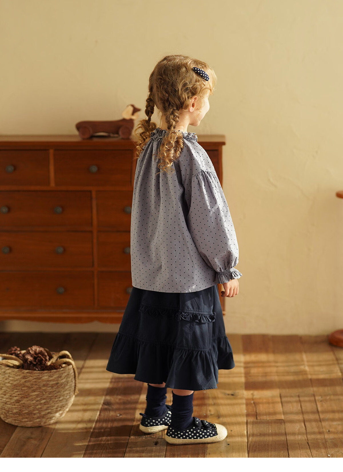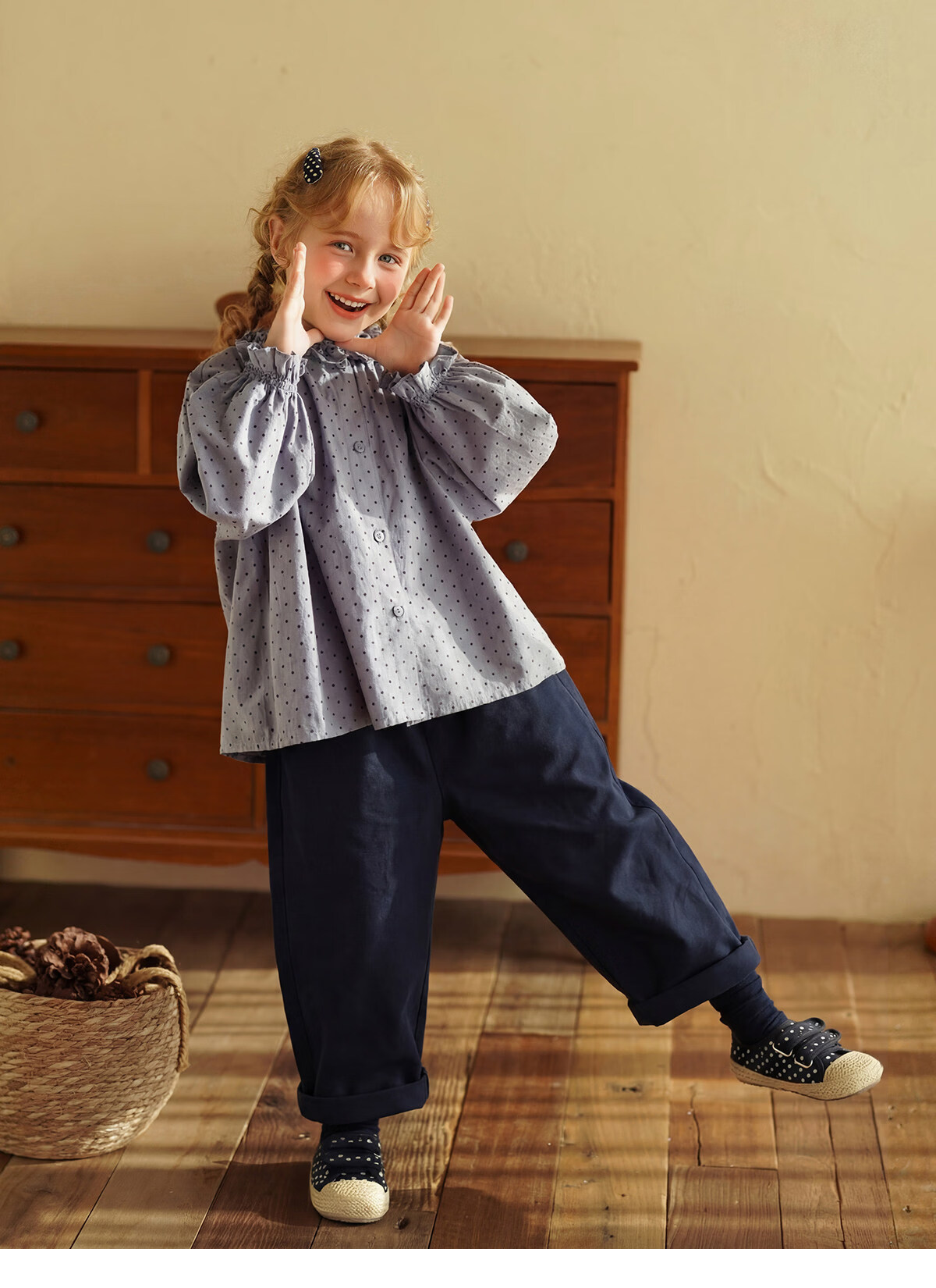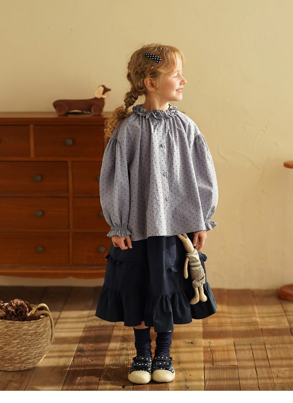 Yantaijia girls pure cotton polka dot lace shirt spring new little girl doll shirt foreign style puff sleeve top haze blue 130
