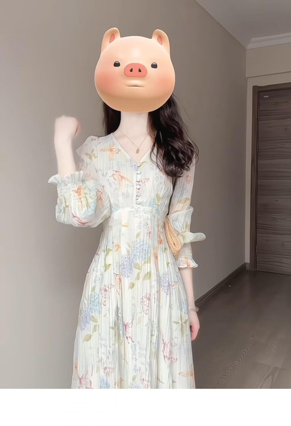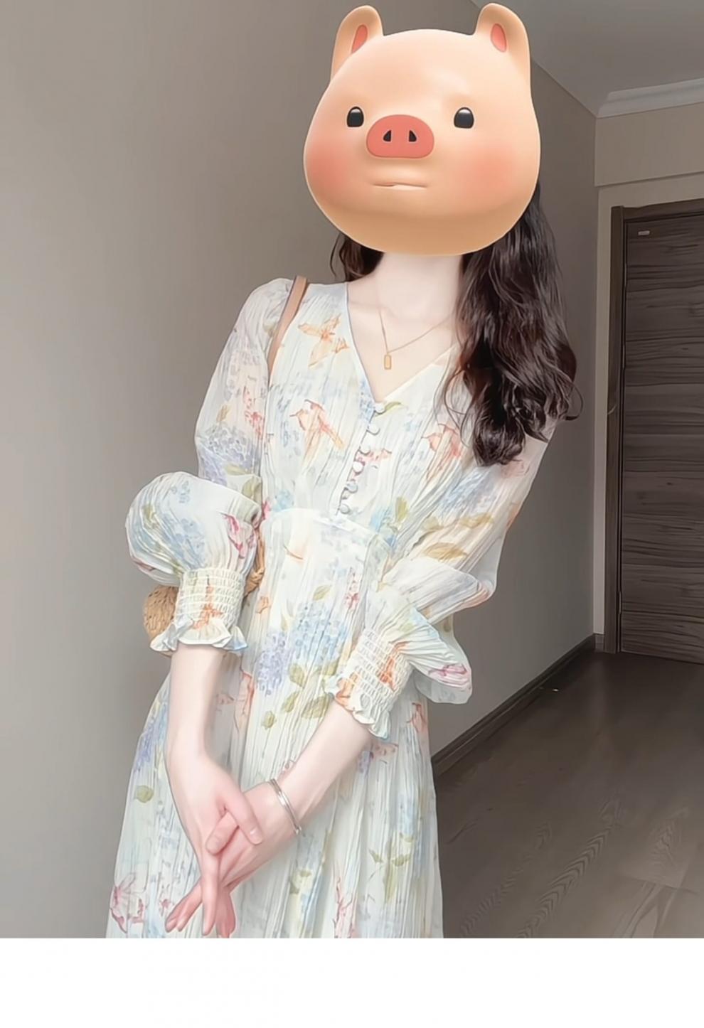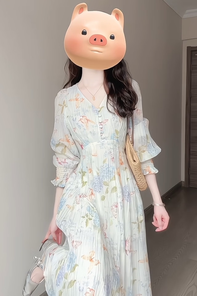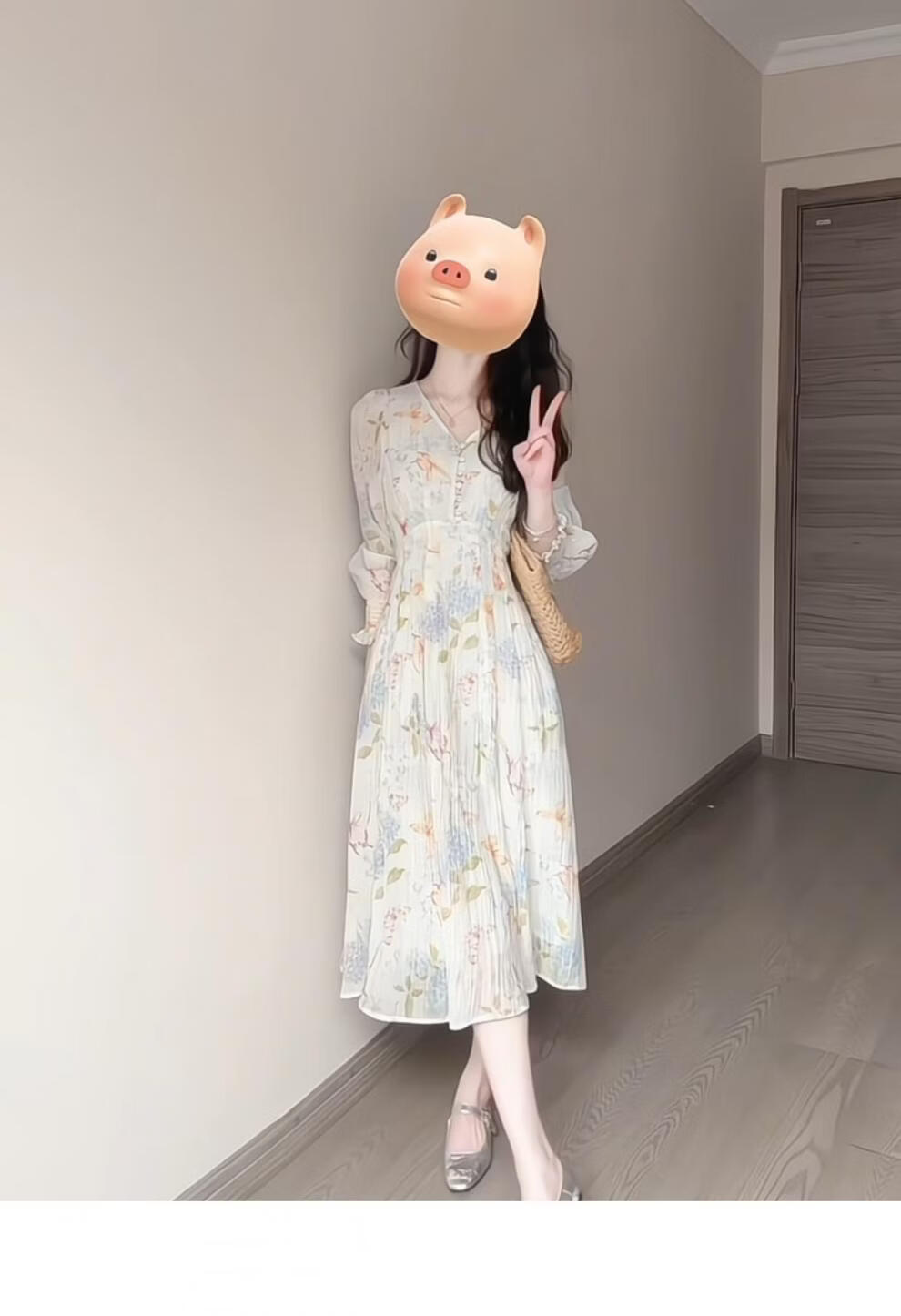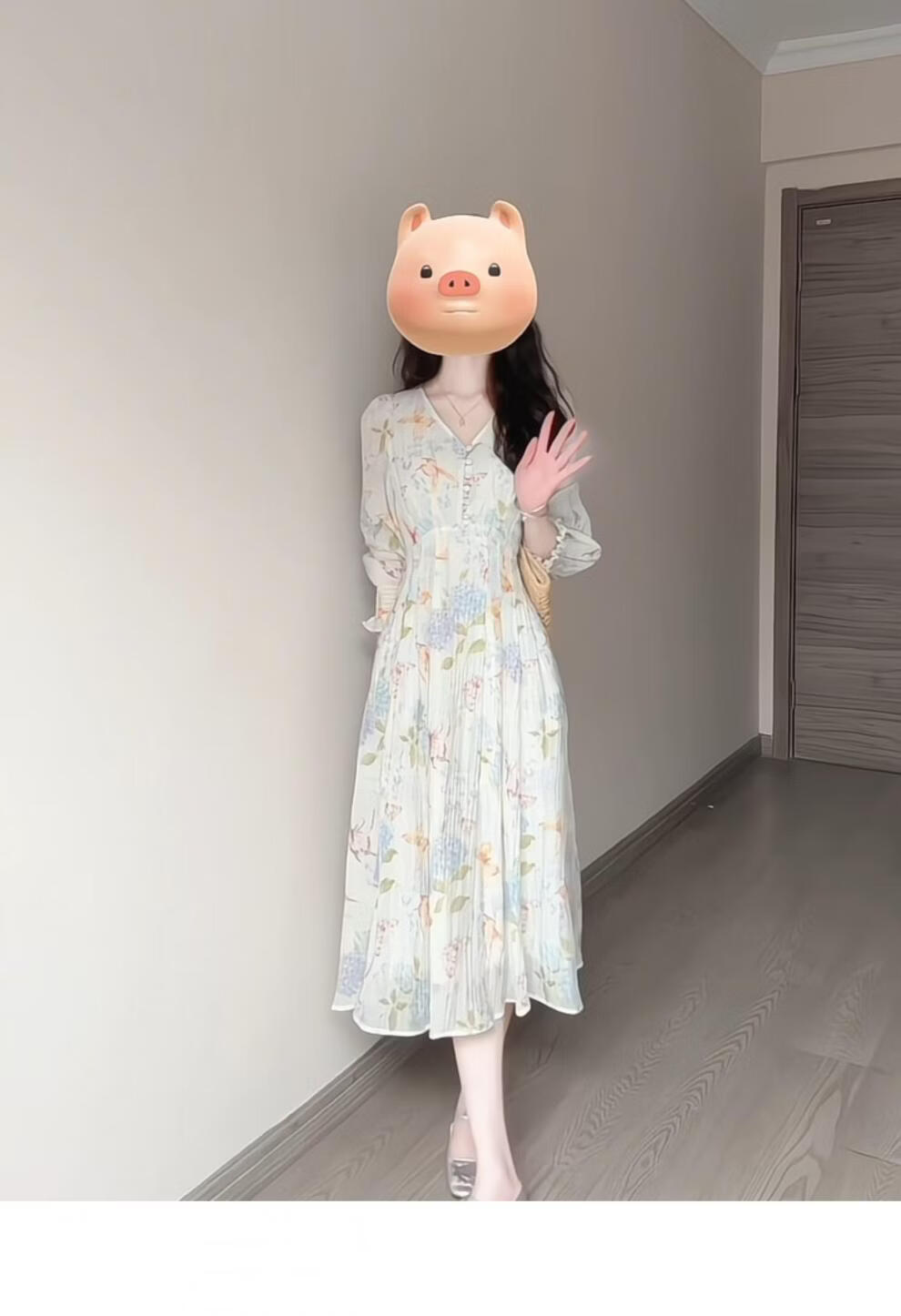 Rich collar opening ceremony mom dress spring French tea break V-neck floral women's new 2026 long sleeve petite waist mint print heavy floral dress XL recommended 120 to 125 Jin Jin equals 0.5 kg