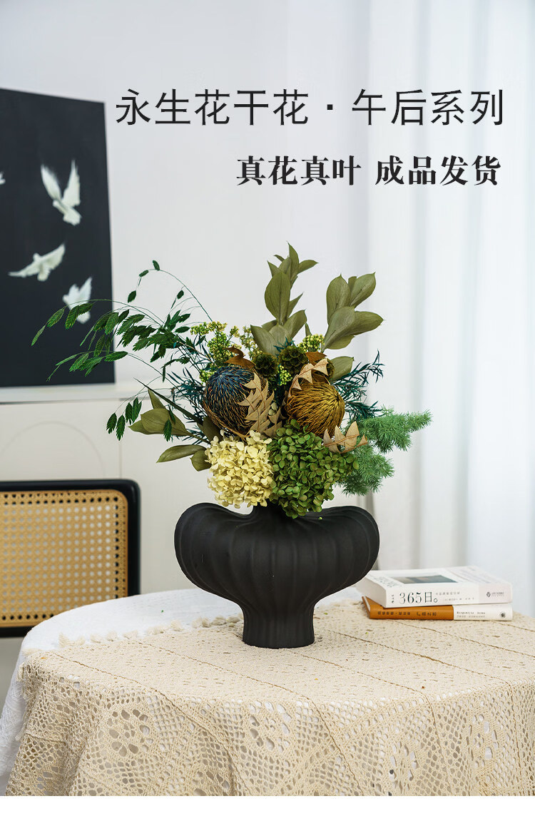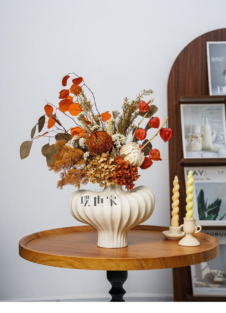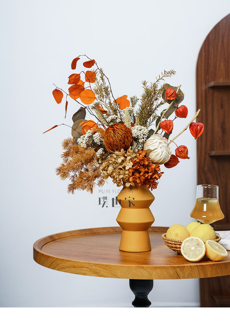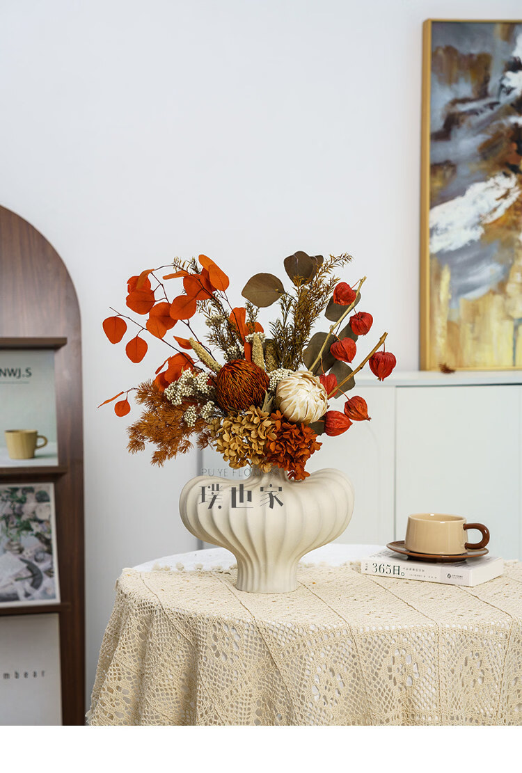 Ramo de flores secas inmortalizadas de alta gama, flores y hojas reales, decoración suave para el hogar, decoración floral, exhibición de tienda, ramo de la tarde C + jarrón naranja Morandi