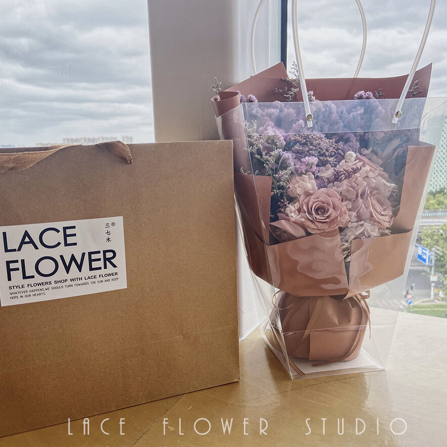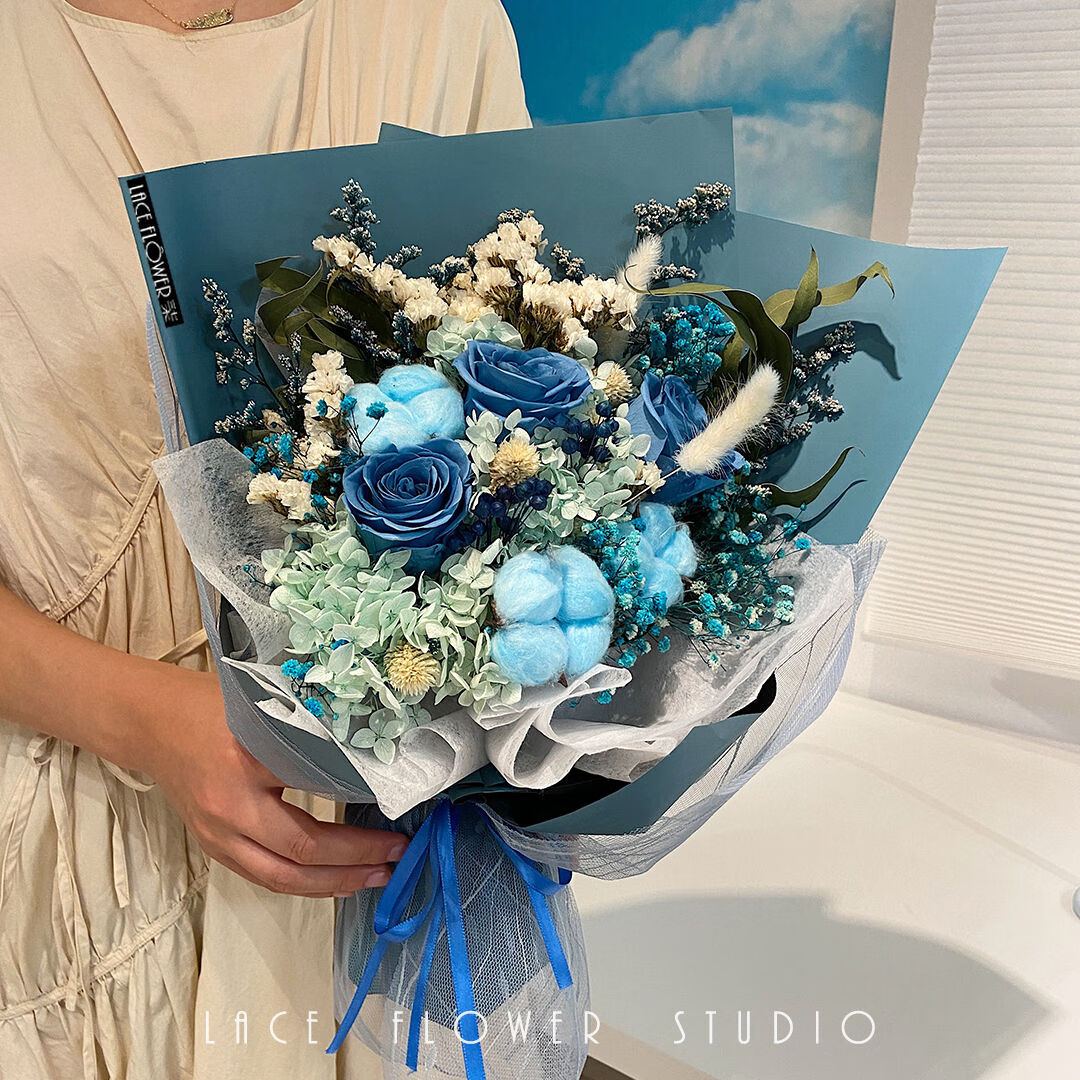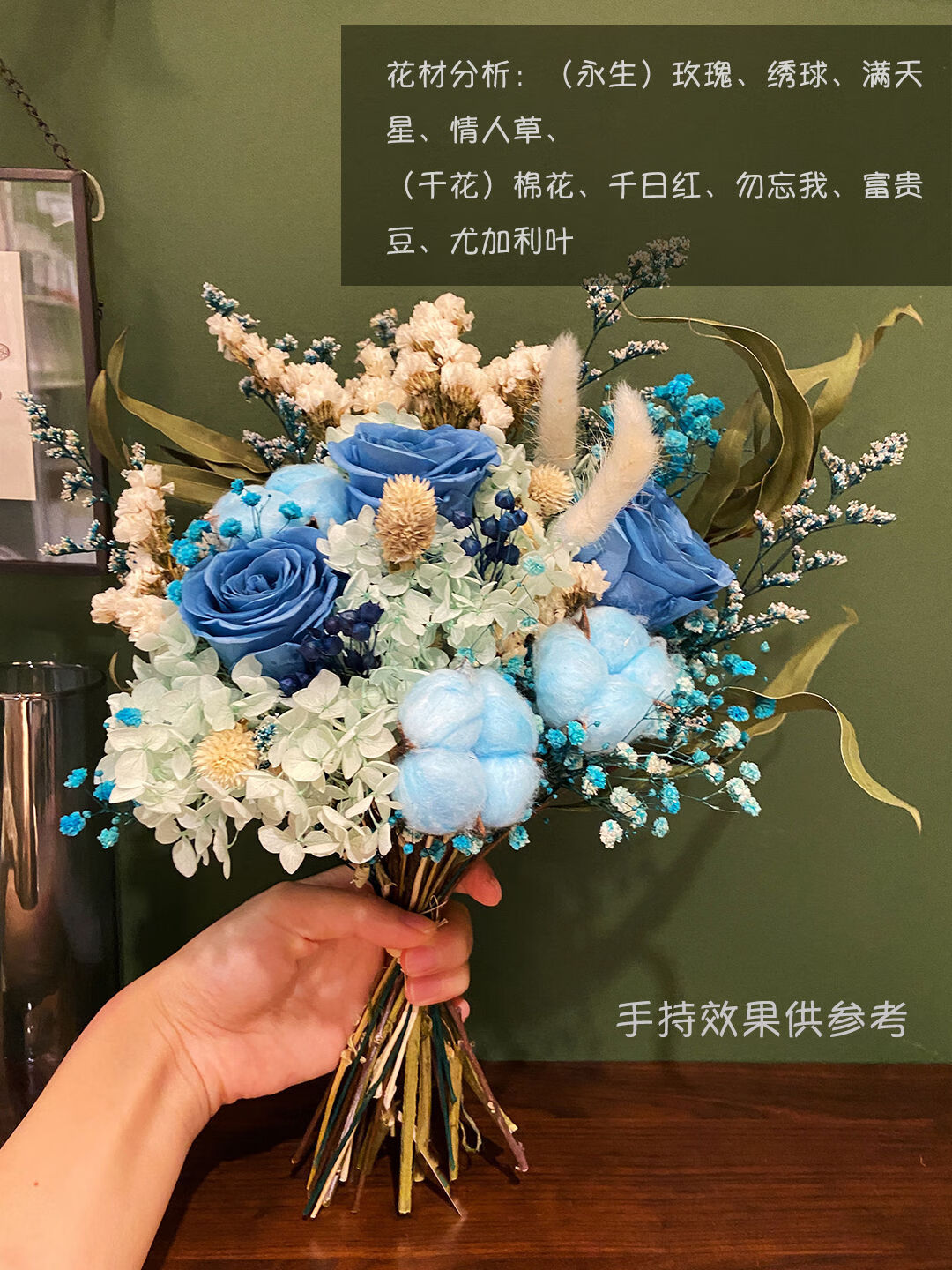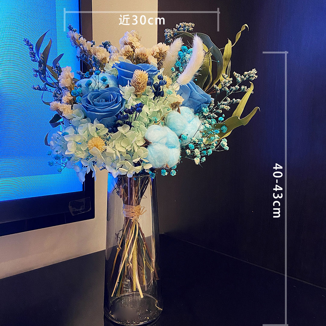Korean style pink rose everlasting flower dried flower bouquet for bestie’s birthday gift Mother’s Day gift box for girlfriend Shanghai Pink rose elegant blue color matching upgraded version large hand holding nearly 60cm tall