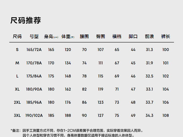 China (cm) 160-165/84-86 165-170 / 88-90 167-172 / 92-96 168-173 / 98-102 170-176 / 106-110