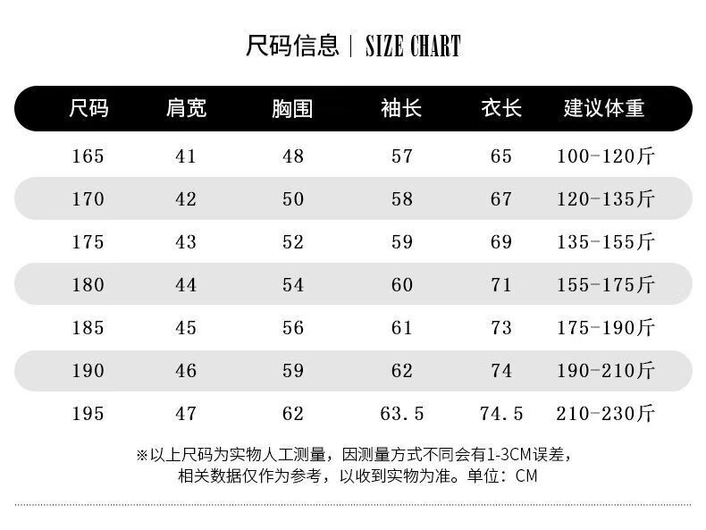 China (cm) 165 / 88-90 170 / 96-98 175 / 108-110 180 / 118-122 185 / 126-130