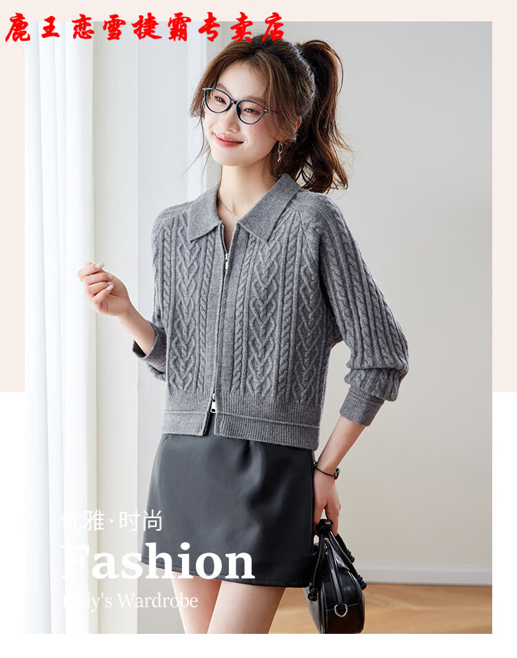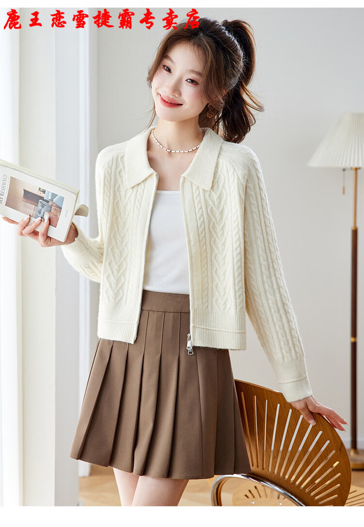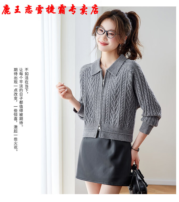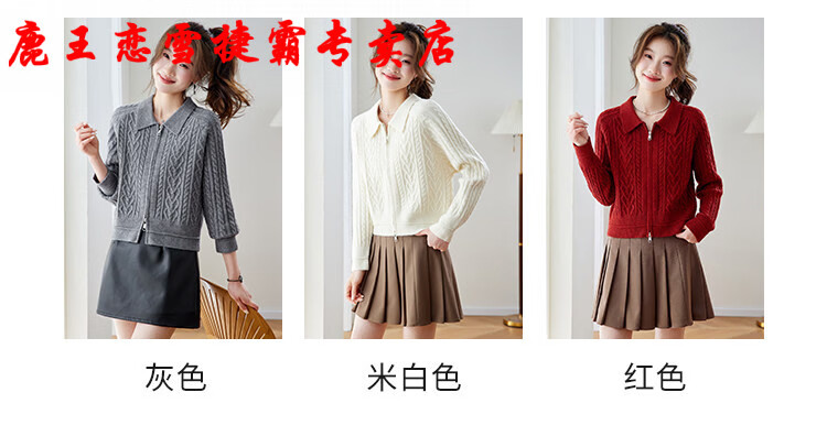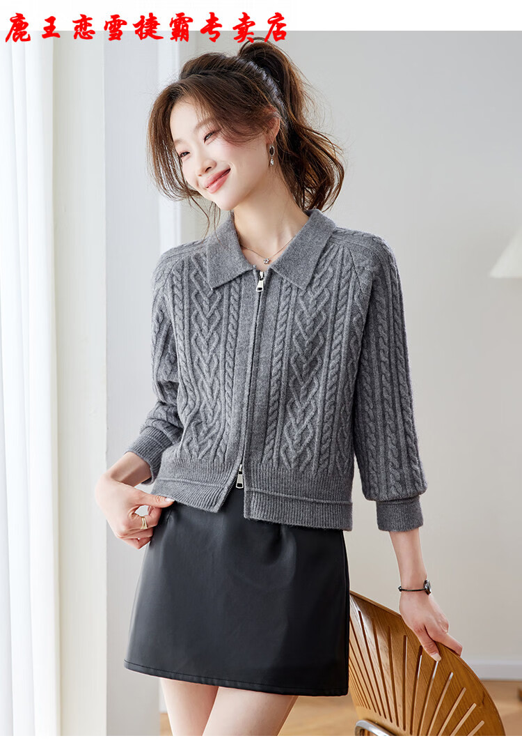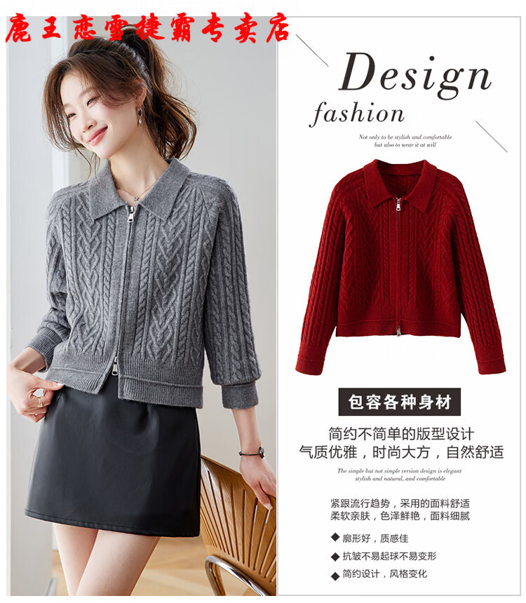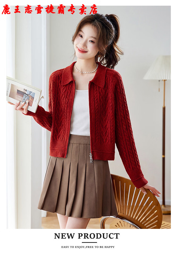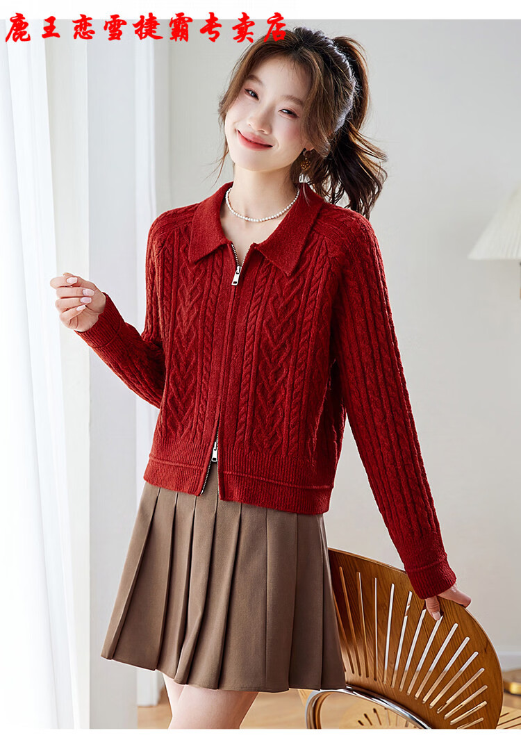 Lu Wang Lian Xue Qing Mature Simple Style Lapel Zipper Cable Knitted Cardigan Women's 2026 Spring New Short Short Sweater Jacket Red M 90-100Jin Jin is equal to 0.5 kg