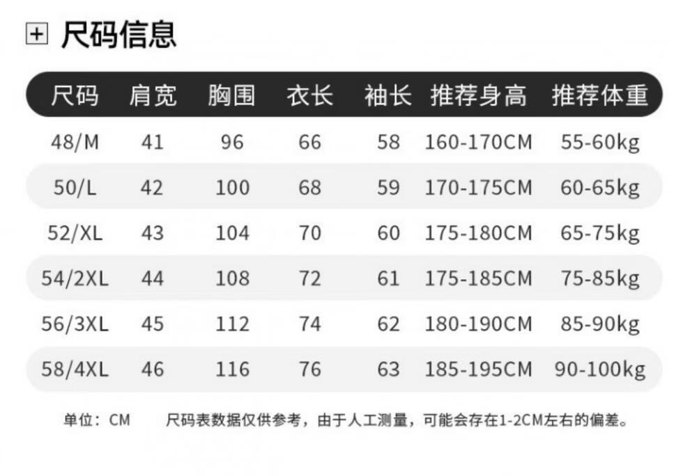 China (cm) 160-165/84-86 165-170 / 88-90 167-172 / 92-96 168-173 / 98-102 170-176 / 106-110