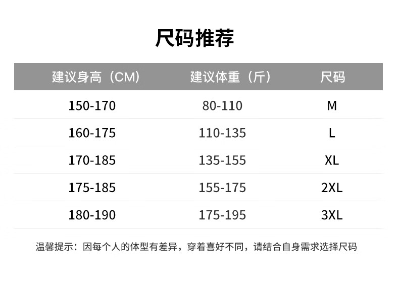 China (cm) 165 / 88-90 170 / 96-98 175 / 108-110 180 / 118-122 185 / 126-130