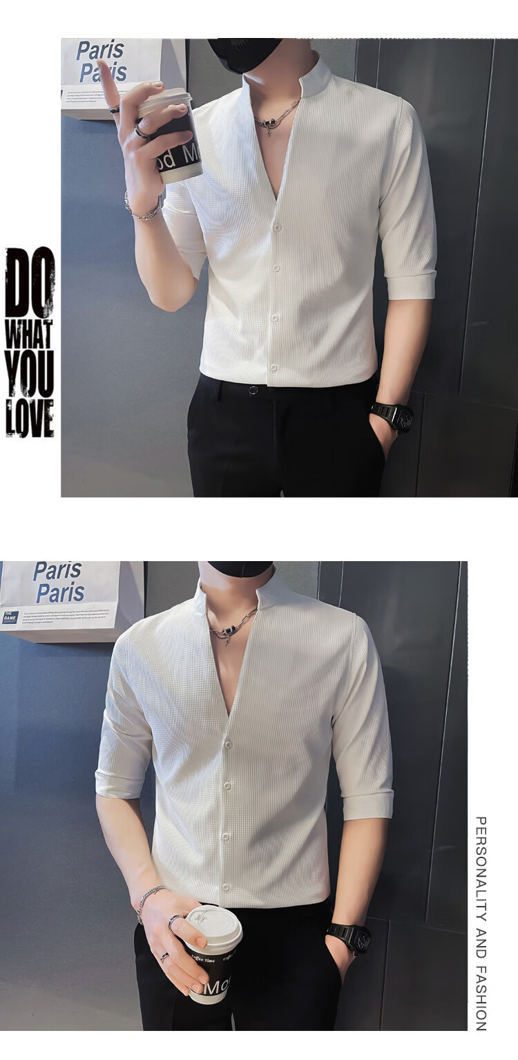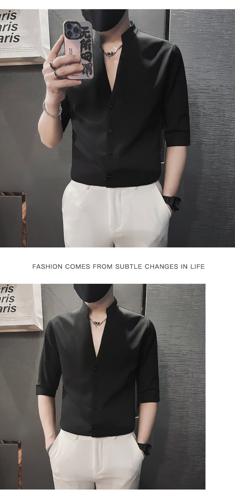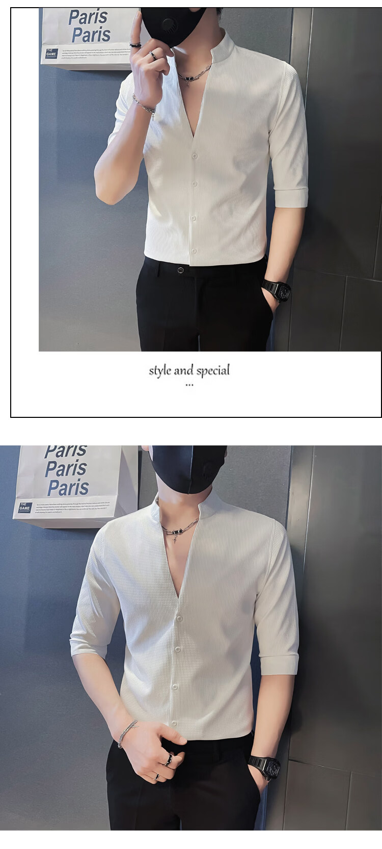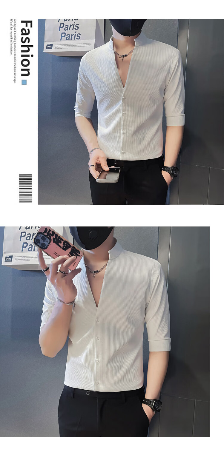 ROMON summer V-neck shirt men's short-sleeved trendy half-sleeved shirt 2026 new design trendy brand stand-up collar mid-sleeve men's clothing white XL recommended (125-135Jin Jin equals 0.5 kg)